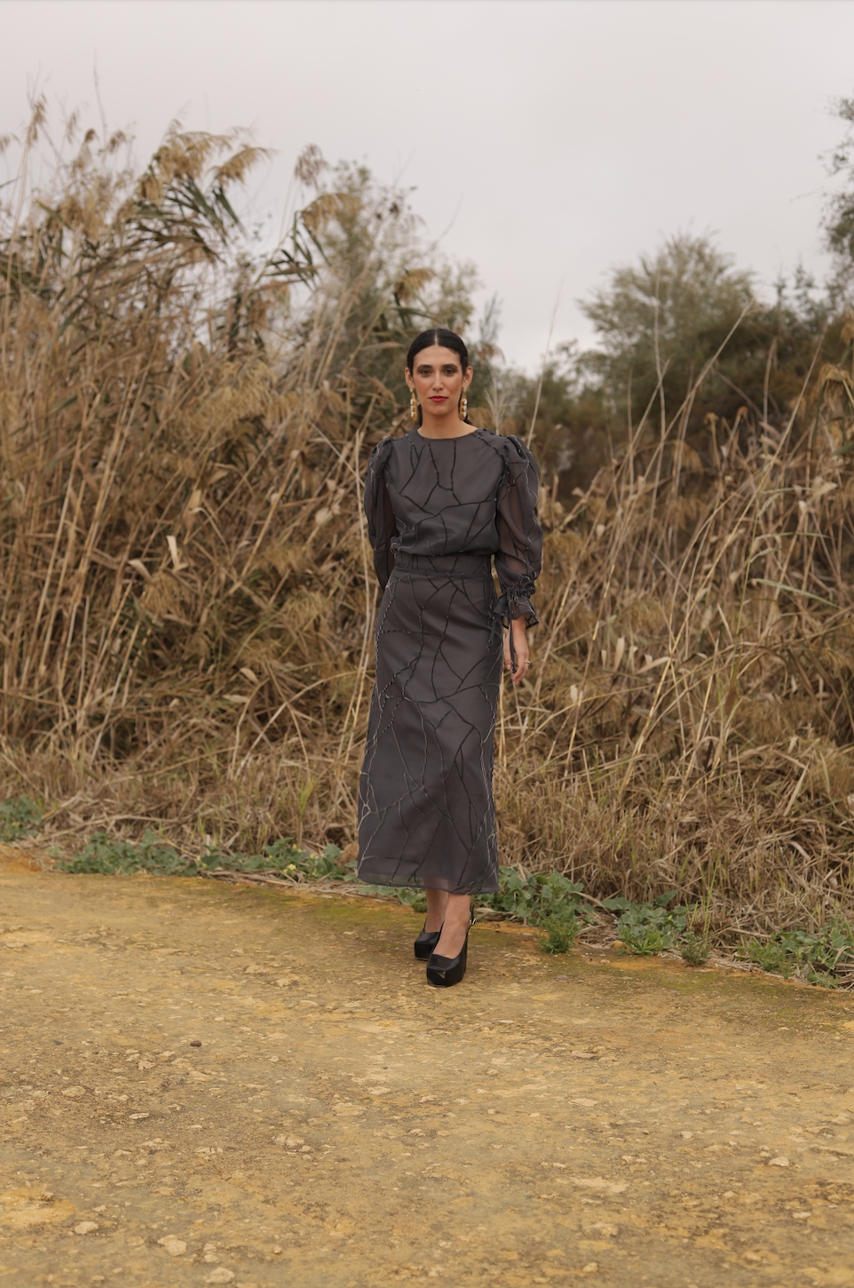 Chiffon blouse with grayish-blue velvet ribbons. The semi-transparent puffed sleeves are adjustable at the cuffs with tape. Button detail on the left shoulder. Back button closure.