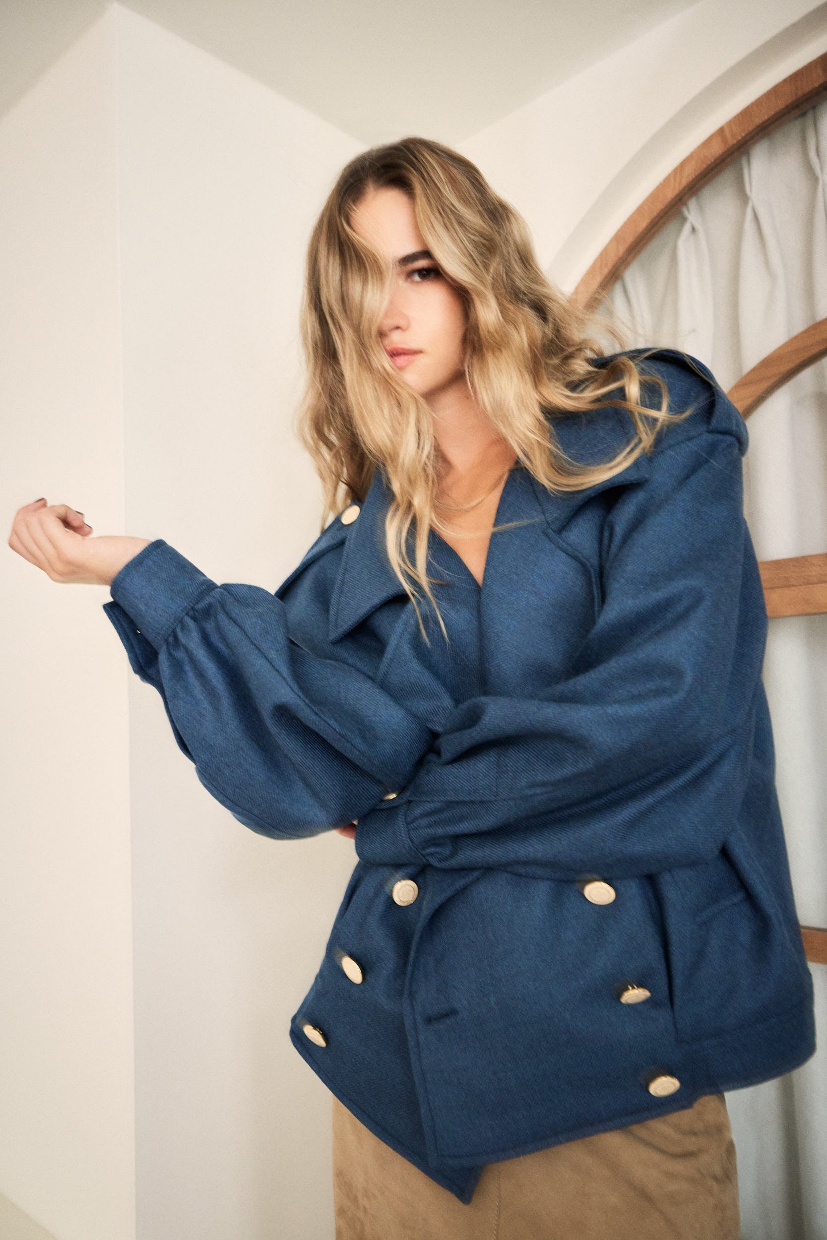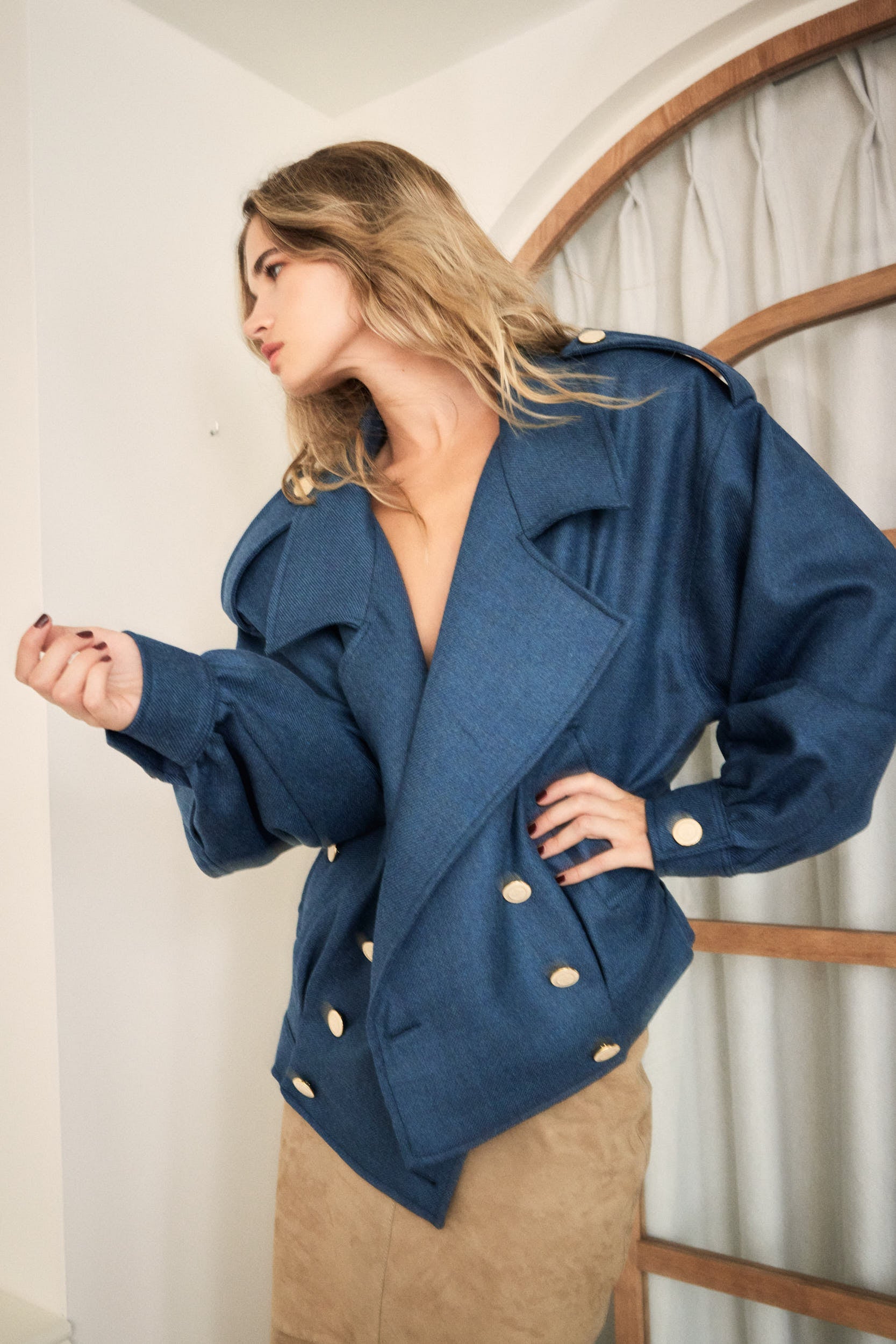 100% wool jacket with an eighties design, oversized fit, shoulder pads, lapels, and two side pockets. Sustainably made in Spain.