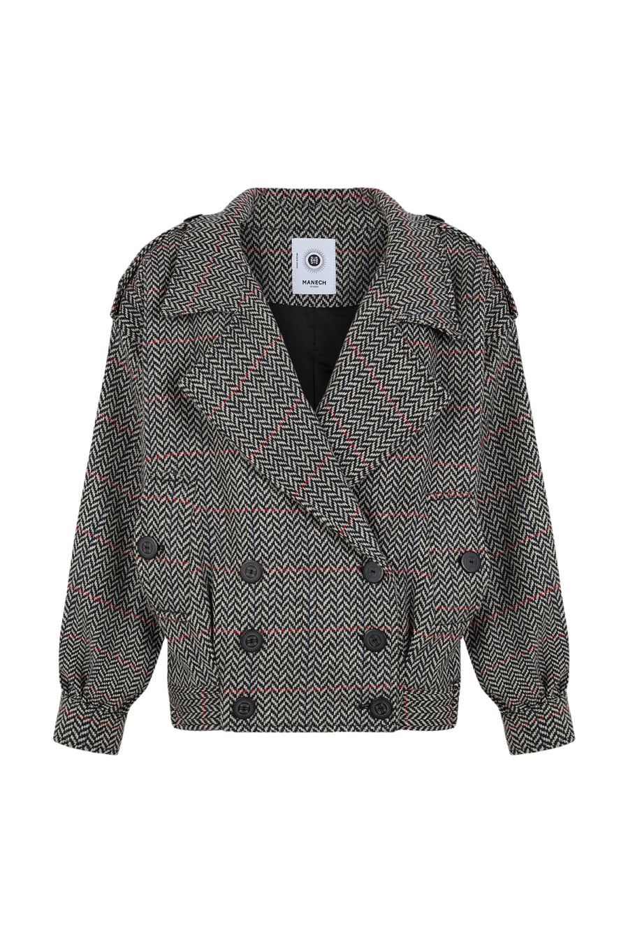 Printed wool fabric in a black and white herringbone pattern with burgundy and blue stripes combined with black lining.