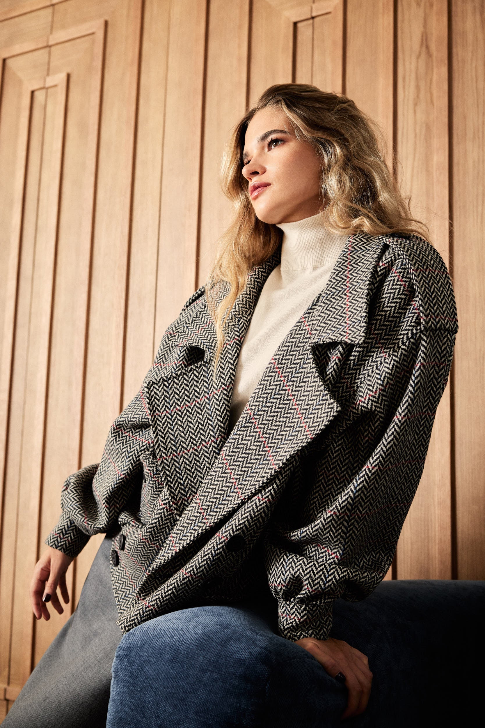 100% wool jacket with an eighties design, oversized fit, shoulder pads, lapels, and two side pockets. Sustainably made in Spain.
