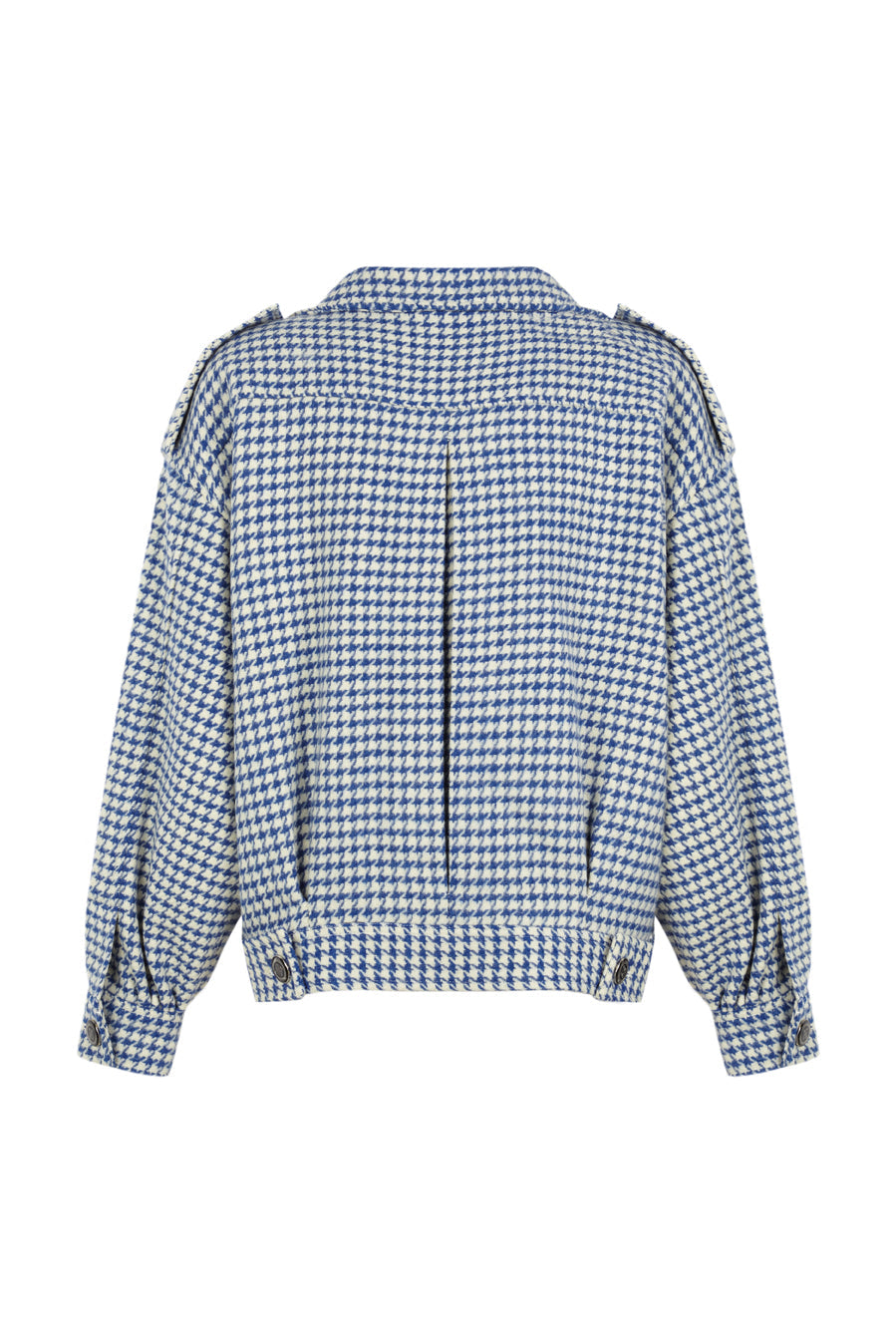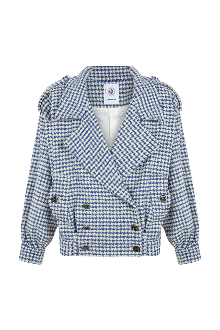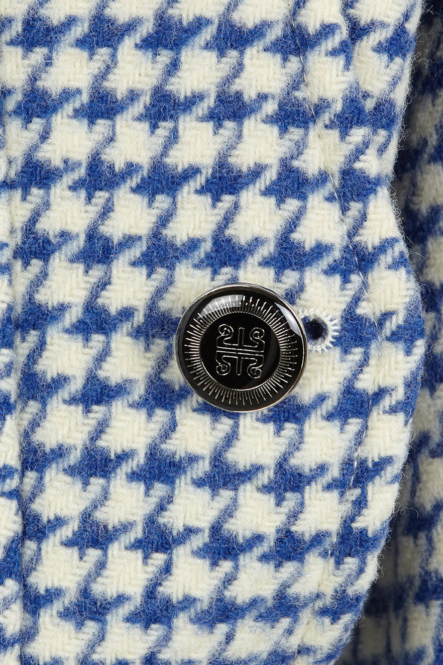 Wool fabric with a blue and white houndstooth print combined with ecru lining.