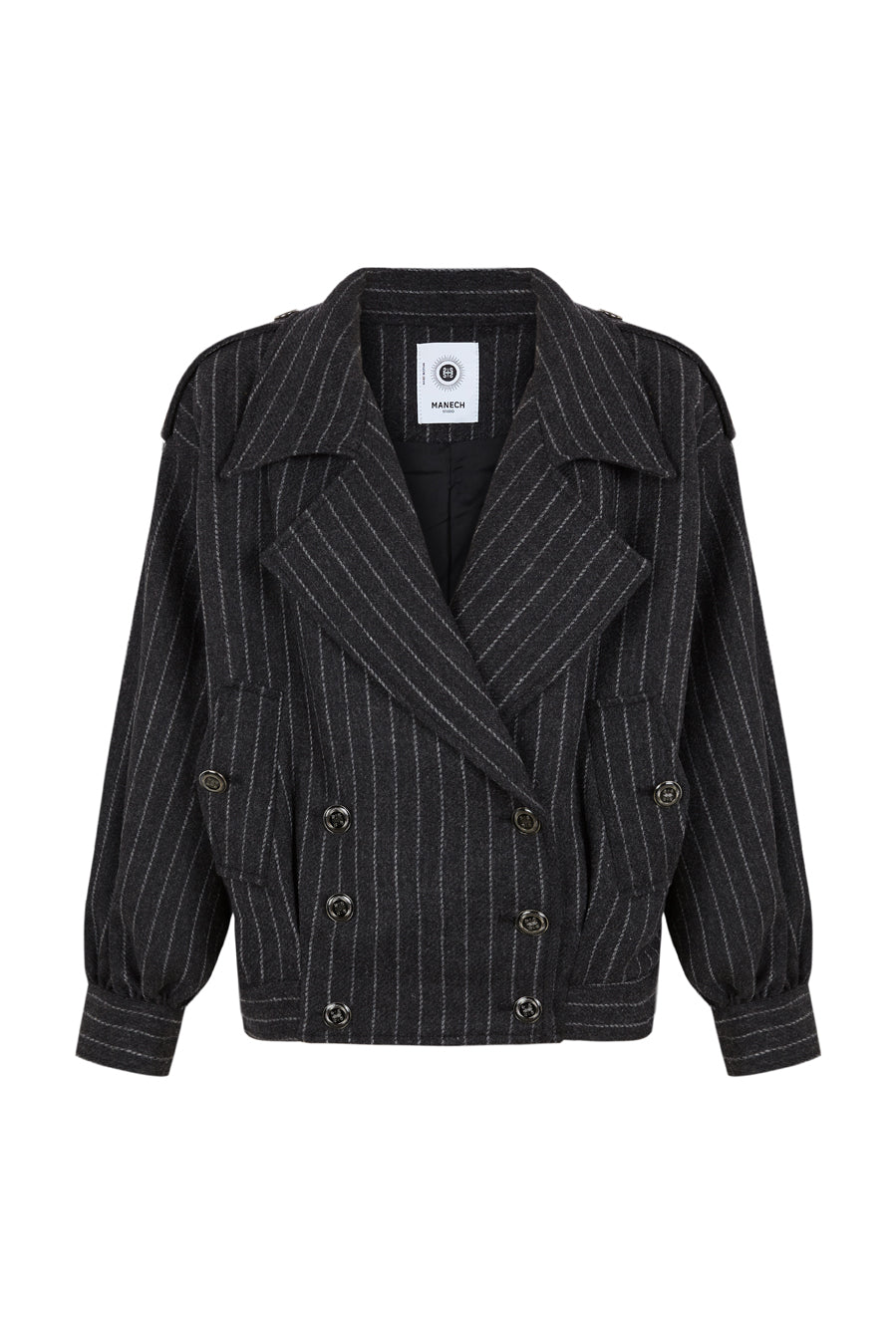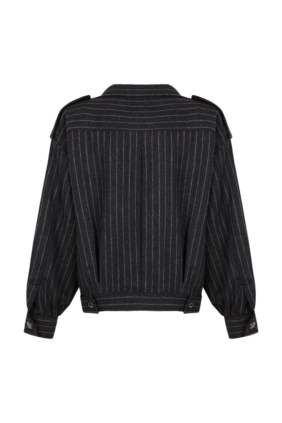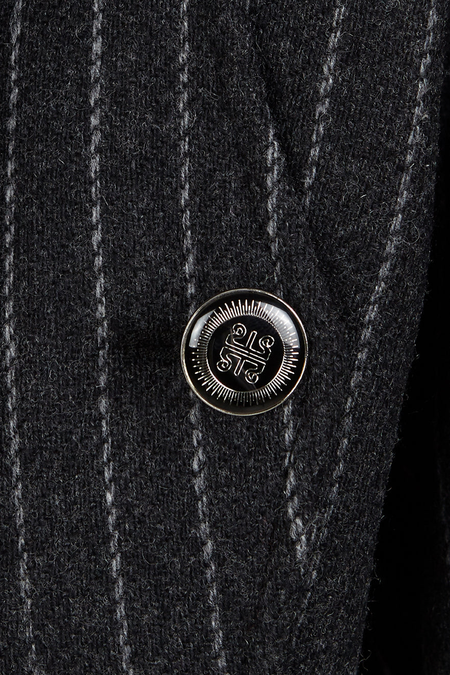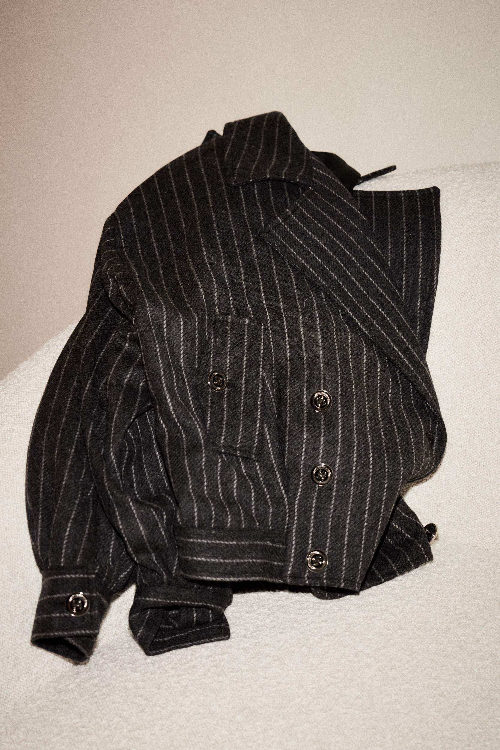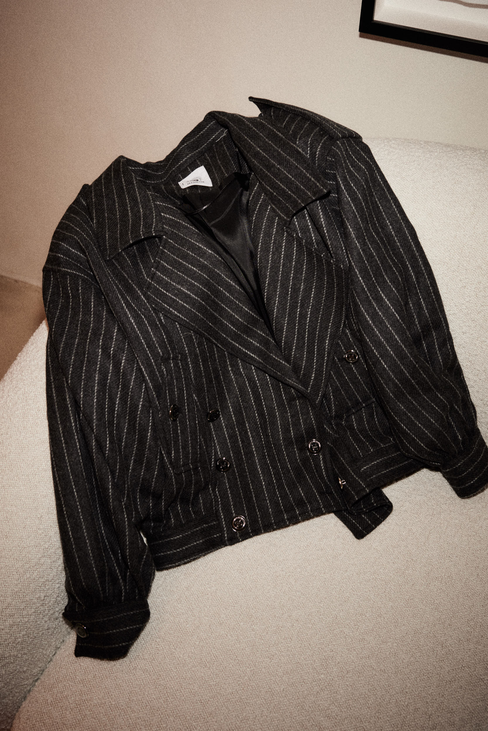 Charcoal gray wool fabric with a pinstripe print combined with a tonal lining.