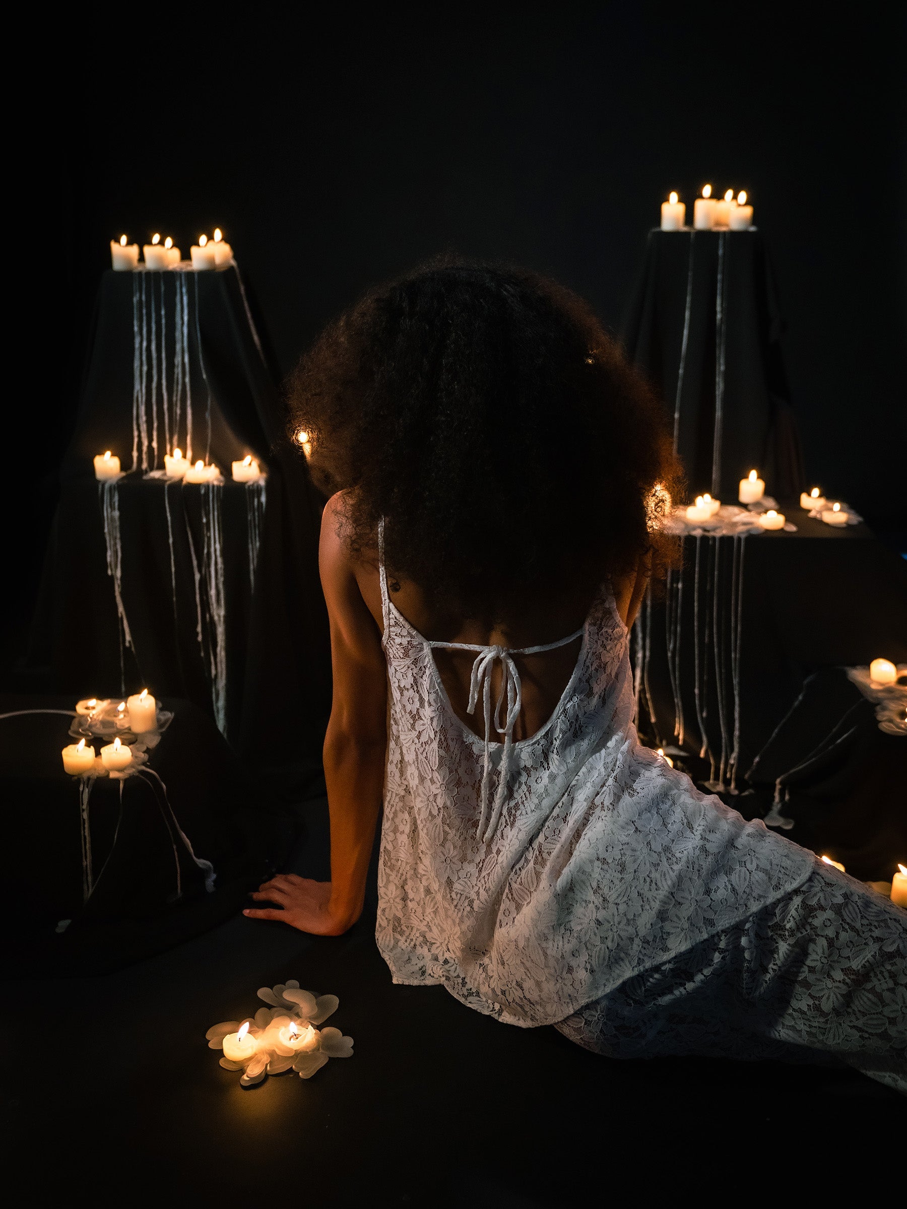 Top largo de encaje blanco con escote recto y tirantes. Abertura trasera con detalle de lazada decorativa.