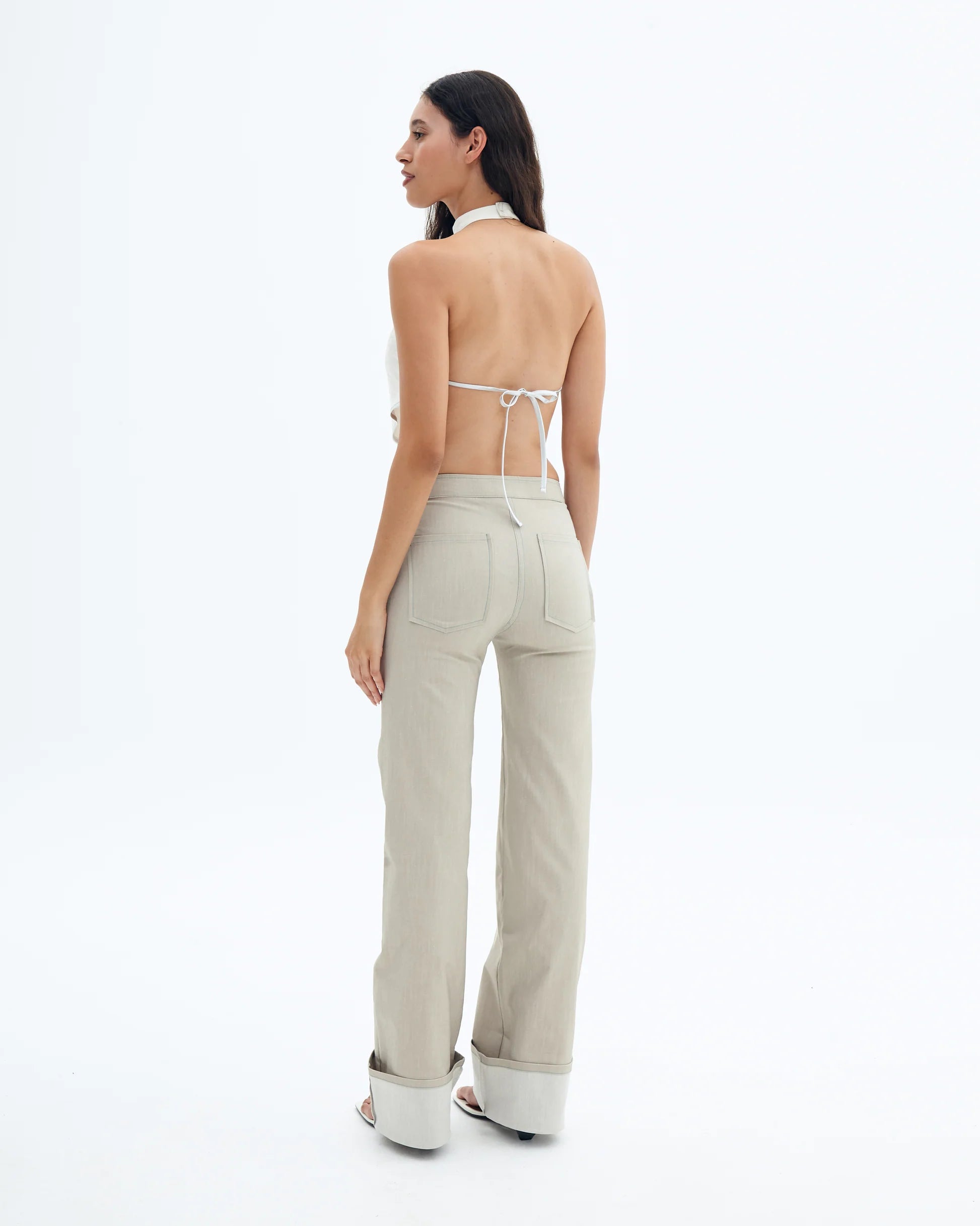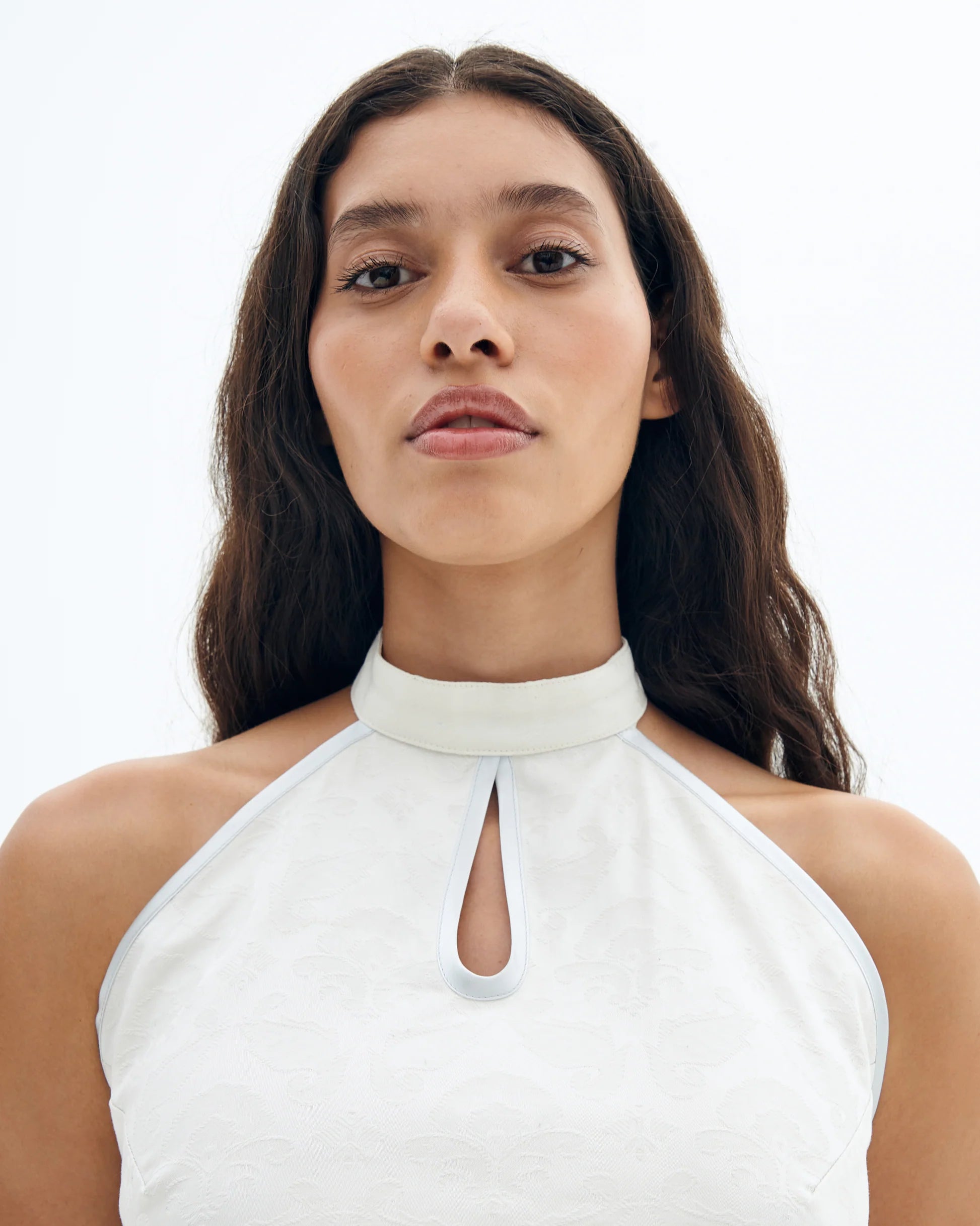 Tied top with halter neck and cut-out detail. Jacquard fabric. Adjustable and very comfy.