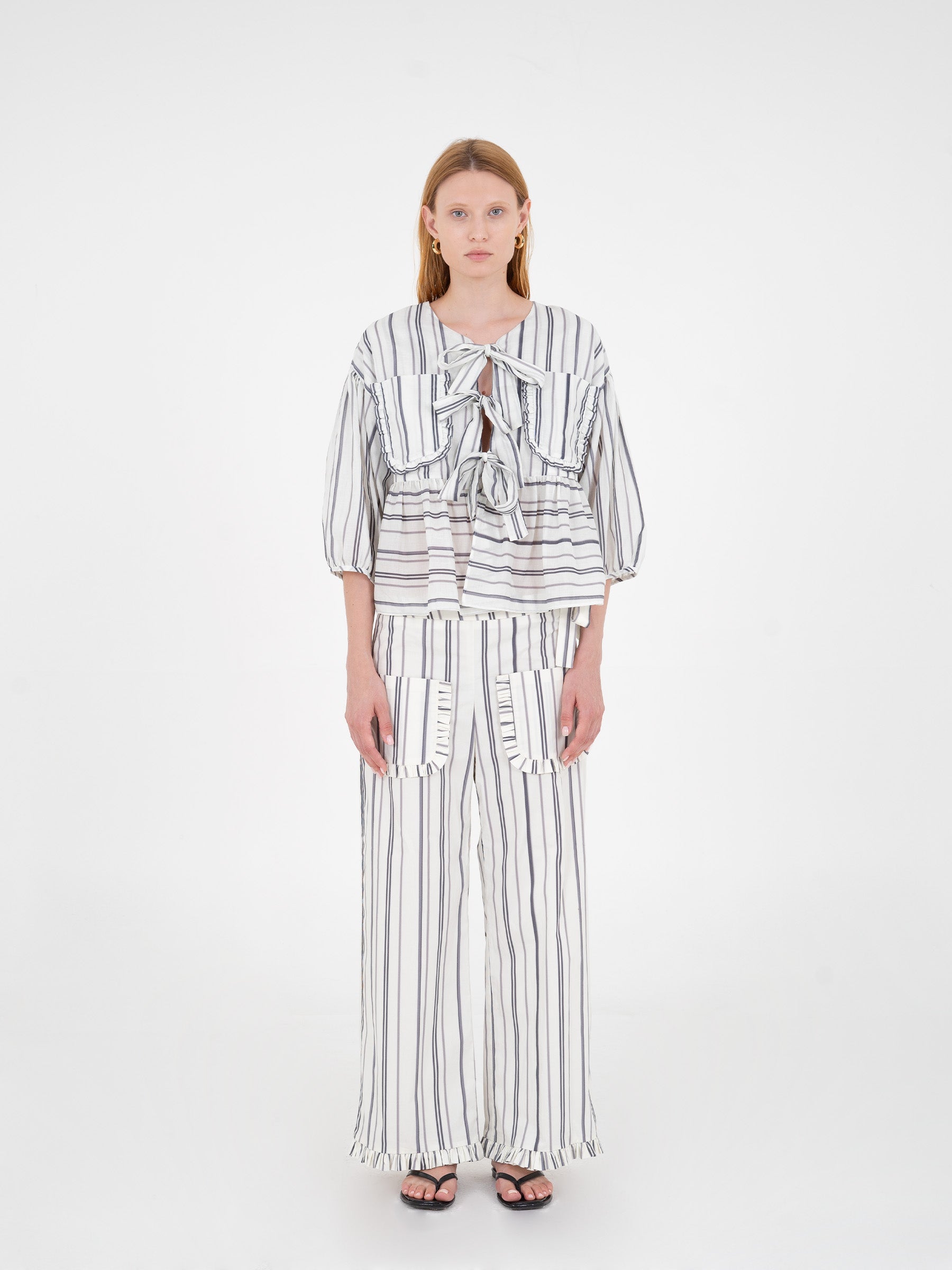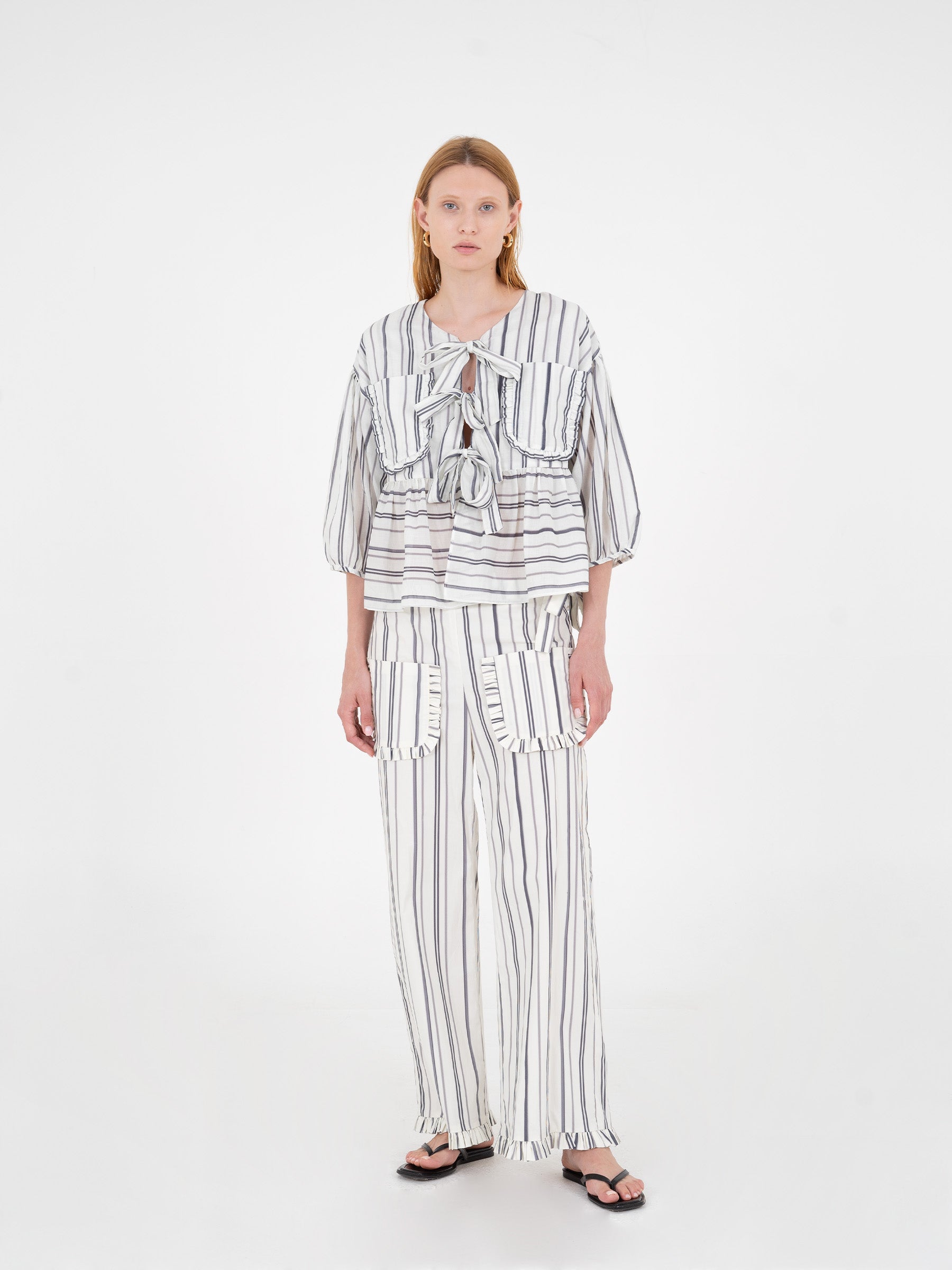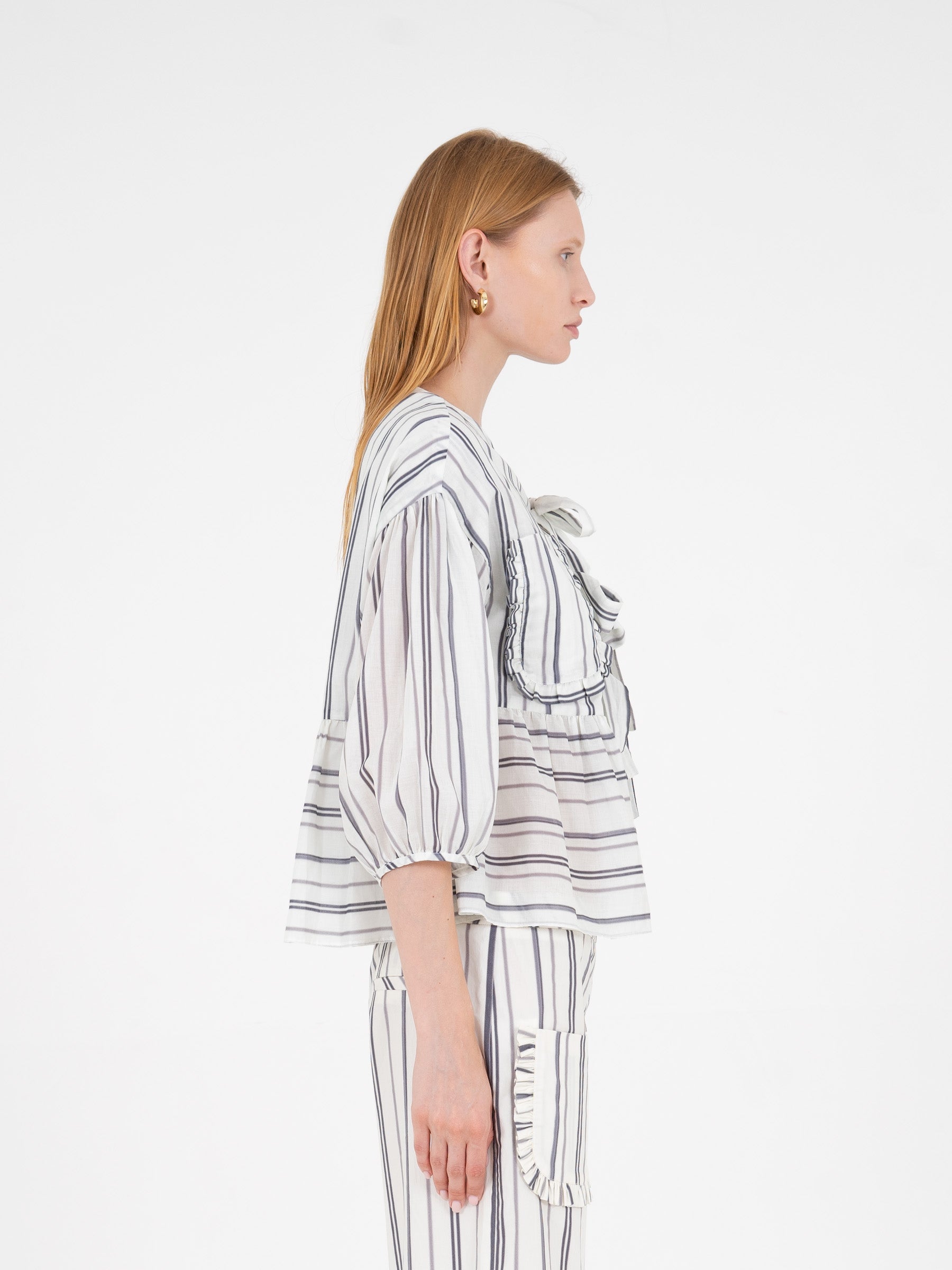 Top estampado con manga abullonada. Delantero con bolsillos y cerrado con lazos.