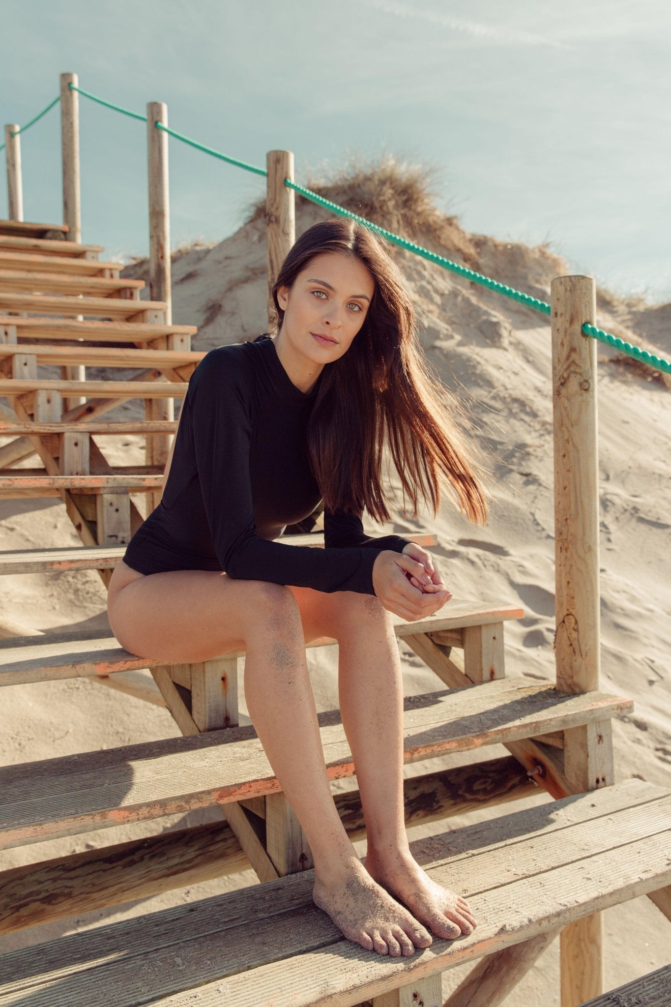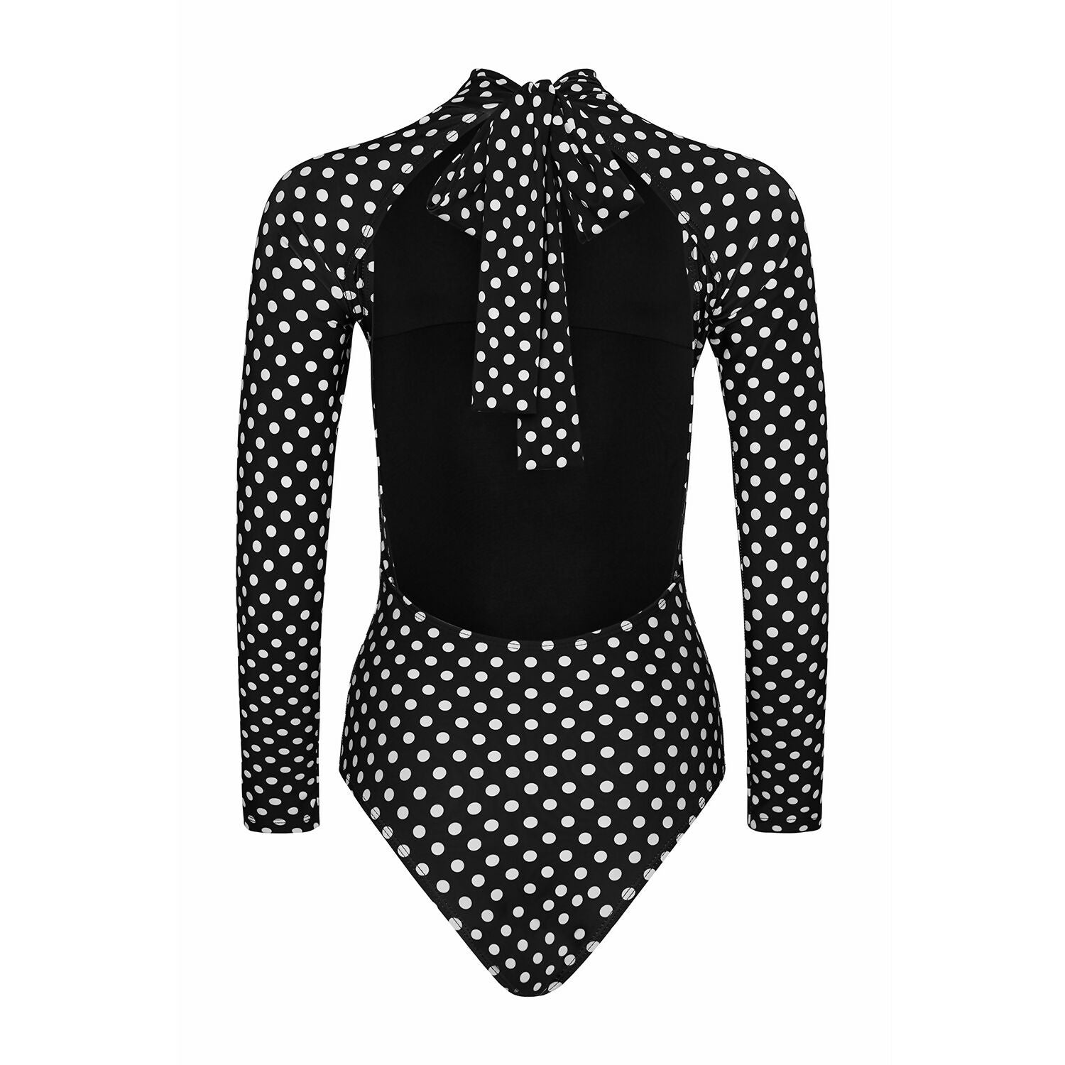 Look modern and sexy in this long-sleeved, open-back swimsuit with a bow at the neck by Paola Amador! Choose your favorite color or a seasonal print for a modern and sexy look for both the city and the beach.
