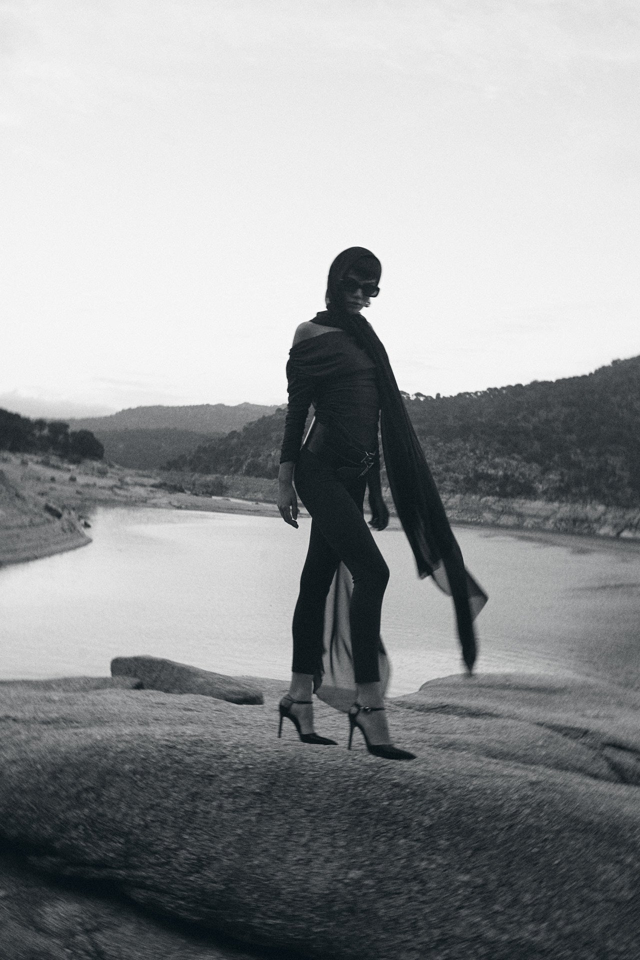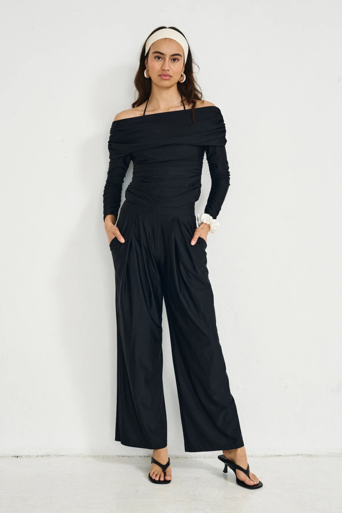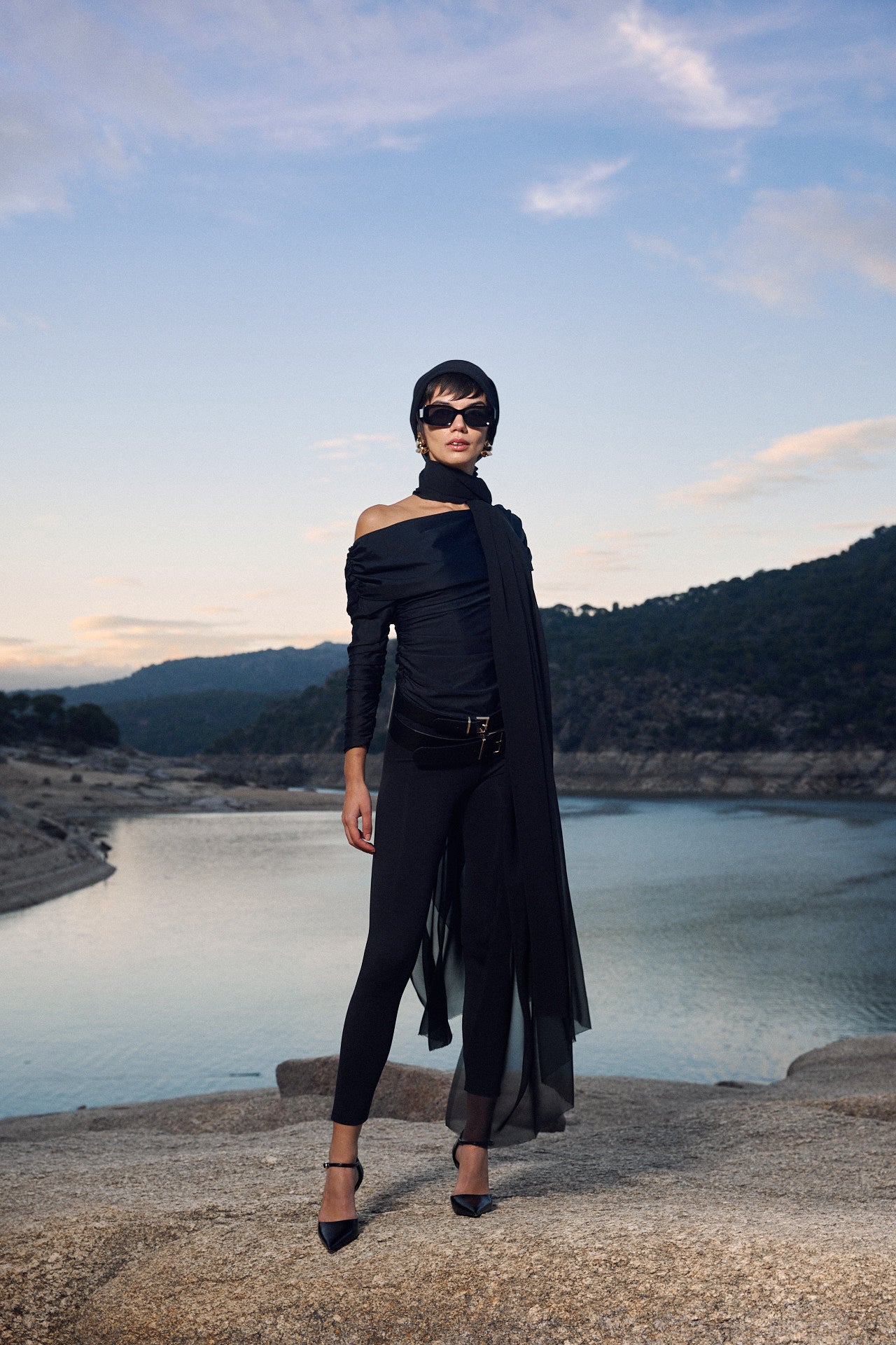 Off-shoulder top, long-sleeved Bardi neckline with double fabric pleated detail, fitted cut. Limited to 150 unique units. Each piece is numbered and certified.