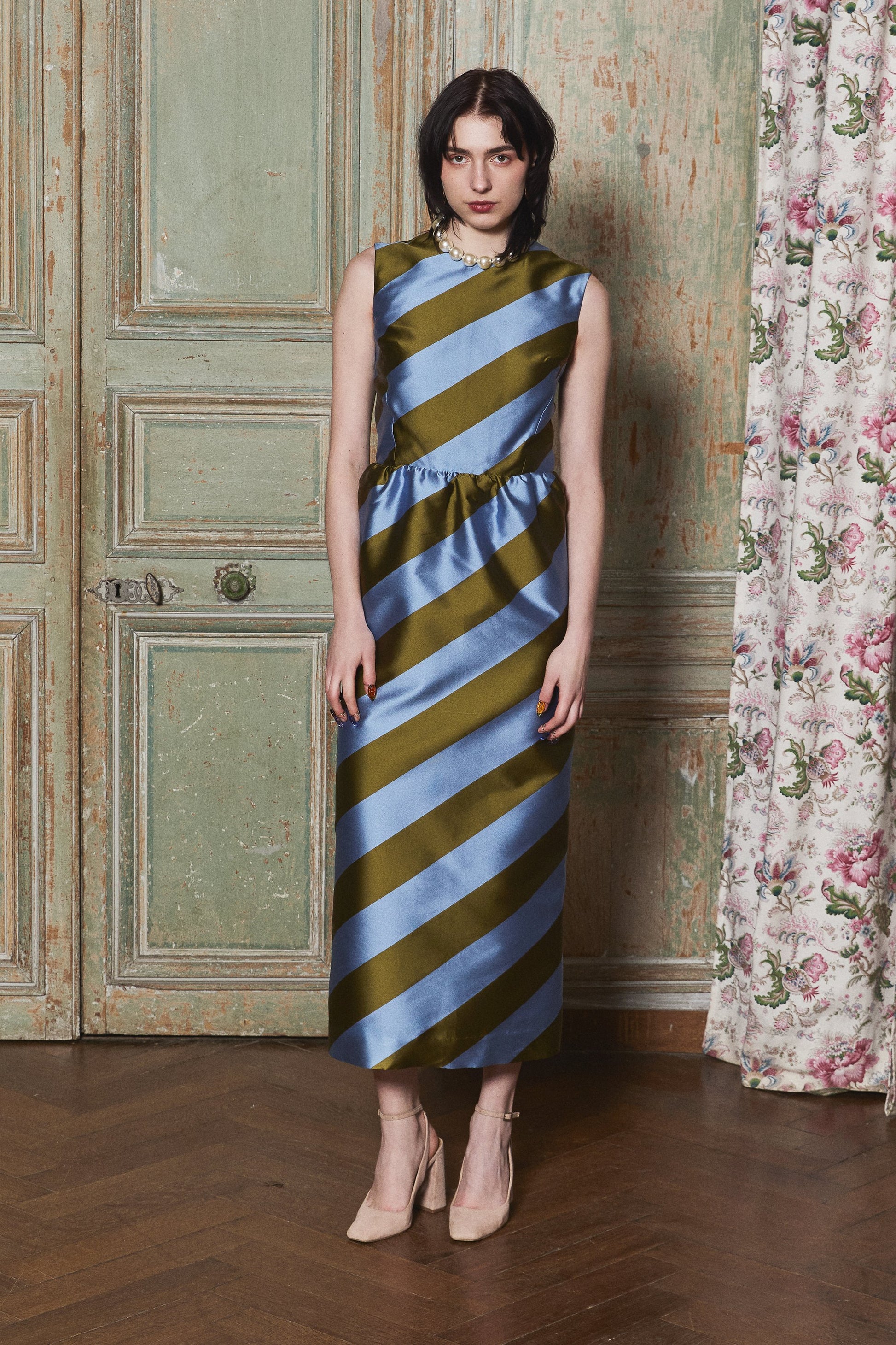Long, sleeveless, straight dress in blue and green striped satin. Fully lined, with a back slit, and a small ruffle inside the lining to keep the gathers at the waistline full. Due to its tube shape, this dress fits truer than other styles; if you are between sizes, we recommend sizing up.