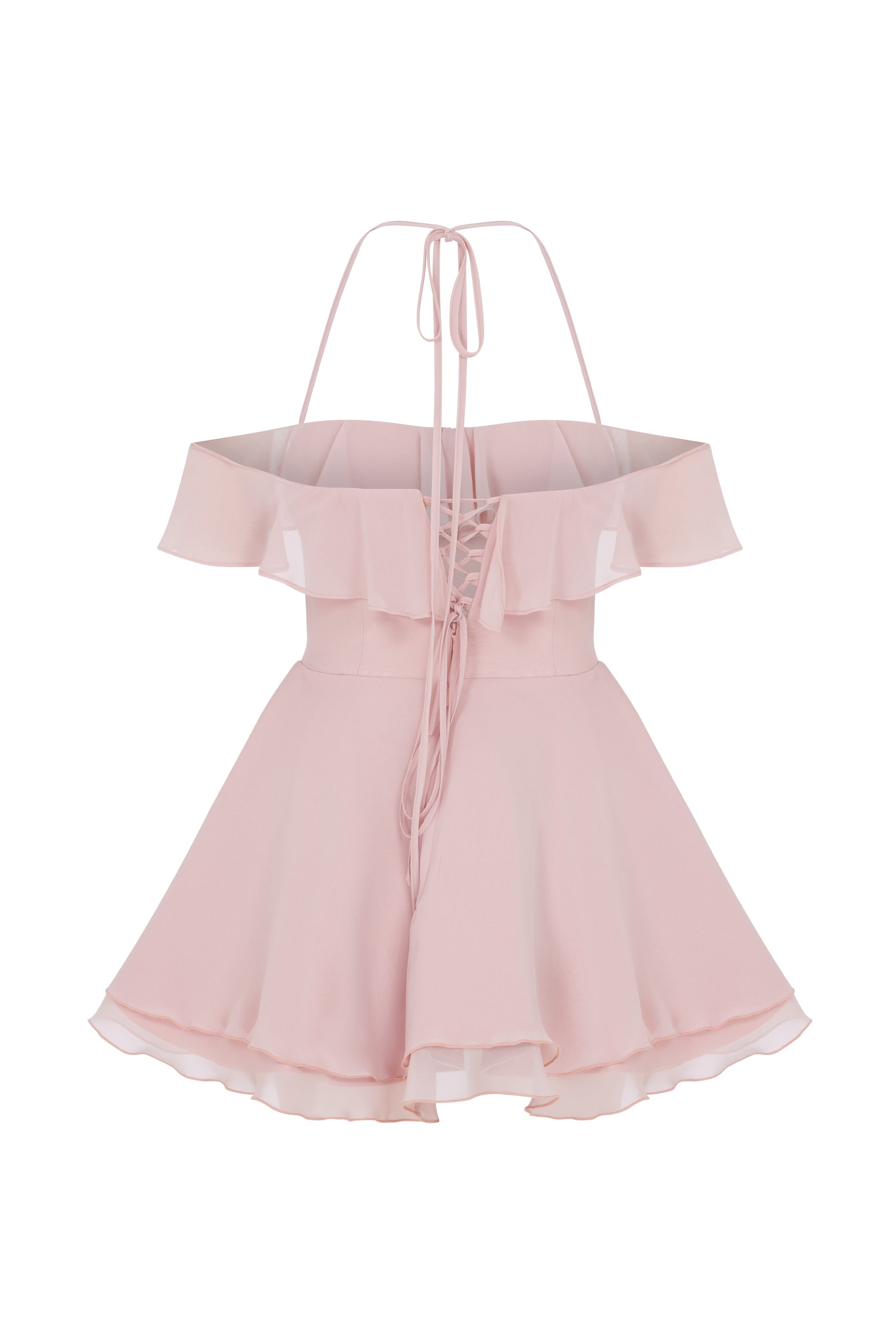 The Evie Mini Dress in tender peach is crafted from soft chiffon fabric, featuring a lightweight, floaty skirt that adds a dreamy touch. Lined with smooth satin for added comfort, this charming dress combines elegance with ease, making it a perfect choice for warm-weather outings or special occasions.