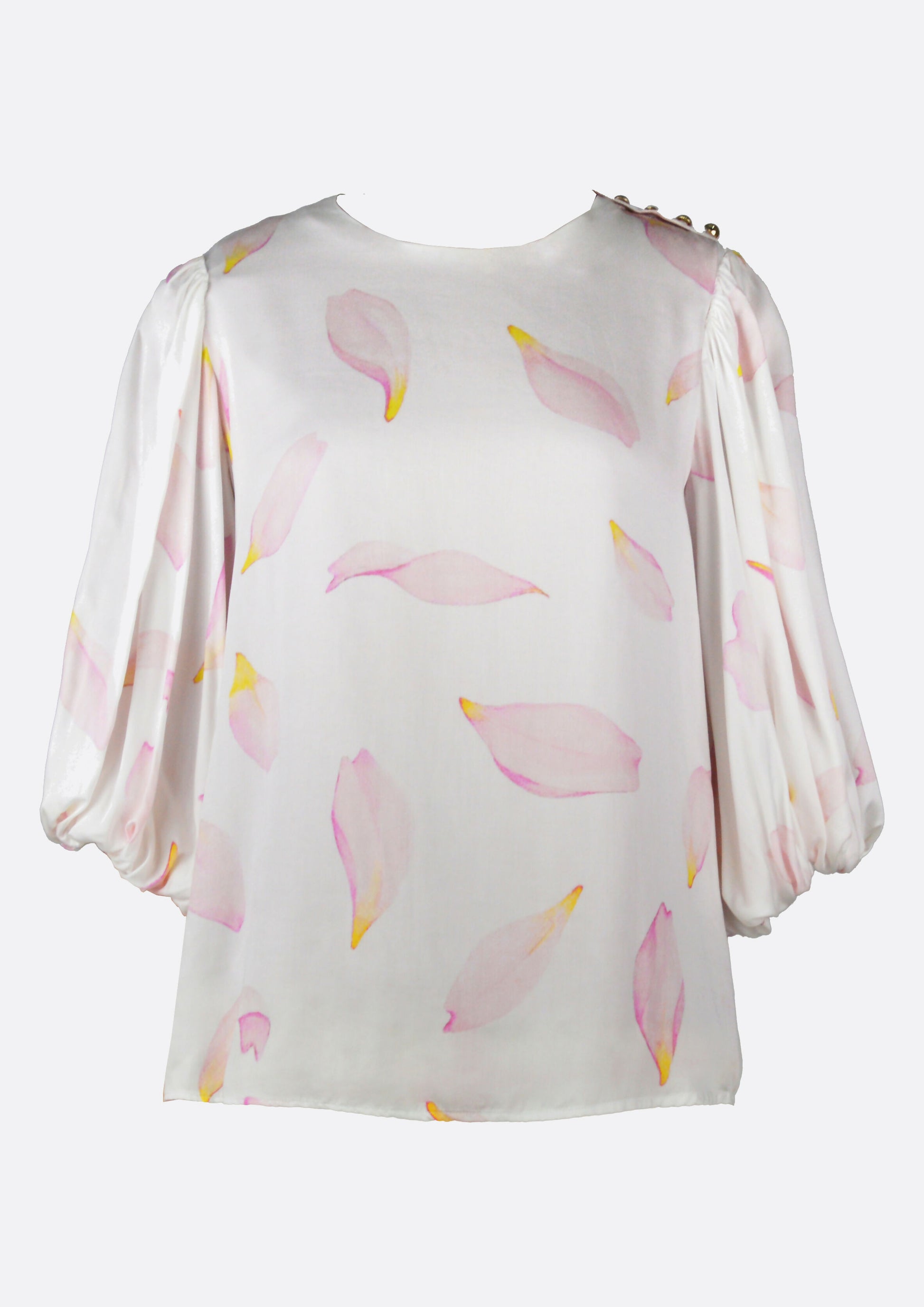 Printed blouse with puffed sleeves, round neck closed with gold buttons on the shoulder. Fully lined