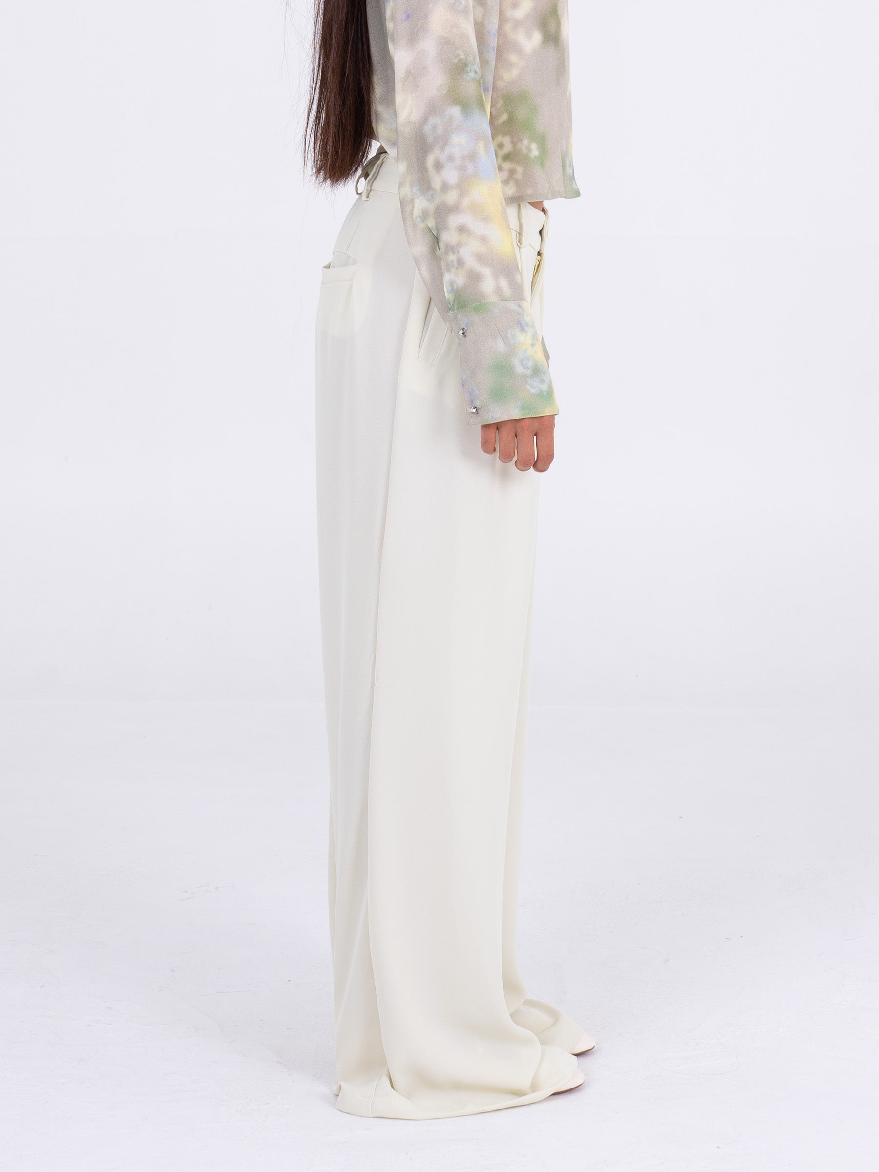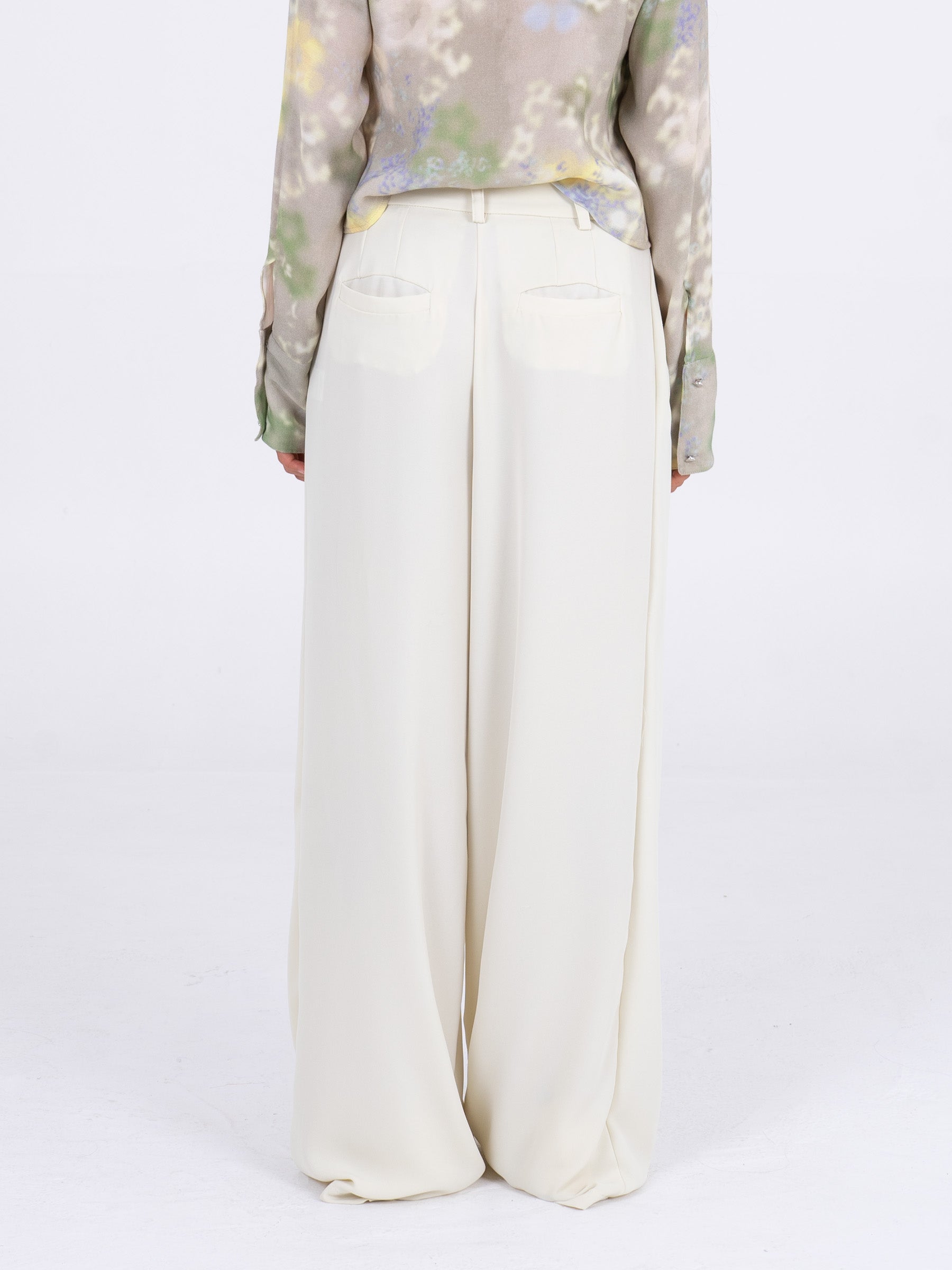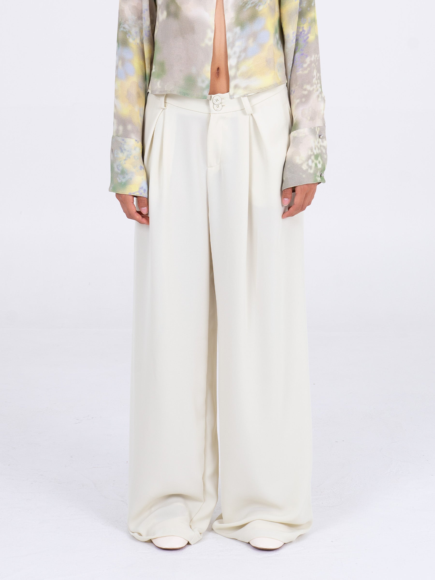 Pantalones palazzo, de tiro medio, con detalle de pliegues. Apertura de doble botón y cremallera, bolsillos laterales en el delantero y bolsillos de vivo en la espalda.