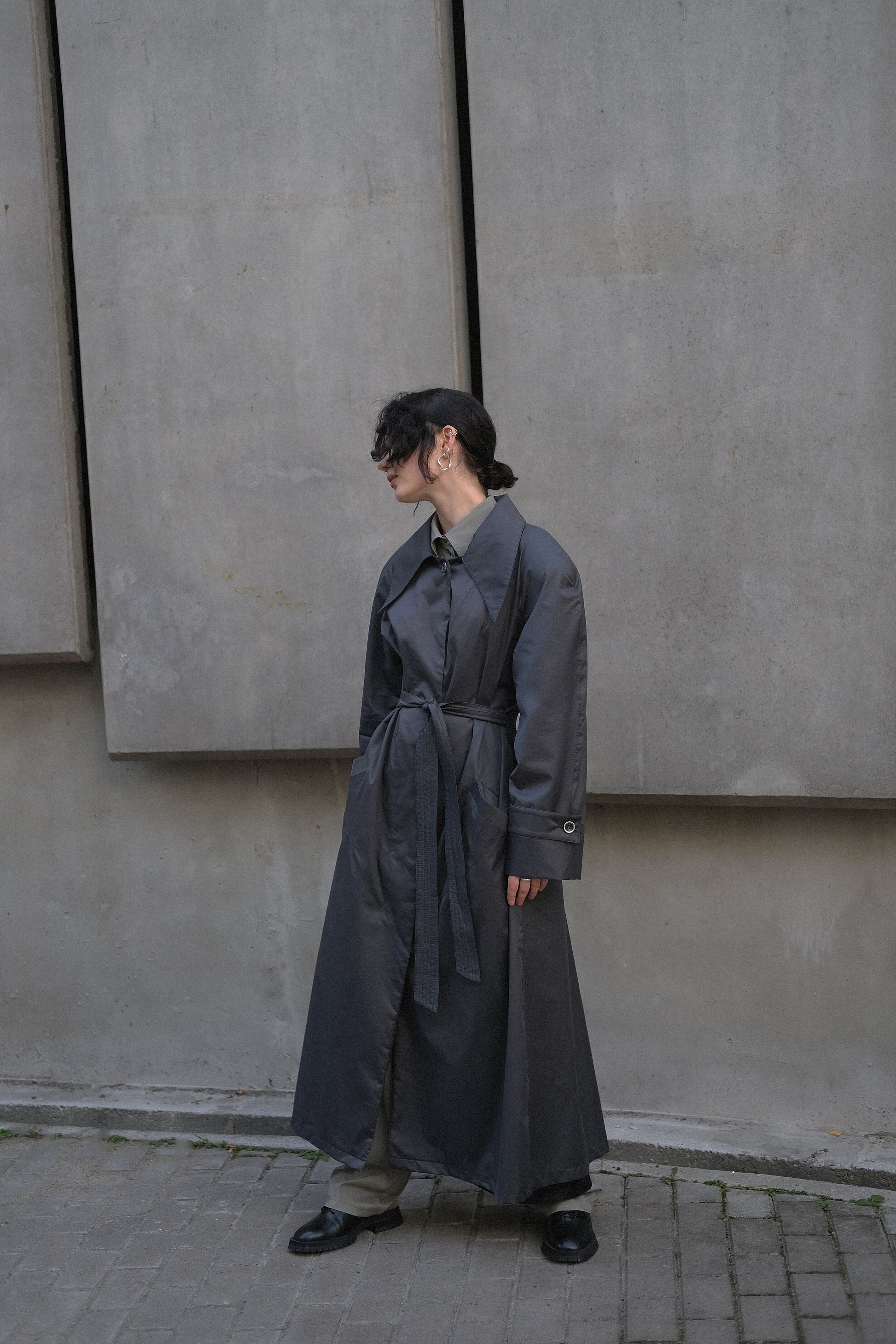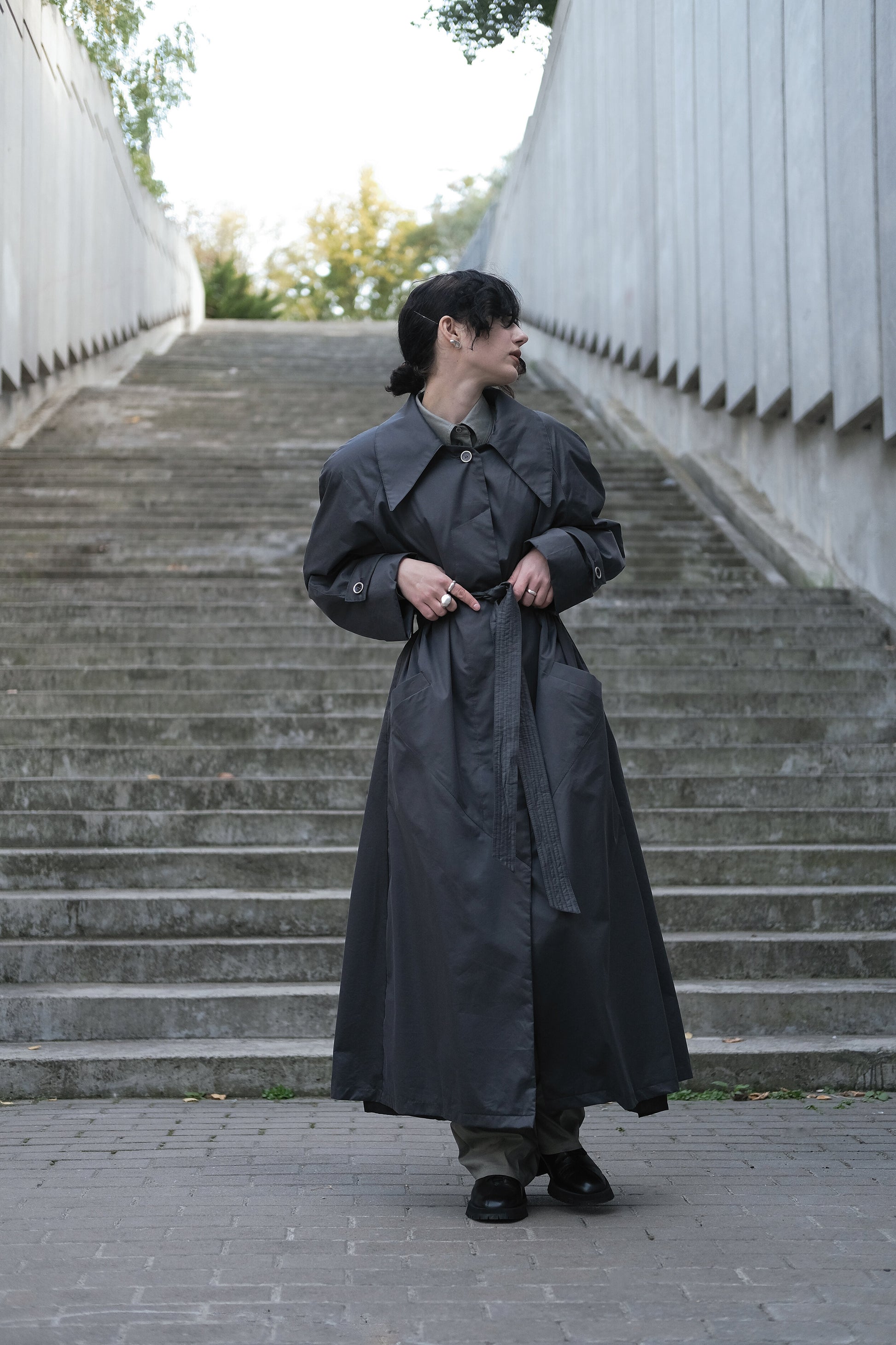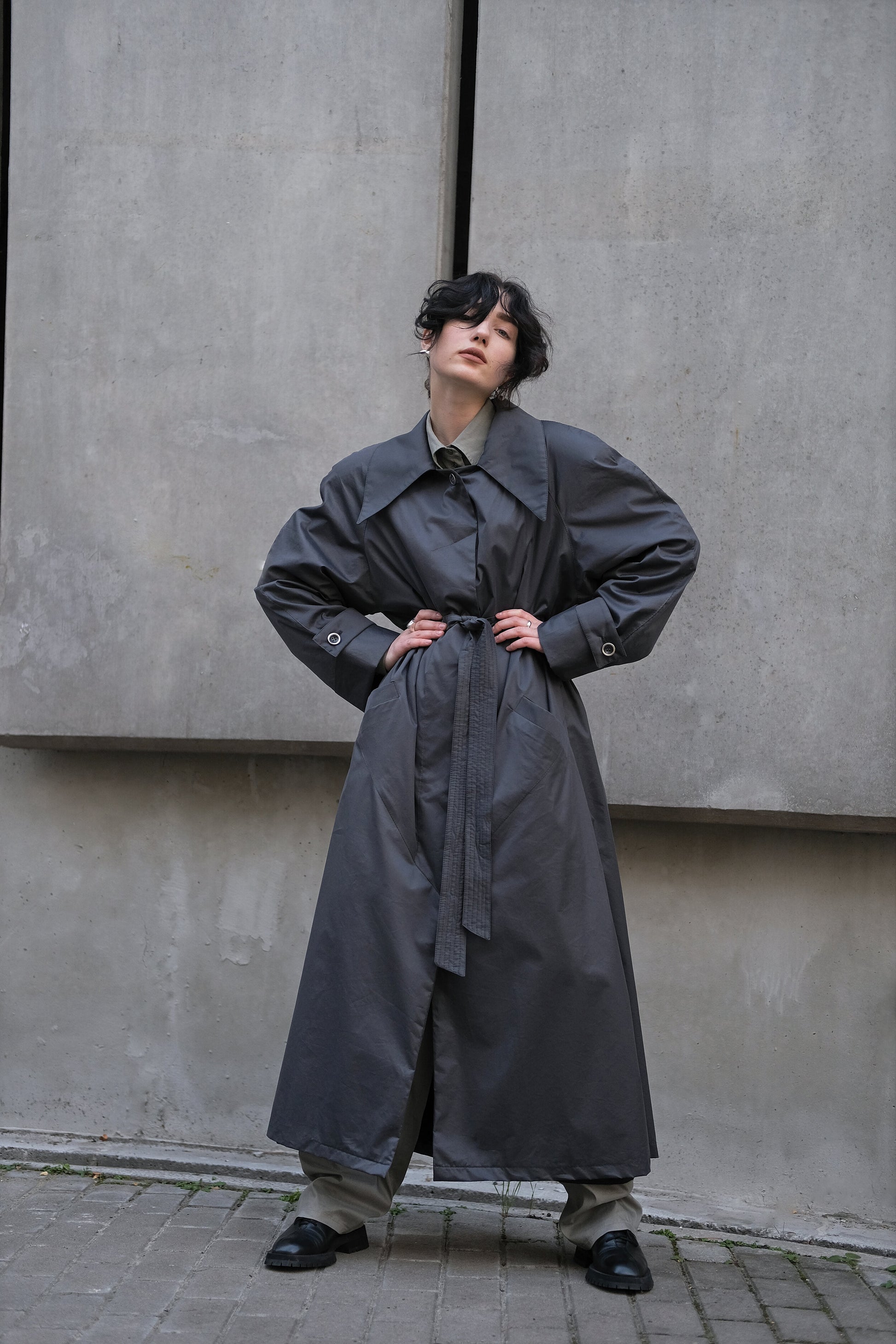 A worthwhile investment, the Kamenets Grafite Pointed Collar Trench is spun from a blend of waxed tech cotton and silk - it's lined with flowing viscose to accentuate the luxuriously feel. It features a pointed collar, minimal padded shoulders, side cargo pockets and clips pleated back detail. Tie the belt to cinch the waist and keep in the heat. Water resistant feel. Use as an everyday trench coat in mild weather with your favourite KM by LANGE looks.