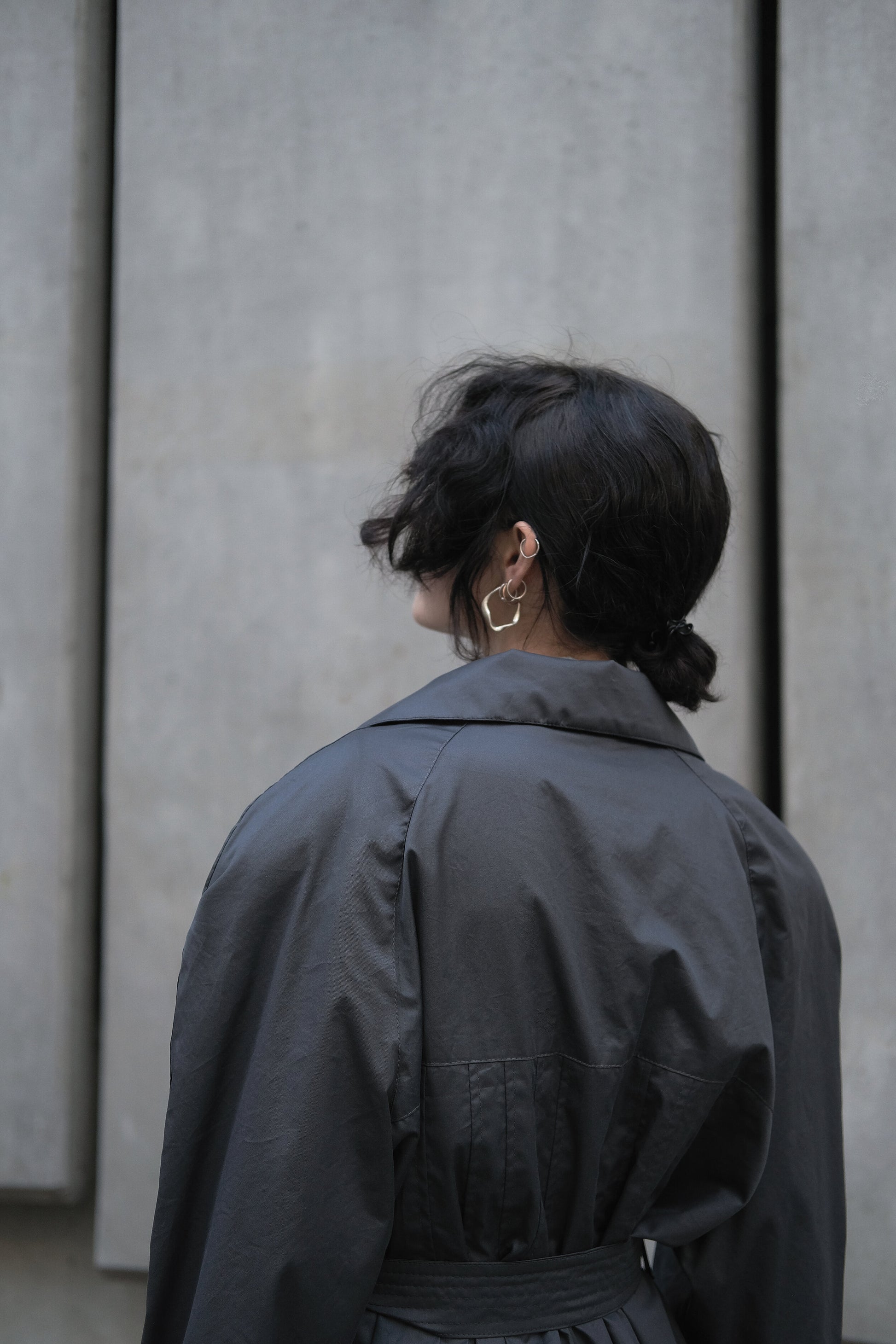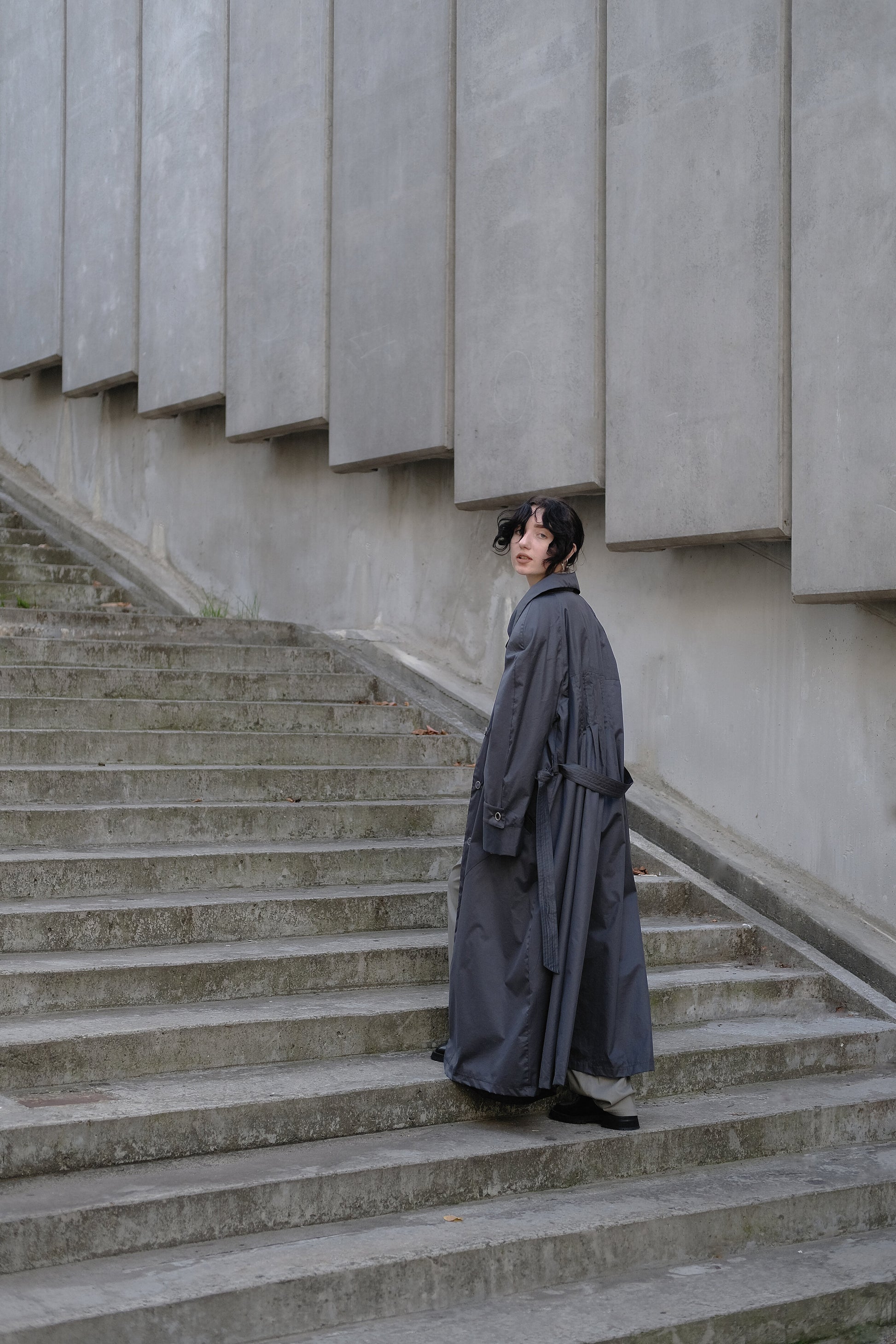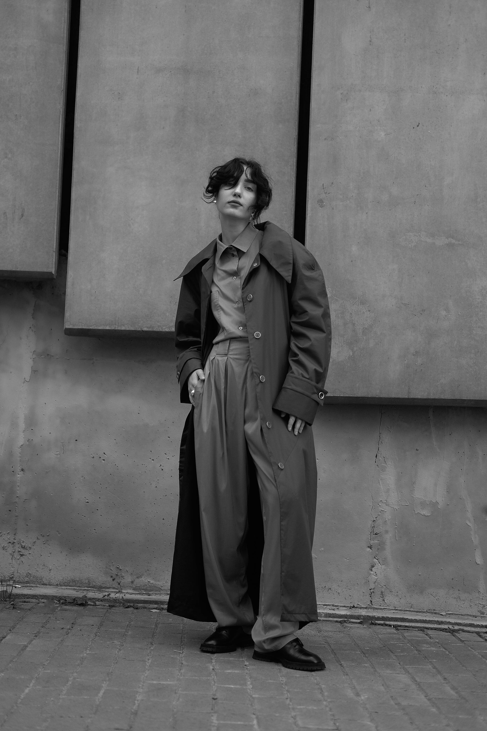 A worthwhile investment, the Kamenets Grafite Pointed Collar Trench is spun from a blend of waxed tech cotton and silk - it's lined with flowing viscose to accentuate the luxuriously feel. It features a pointed collar, minimal padded shoulders, side cargo pockets and clips pleated back detail. Tie the belt to cinch the waist and keep in the heat. Water resistant feel. Use as an everyday trench coat in mild weather with your favourite KM by LANGE looks.
