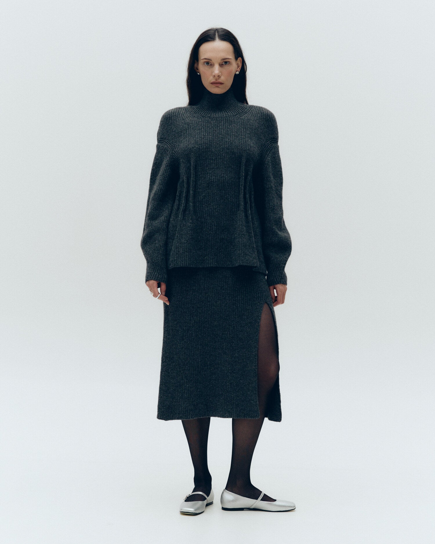 High neck sweater with dropped shoulder line and tucks on waist. Skirt on elastic band with side cut.