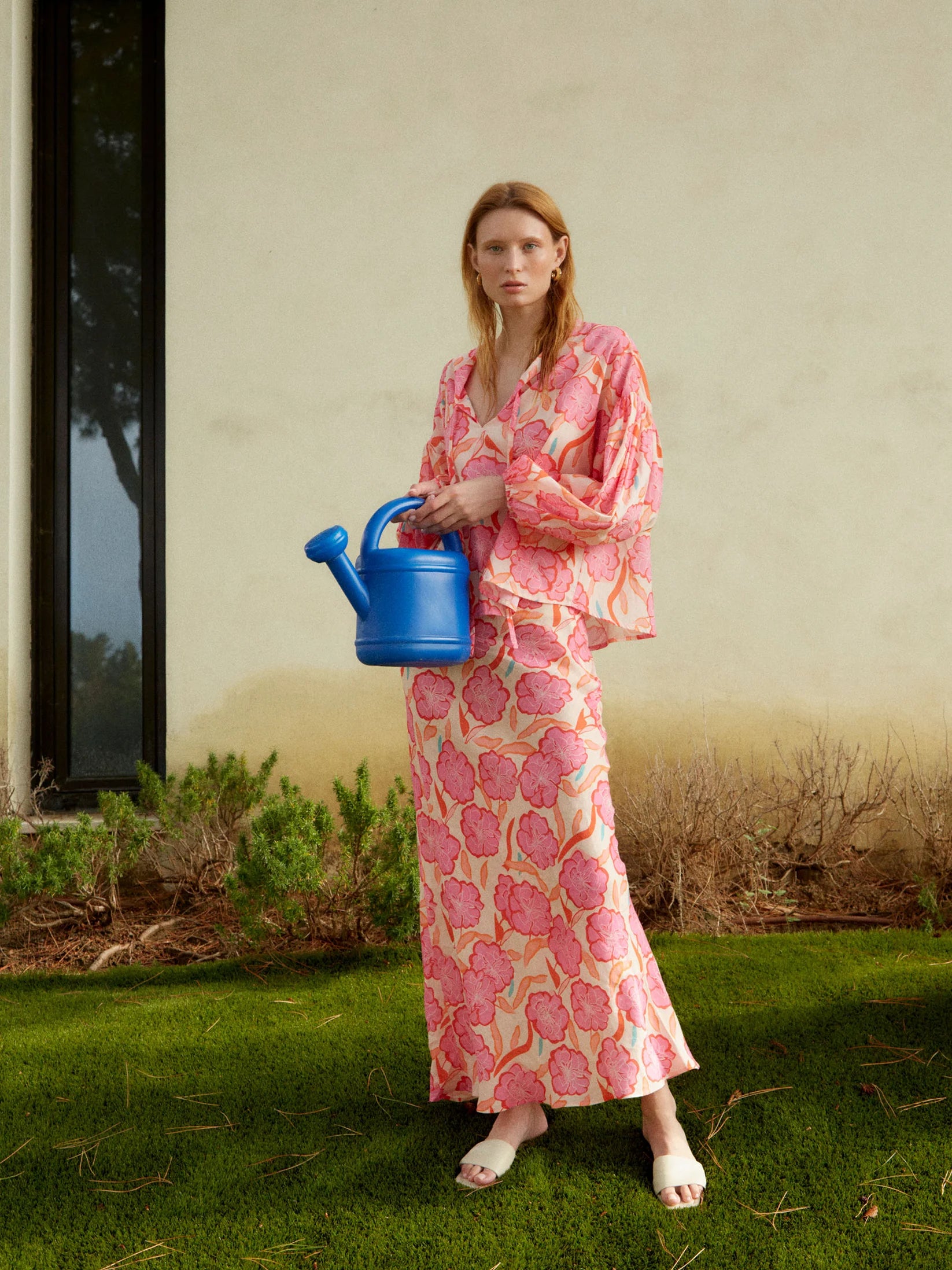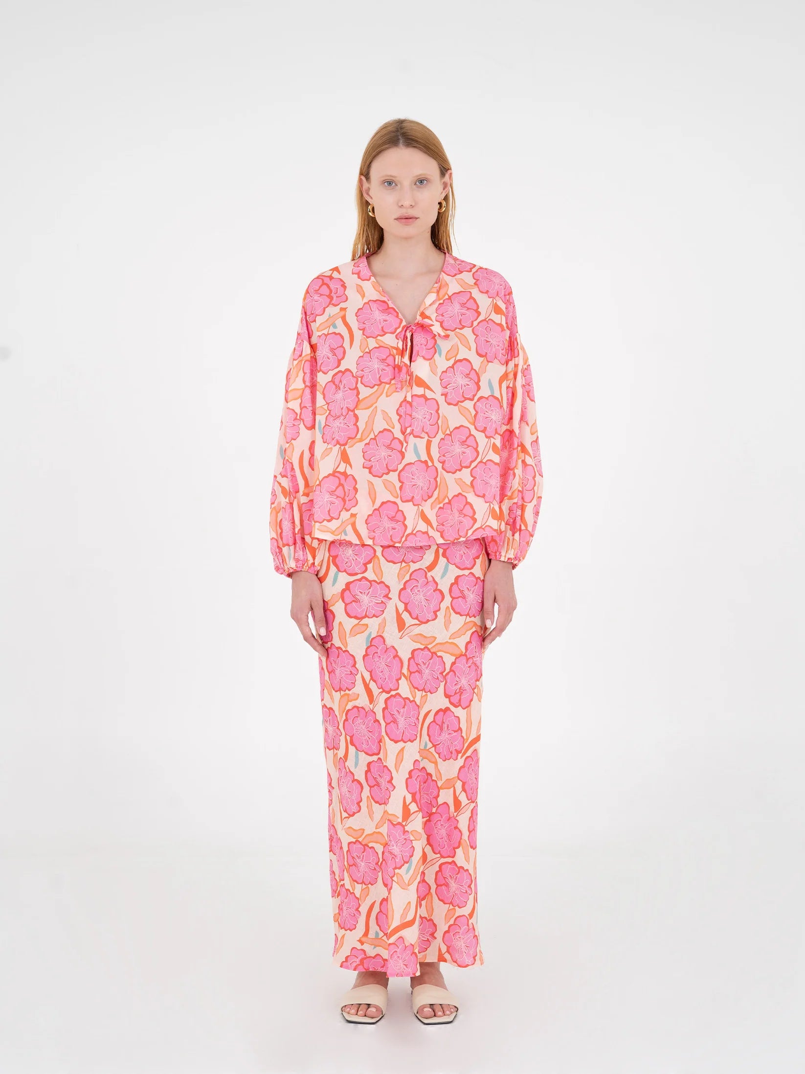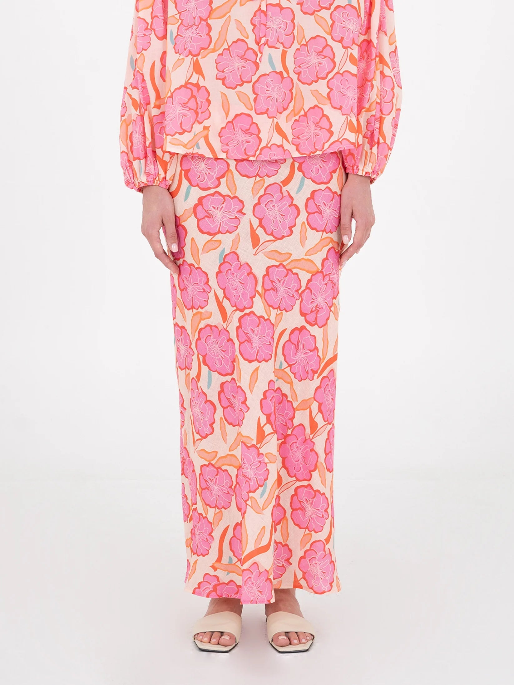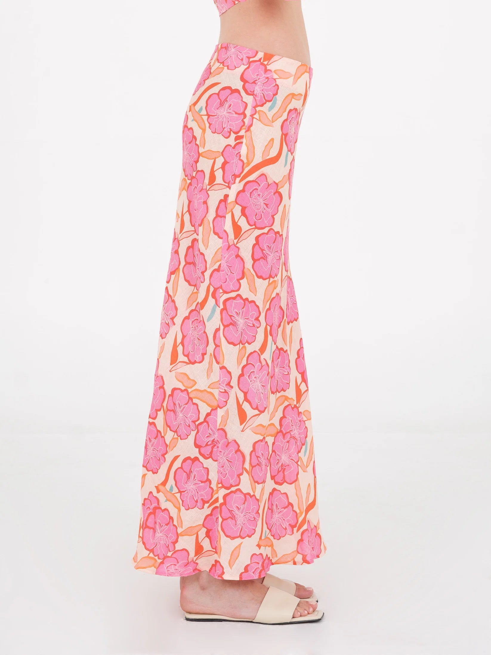 Falda maxi de corte recto estampada. Cierre con cremallera en el lateral.