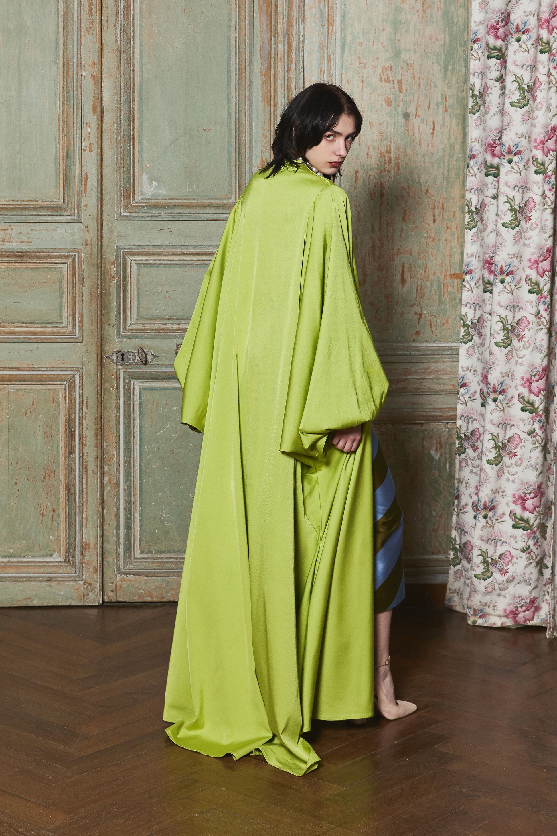 Evening cape in apple green ottoman MORPHÉE, with puffed sleeves tightened at the wrist.