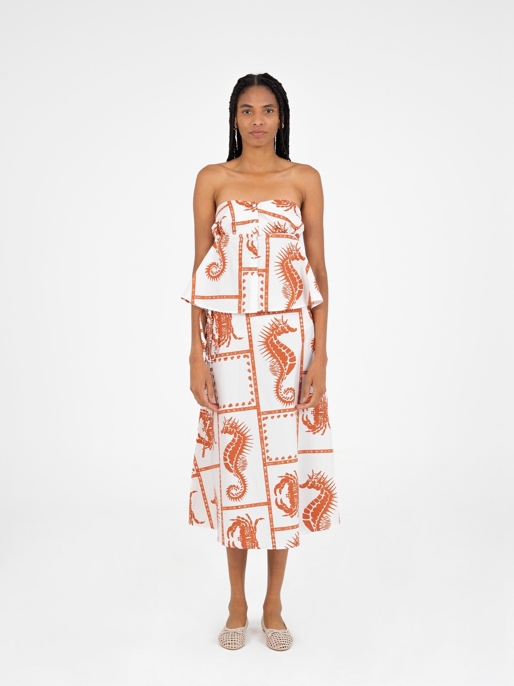 Strapless top with a structured silhouette and a soft drape. Buttoned front and delicate ruffle at the bottom.