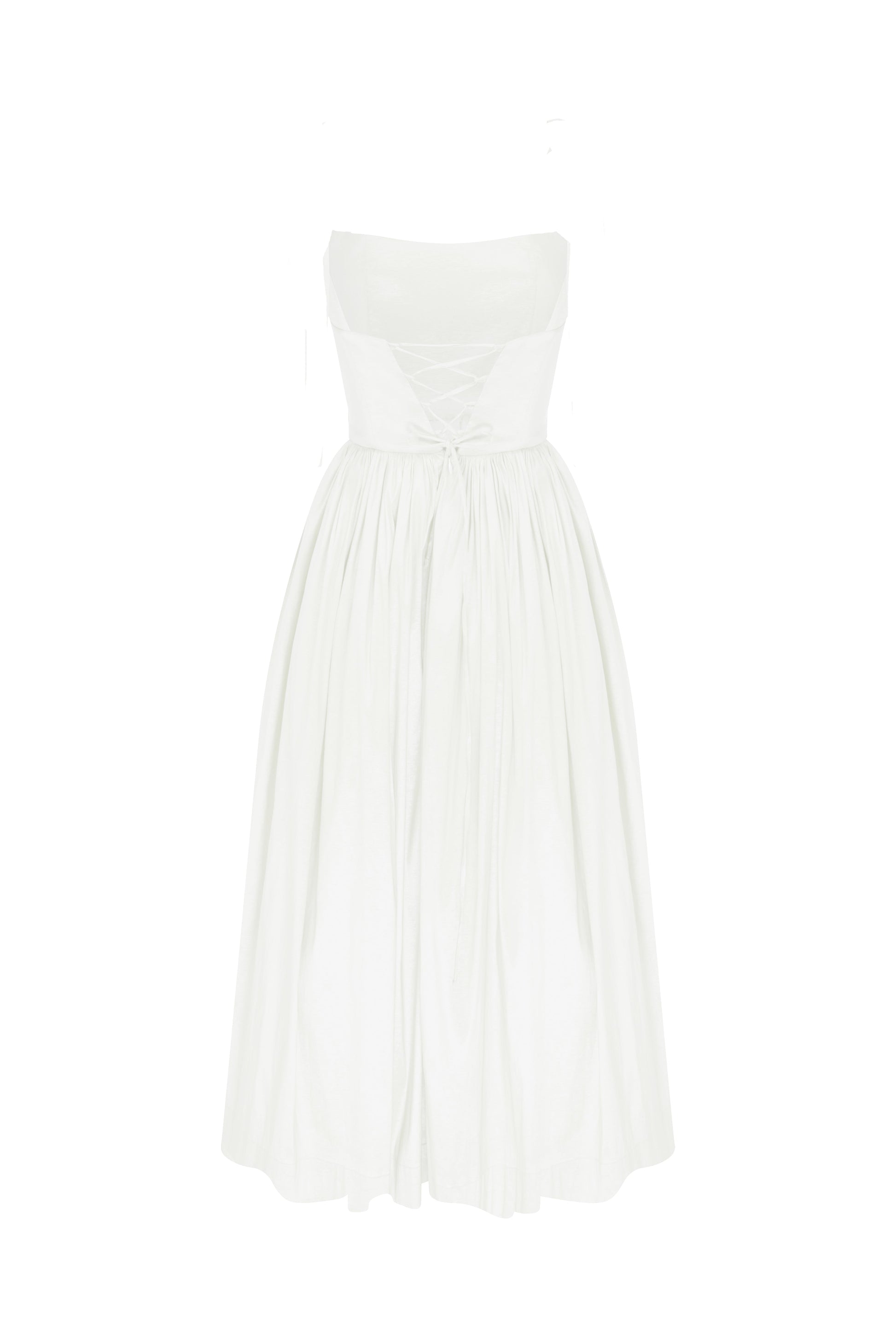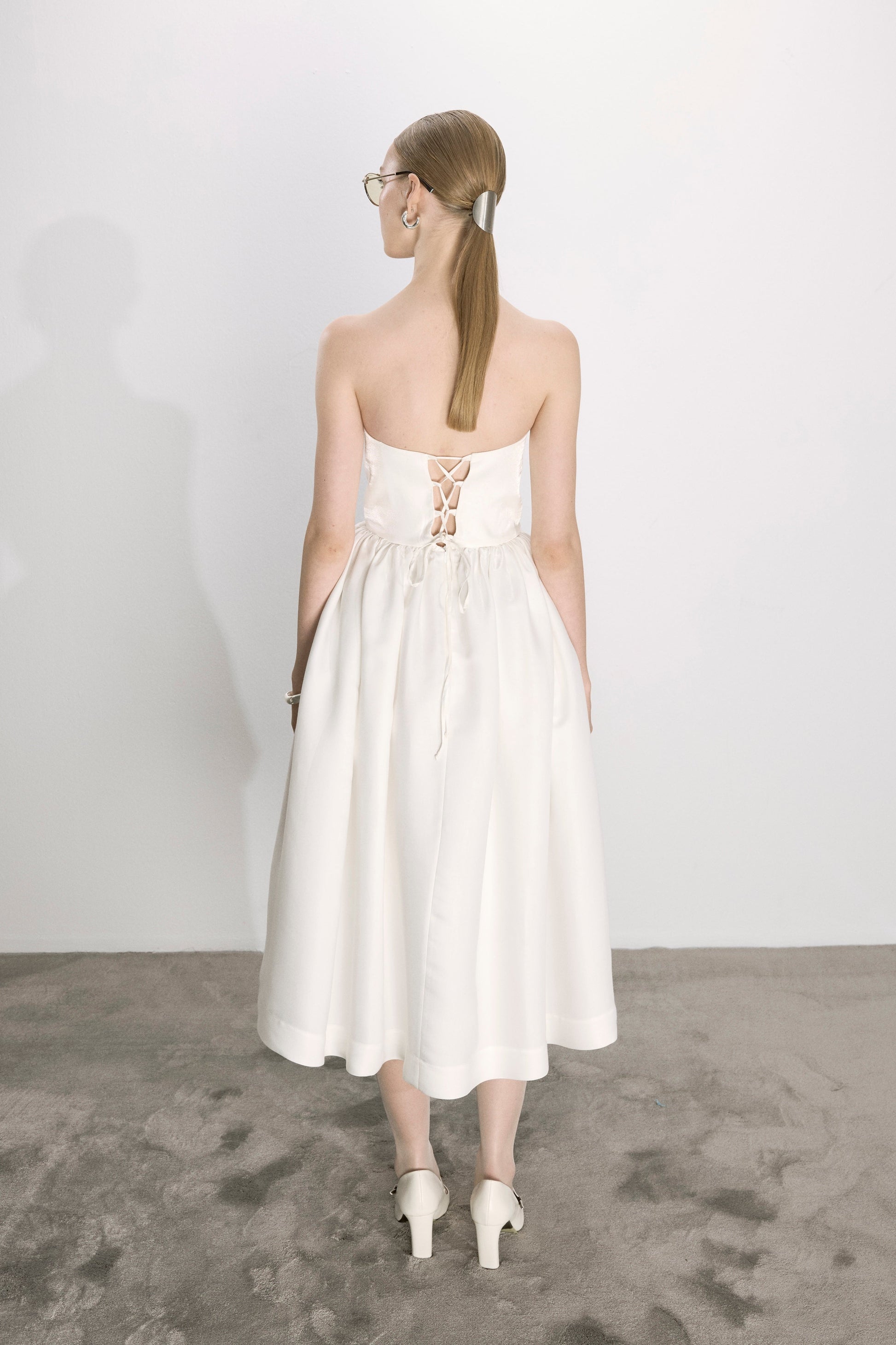 The Sibby Dress is crafted from lightweight satin viscose and represents the touch of elegance. This strapless, midi-length dress boasts an adjustable back for a perfect fit and includes a layer of tulle under the skirt for added volume and flair. Effortlessly chic, the Sibby Dress is ideal for any special occasion.