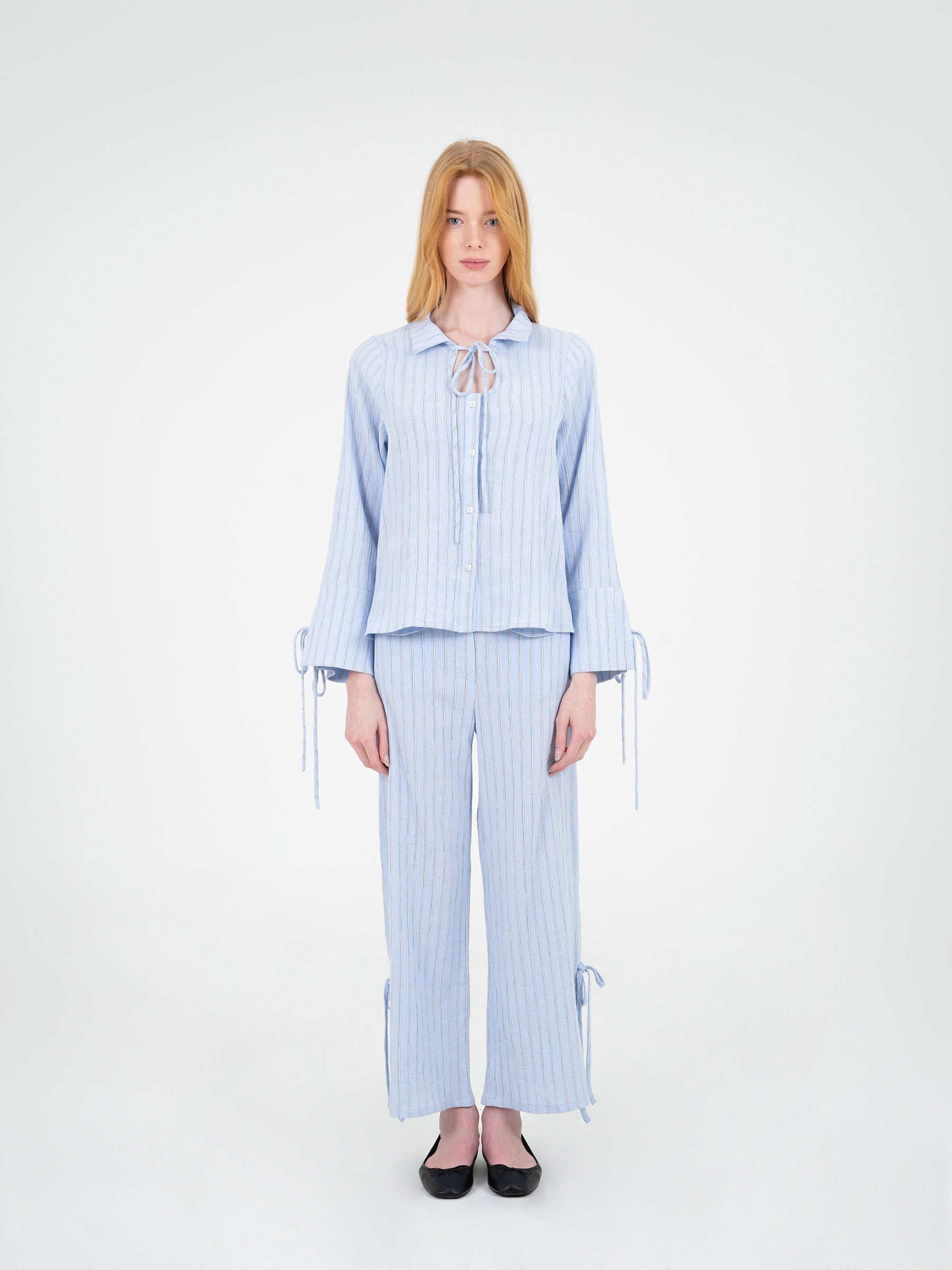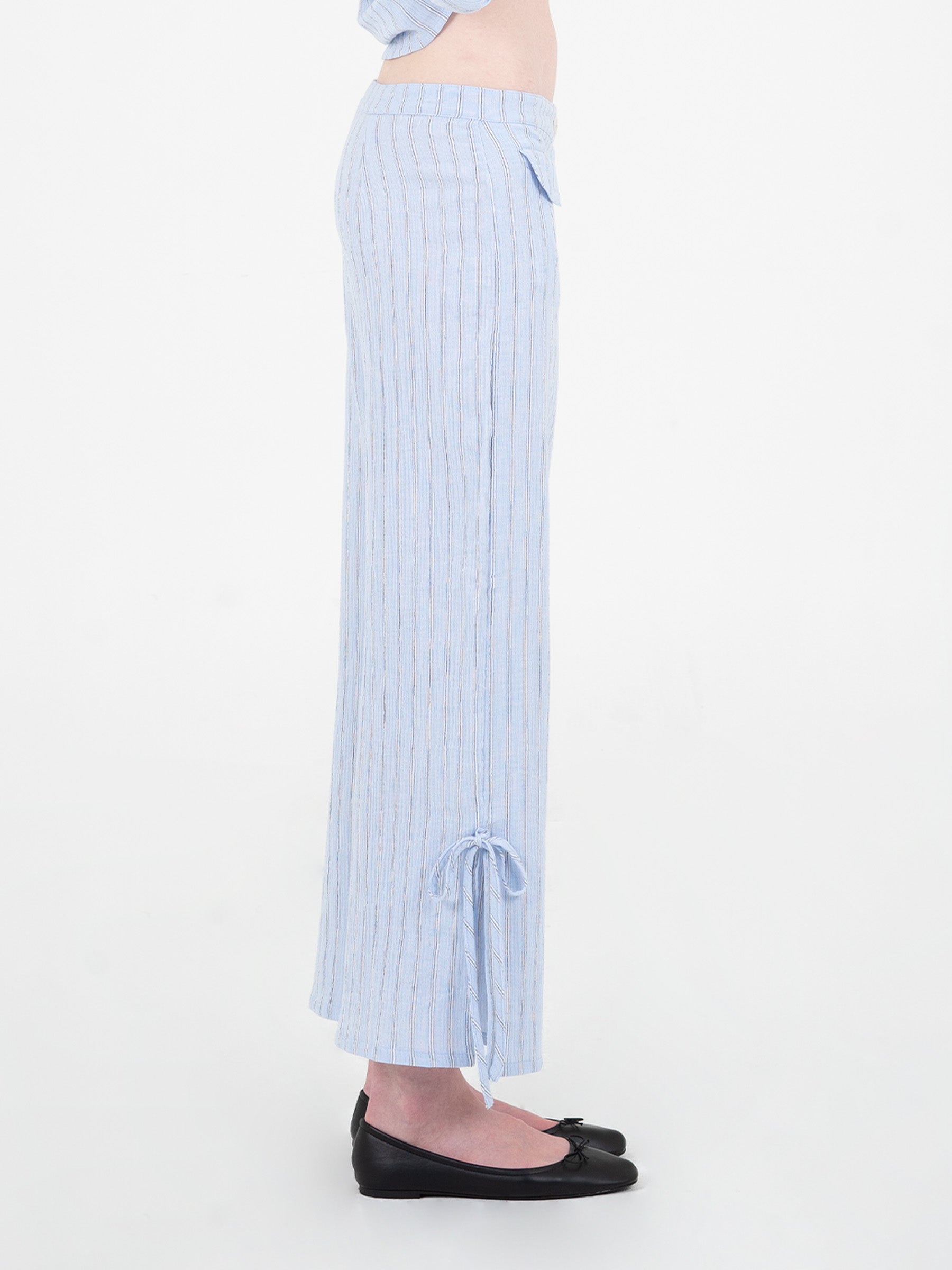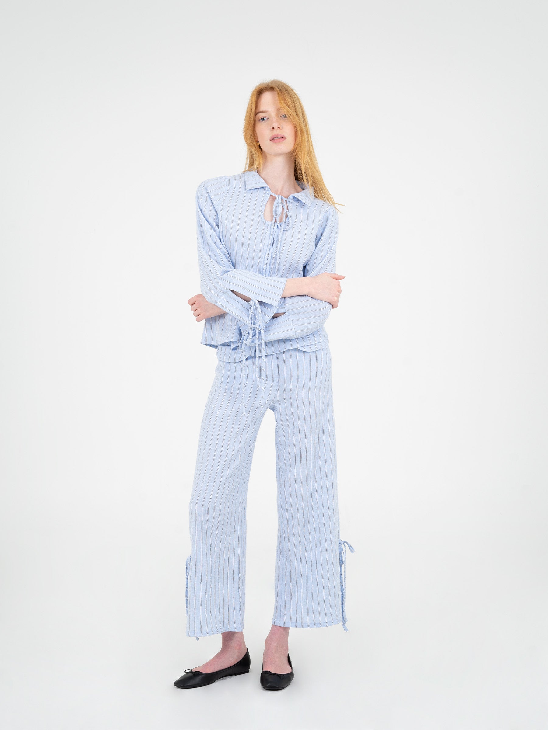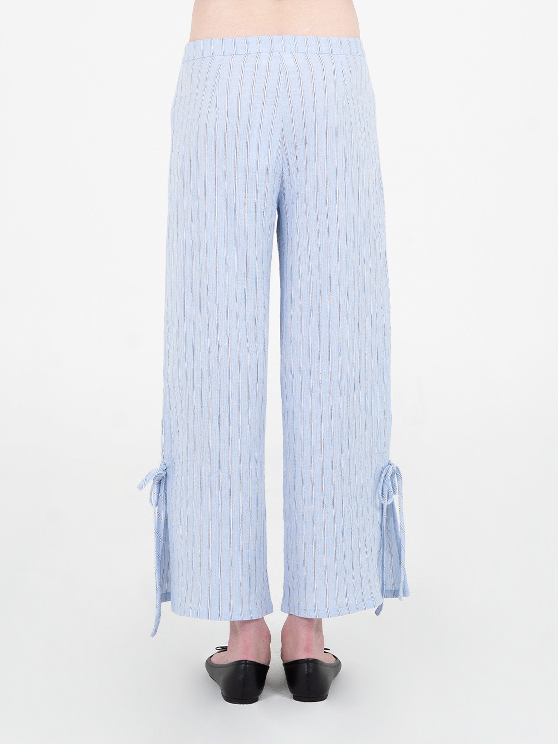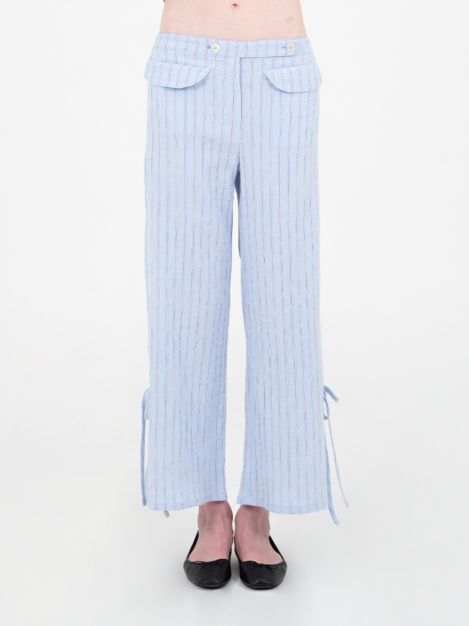 Straight-leg, low-waist pants. Detail of side slits at the bottom that adjust with ties.