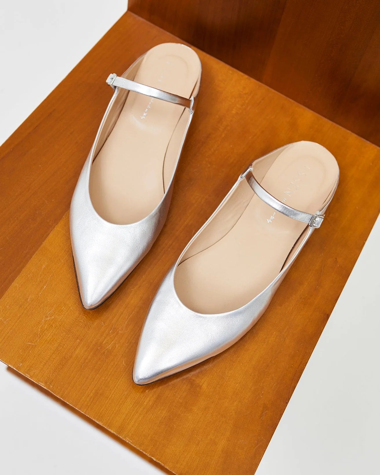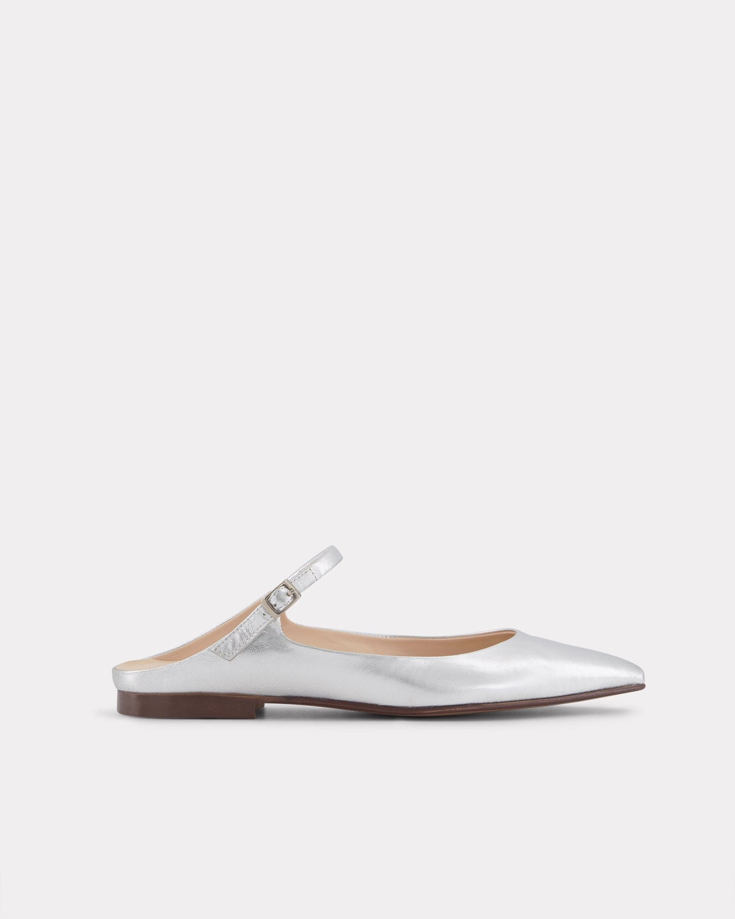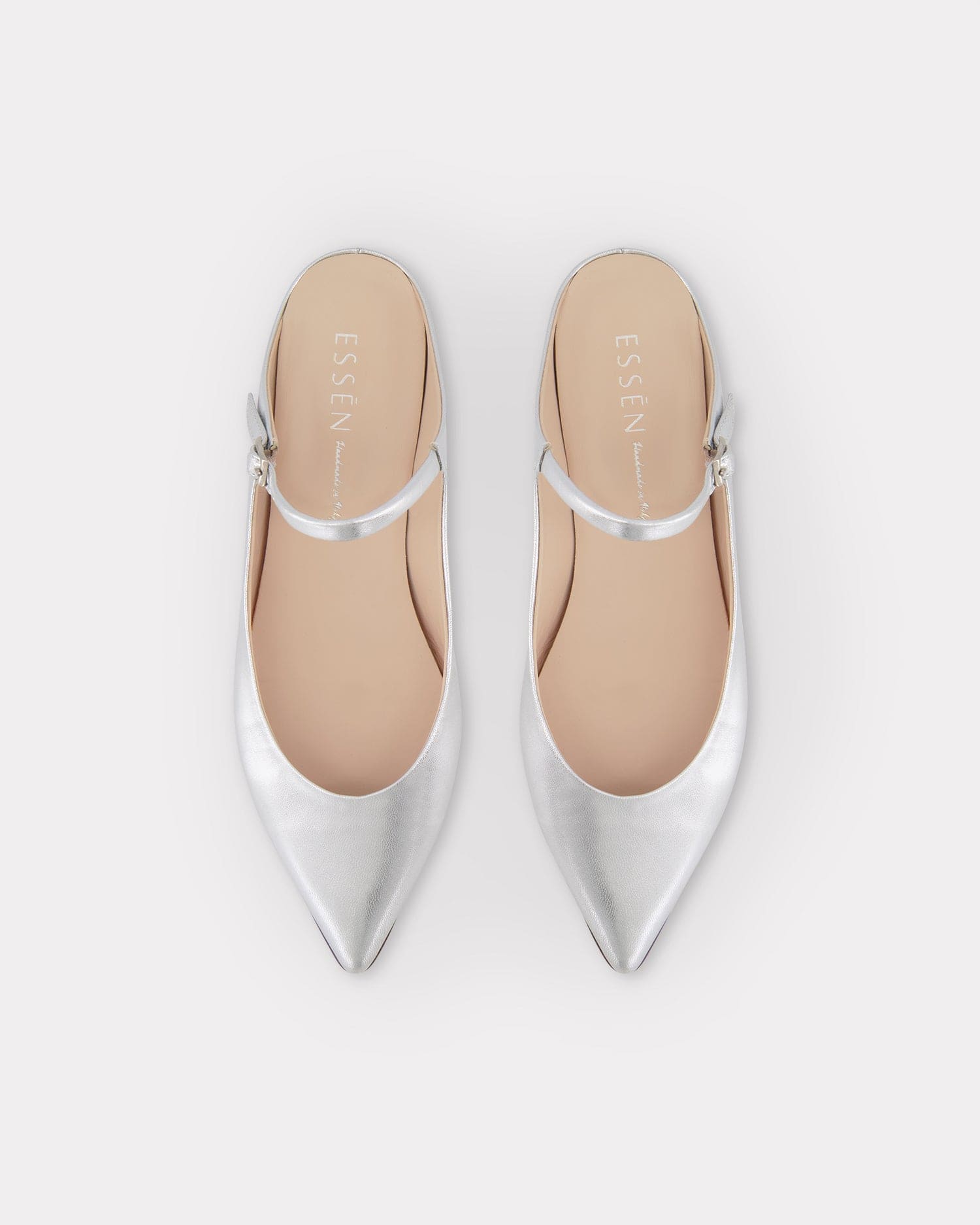 Effortlessly elegant with comfort at its core, The Mary Jane is so versatile and comfortable you'll reach for it often. ESSEN’s contemporary take on this timeless classic features a sleek silhouette that elongates your legs with the pointed toe adding a touch of architectural elegance. For instant outfit elevation, look to silver; a hue that pairs just as well with denim as it does an evening dress. The signature padded and adjustable strap ensures a snug fit, while the memory foam cushioned sole and rubber outsole keep your feet secure and comfortable for all-day wear. Crafted with care in Italy from premium materials, the artisans' meticulous attention to detail is evident in every stitch.