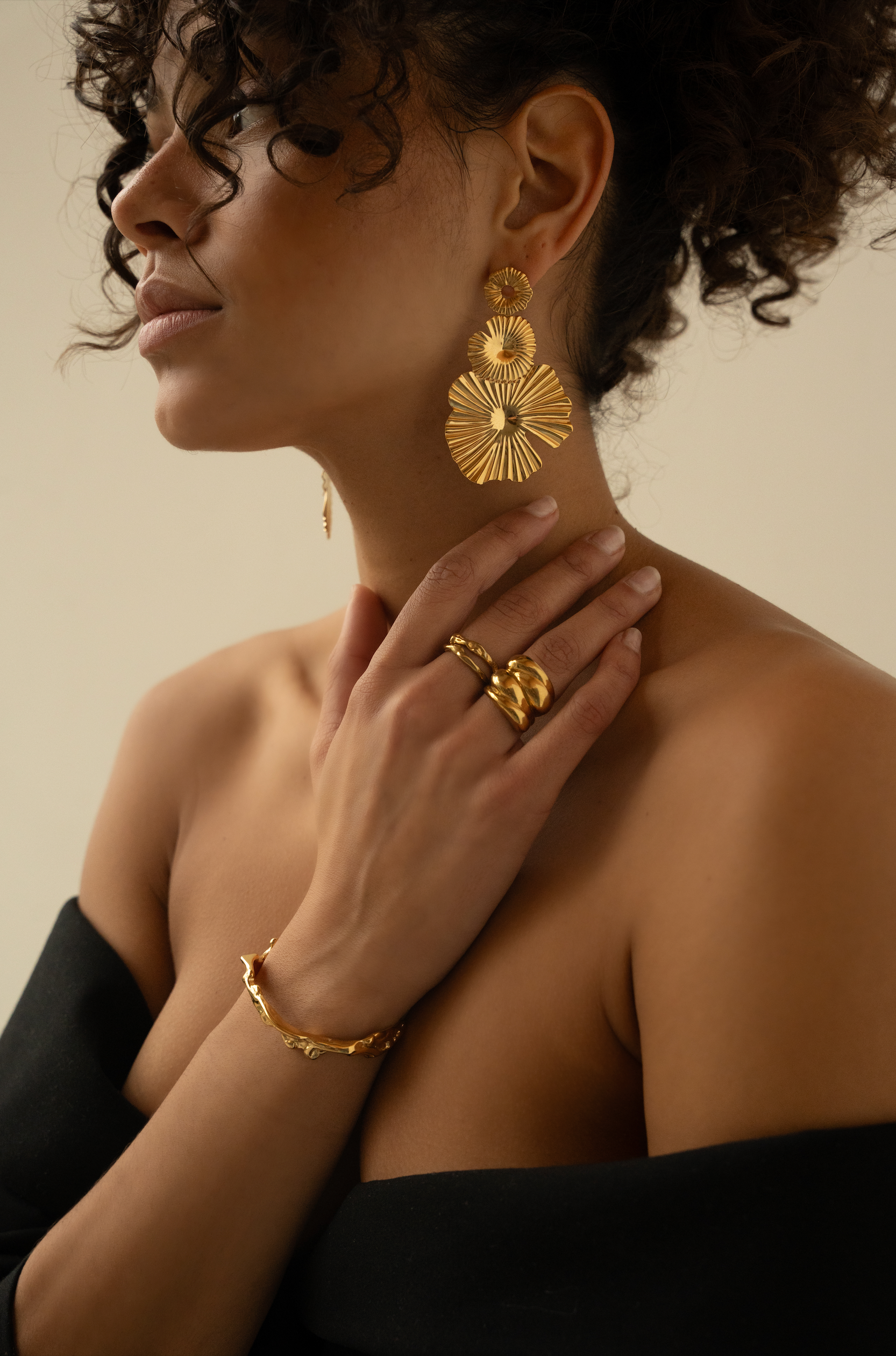 Crafted with care, the Sakae Earrings are made from stainless steel with 18k gold plating, ensuring durability and a luxurious finish. They're lightweight and waterproof, offering effortless comfort and style whether you're celebrating indoors or braving winter festivities outside.