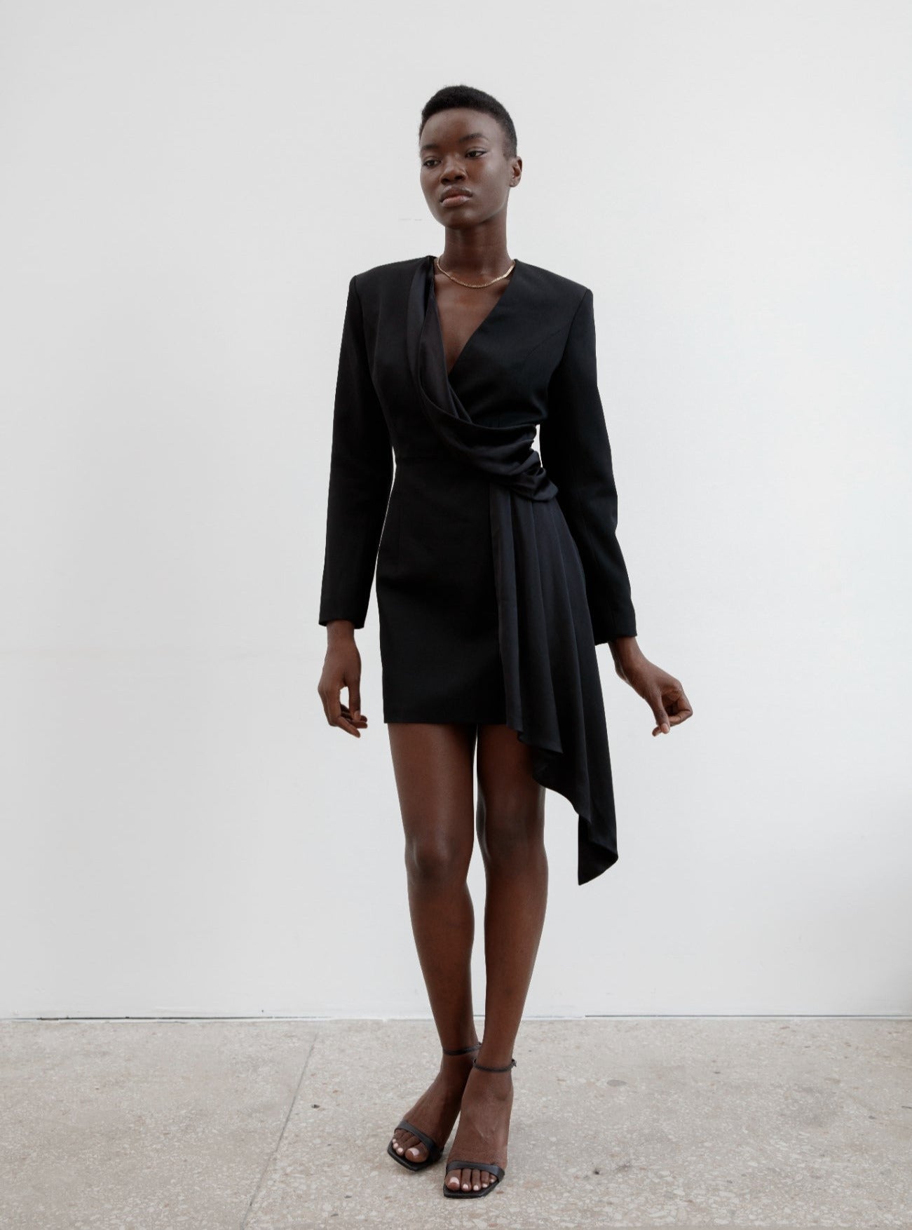 - Fitted silhouette, asymmetrical front, shoulder pads