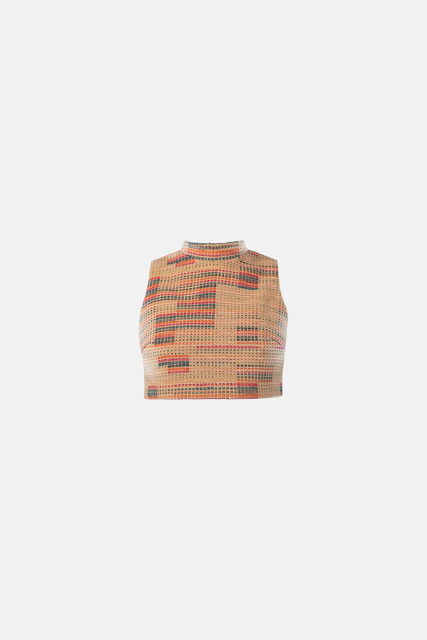 Sleeveless top with halter neck. Made of tweed jacquard with multicolor threads and silver micro sequins and cady stretch champagne lining. 100% Made in Italy.
