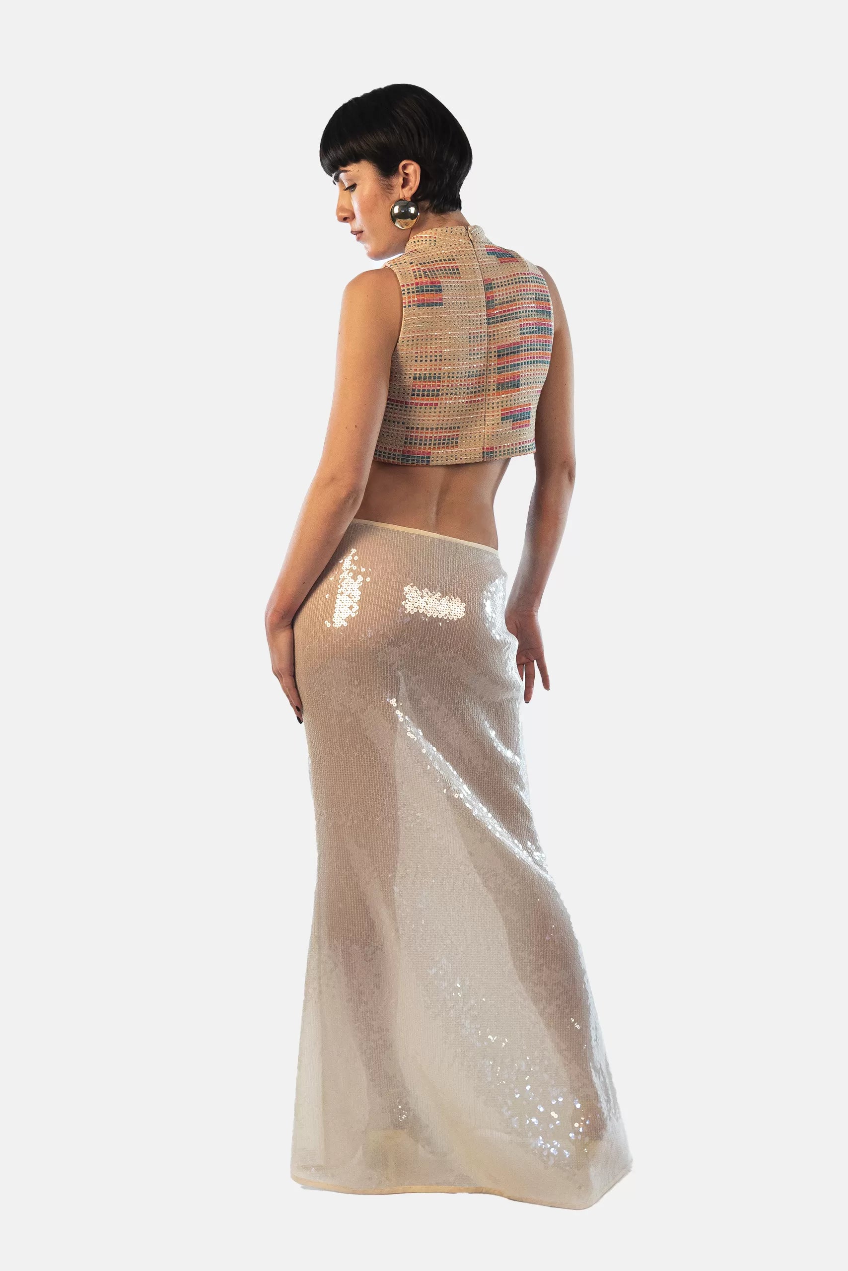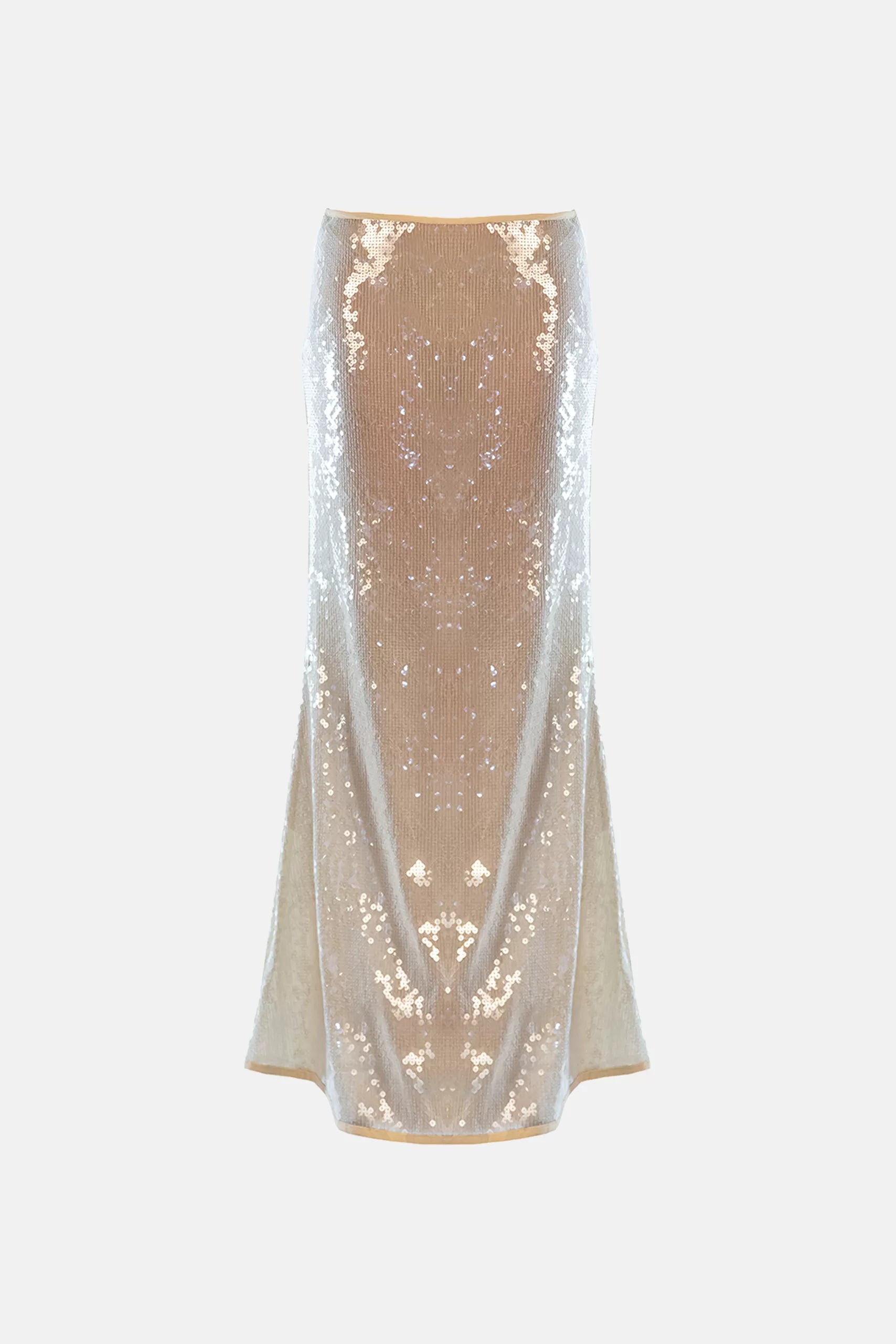 Low-waist long mermaid skirt. Made of see-through sequins on nude pink white stretch tulle. 100% Made in Italy.