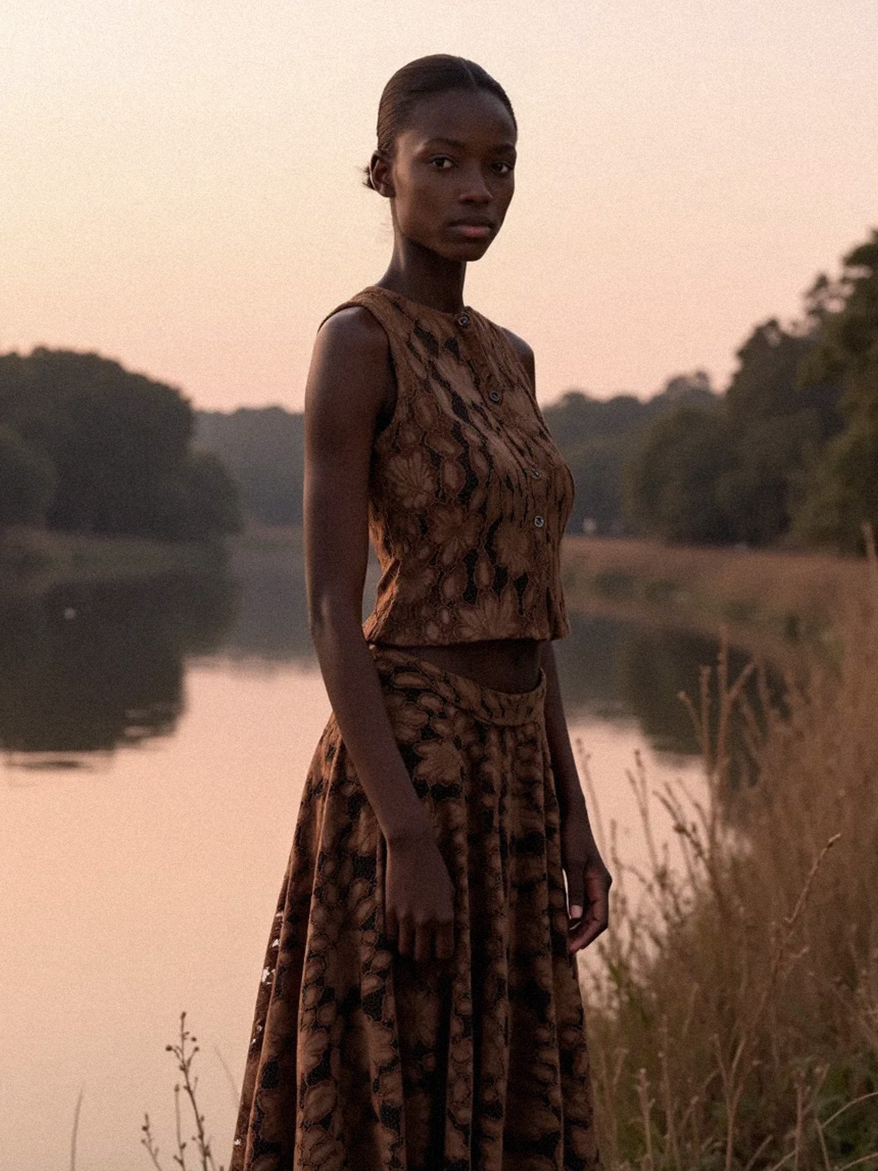 Top marrón sin mangas en tejido de encaje con detalle de terciopelo. Silueta ajustada. Cierre mediante botonadura central.
