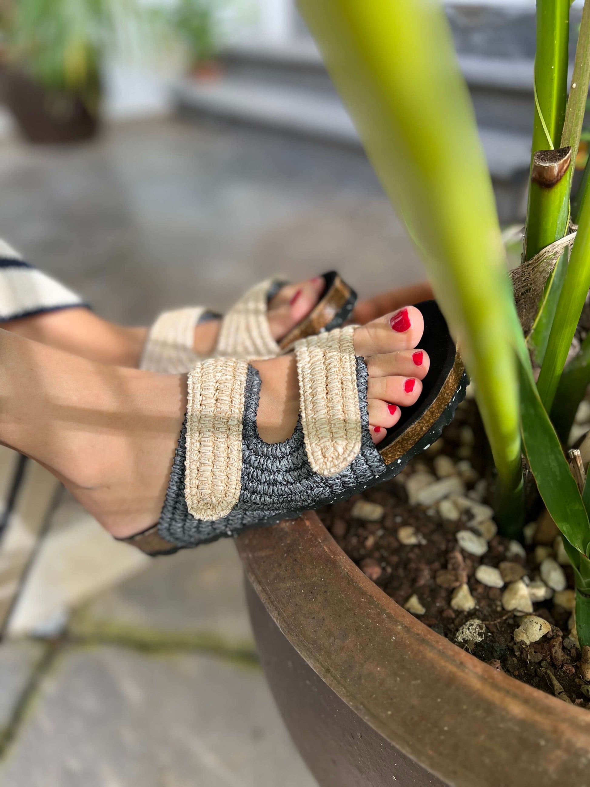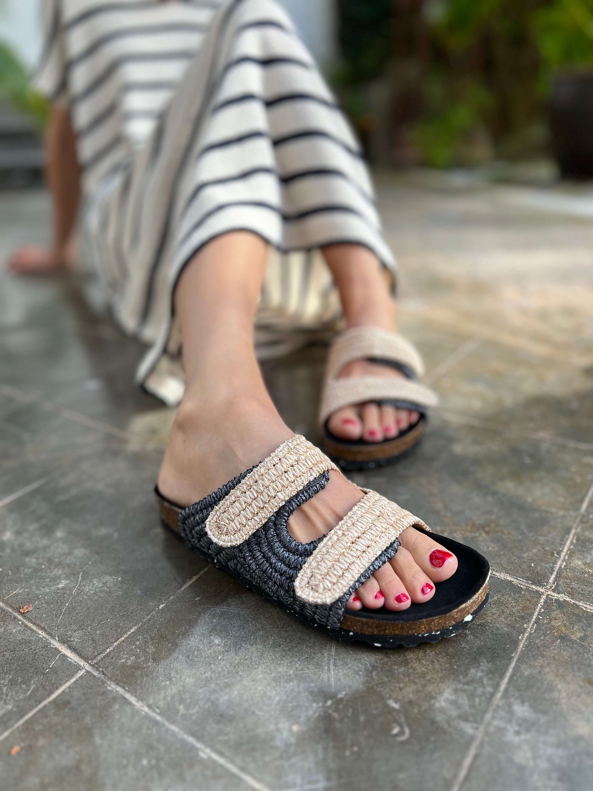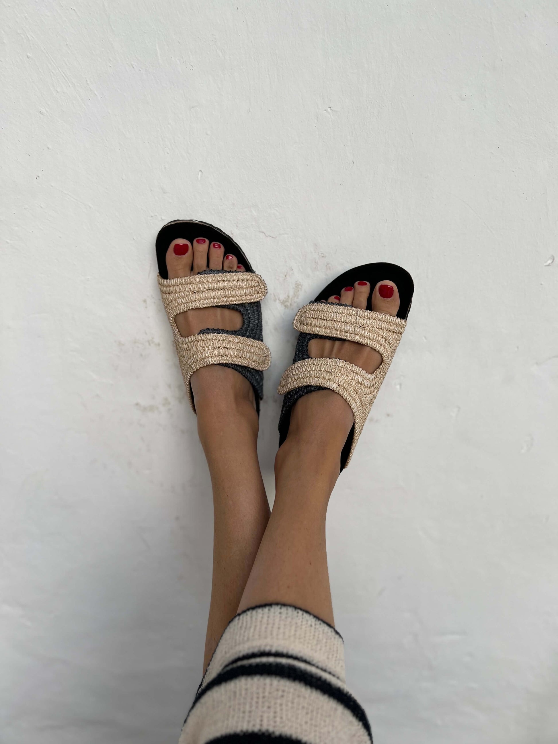 Estas sandalias están inspiradas en los Pueblos Bonitos de España. Combinación elegante de colores: natural y negro. Corte de rafia 100% natural y planta anatómica súper cómoda y blandita. El cierre es con velcro para ajustarlas cómodamente.
