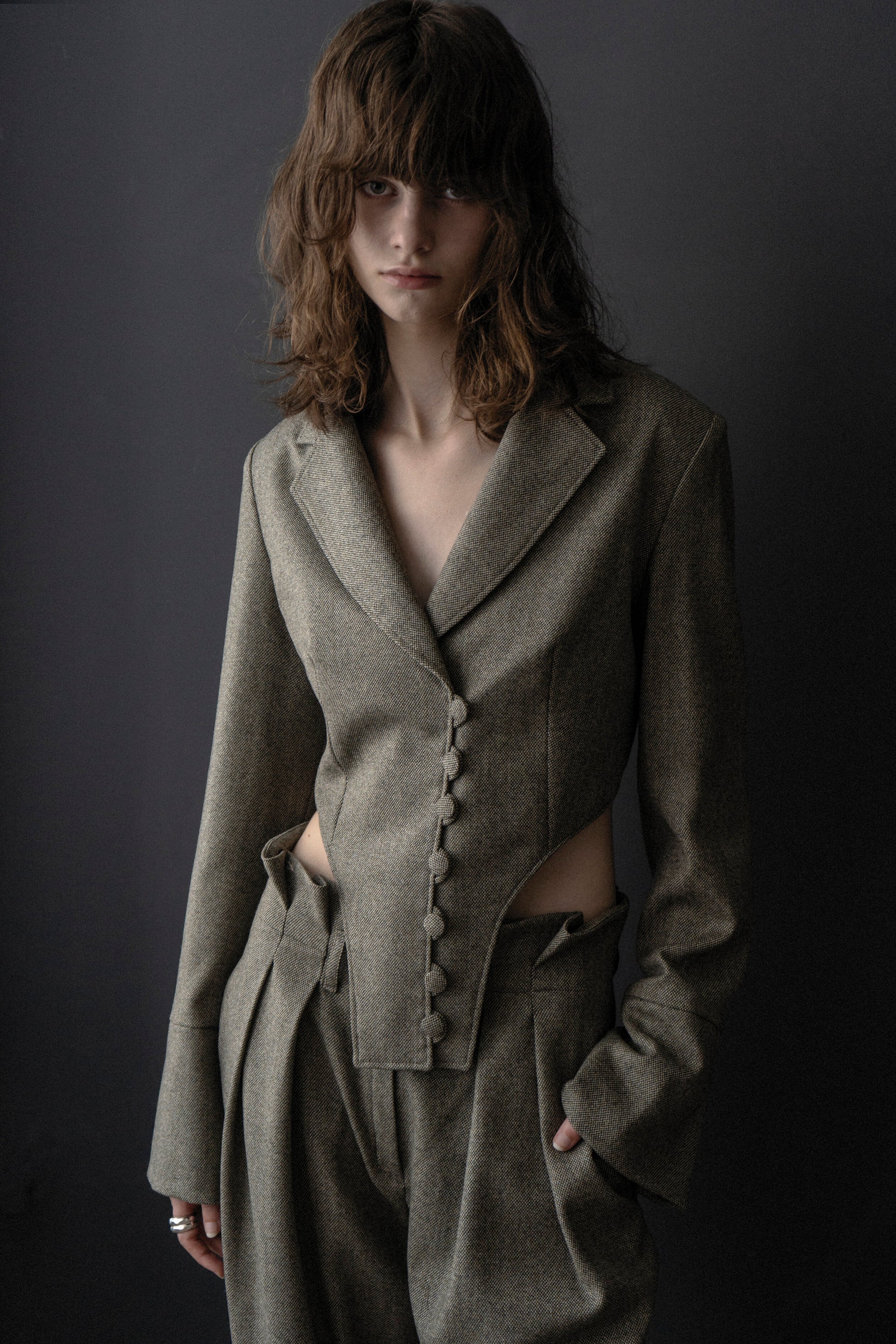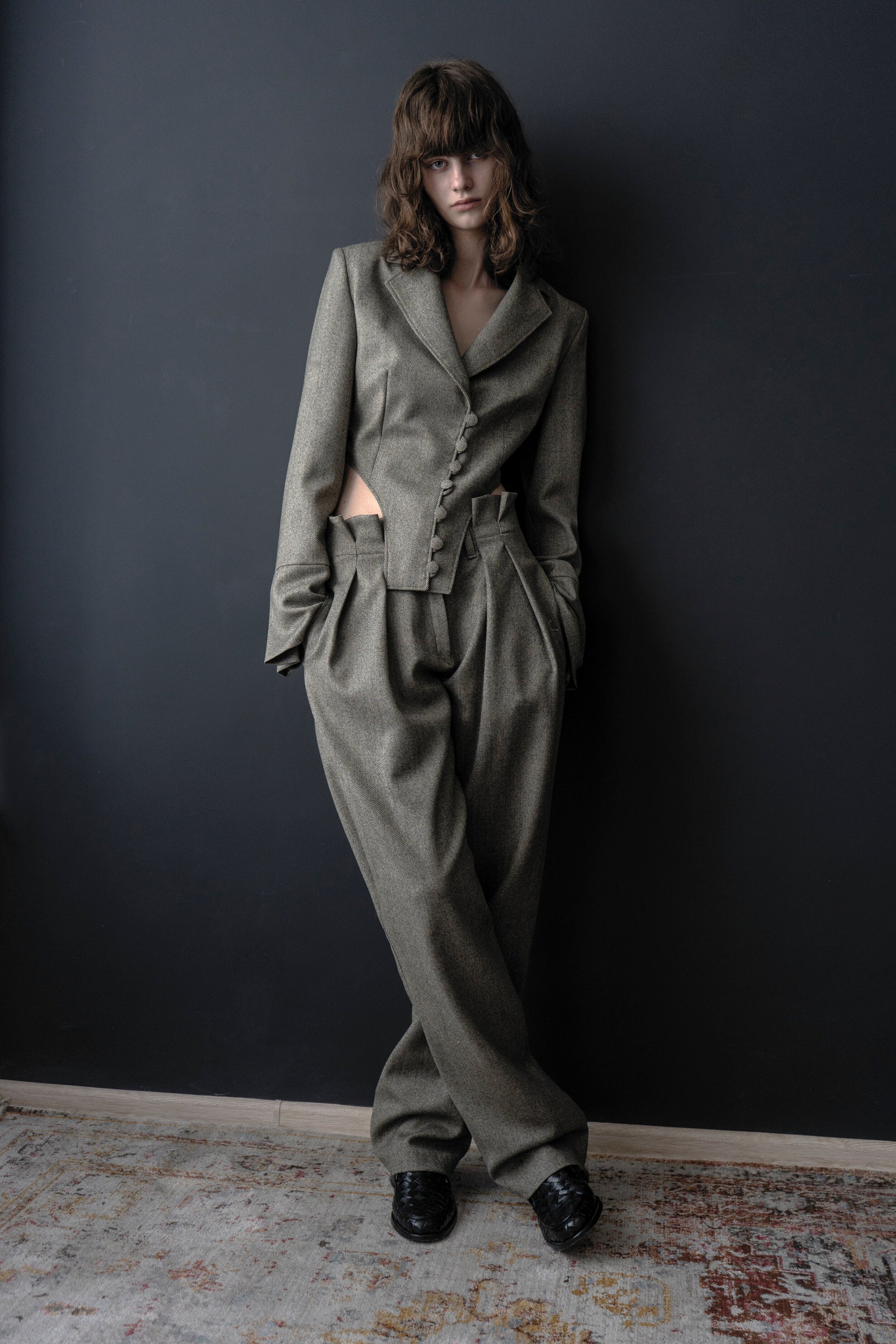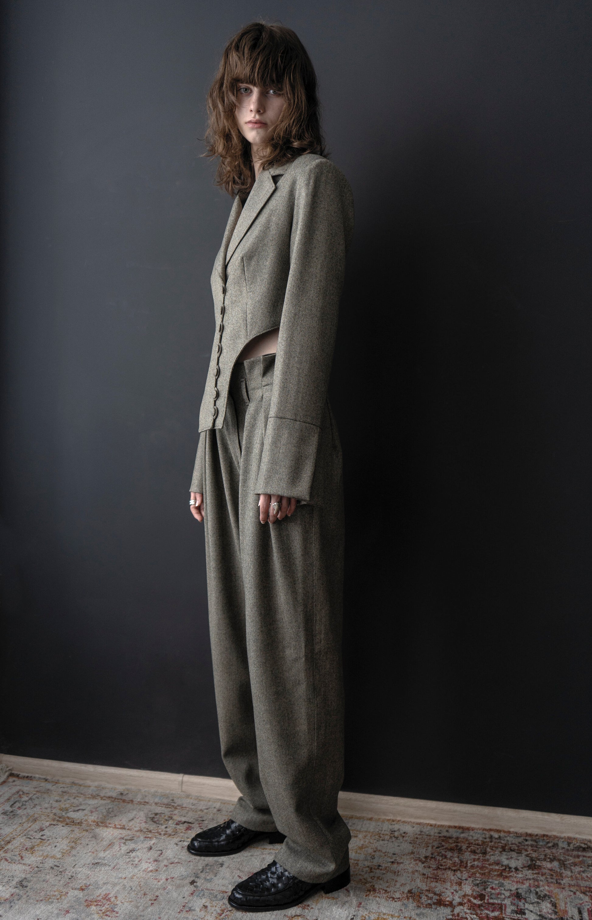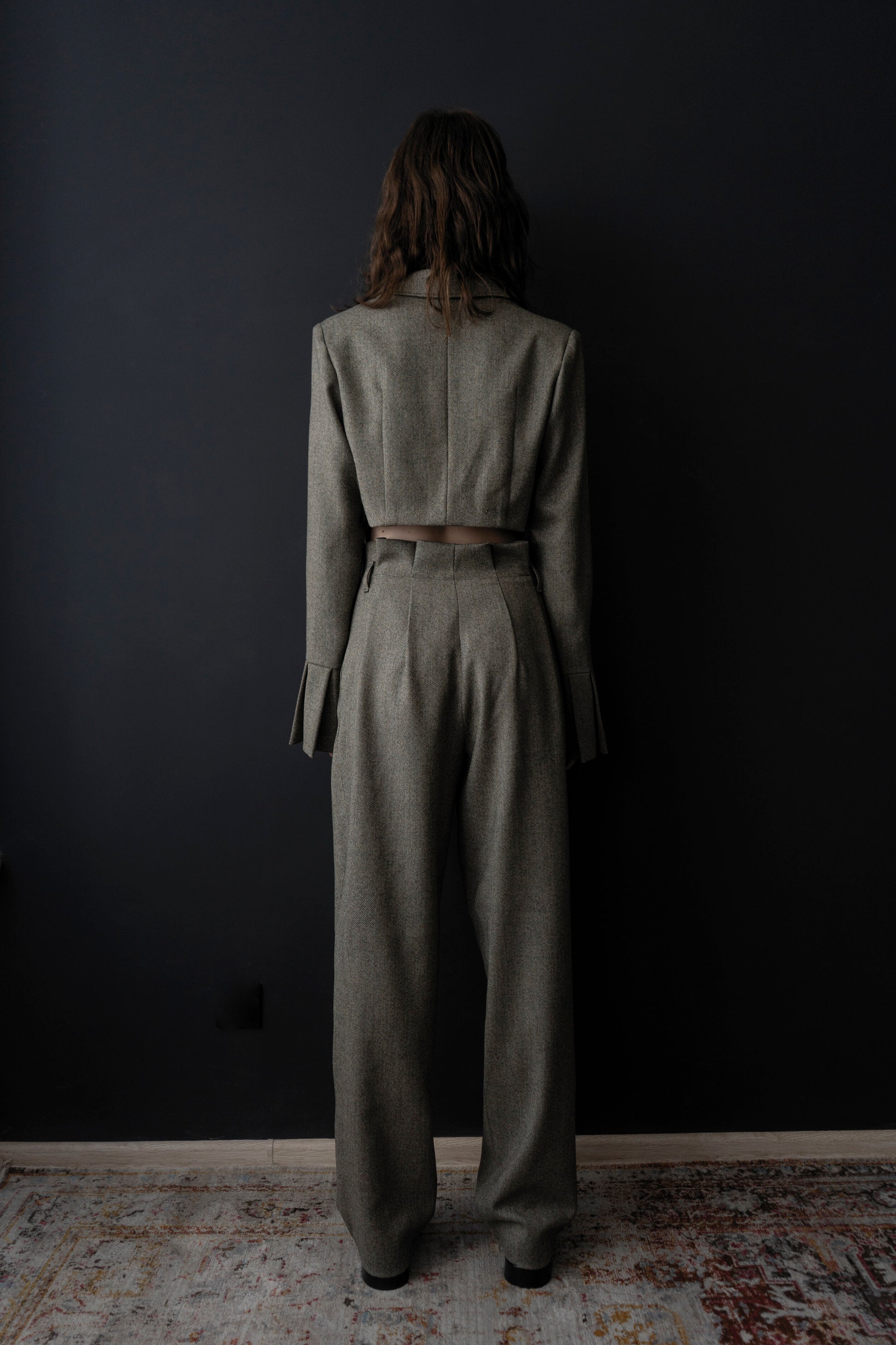 A double-breasted style imagined in a tweed Italian-made wool, this elegant wardrobe blazer is fully-lined and features two side openings and lined buttons detail. Contemporary yet feminine, the Tweed High Waisted Trousers are a wide-leg trouser with pleat front detail and slant hip pockets. Style with flats to achieve an effortless ensemble.
