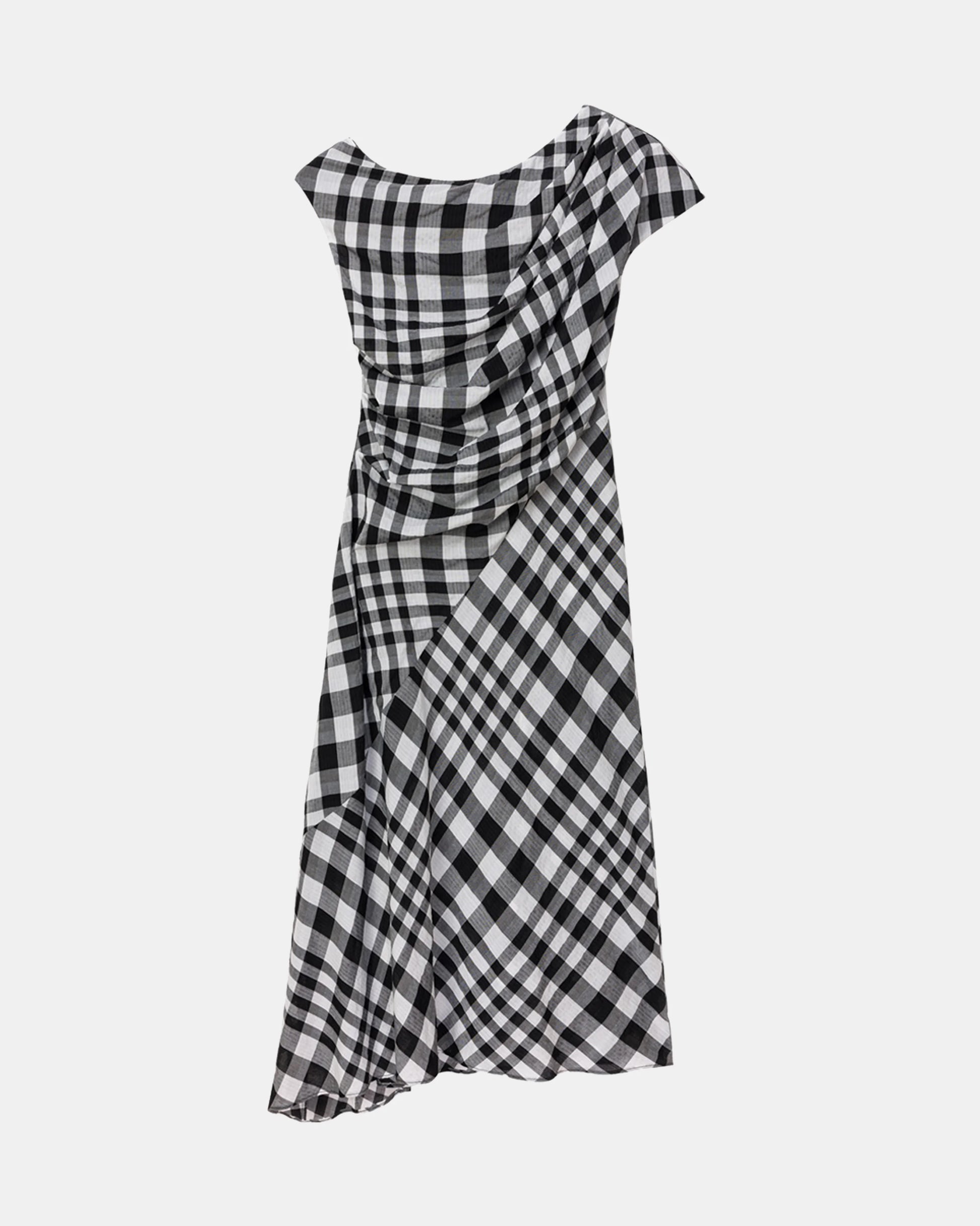 The dress features draping on the sides and shoulders, with the unique touch of asymmetrical dropped shoulders and asymmetrical cut hem. Considering the soft texture of the dress fabric, we're confident this piece will be essential for the summer season. There are two different color options available.