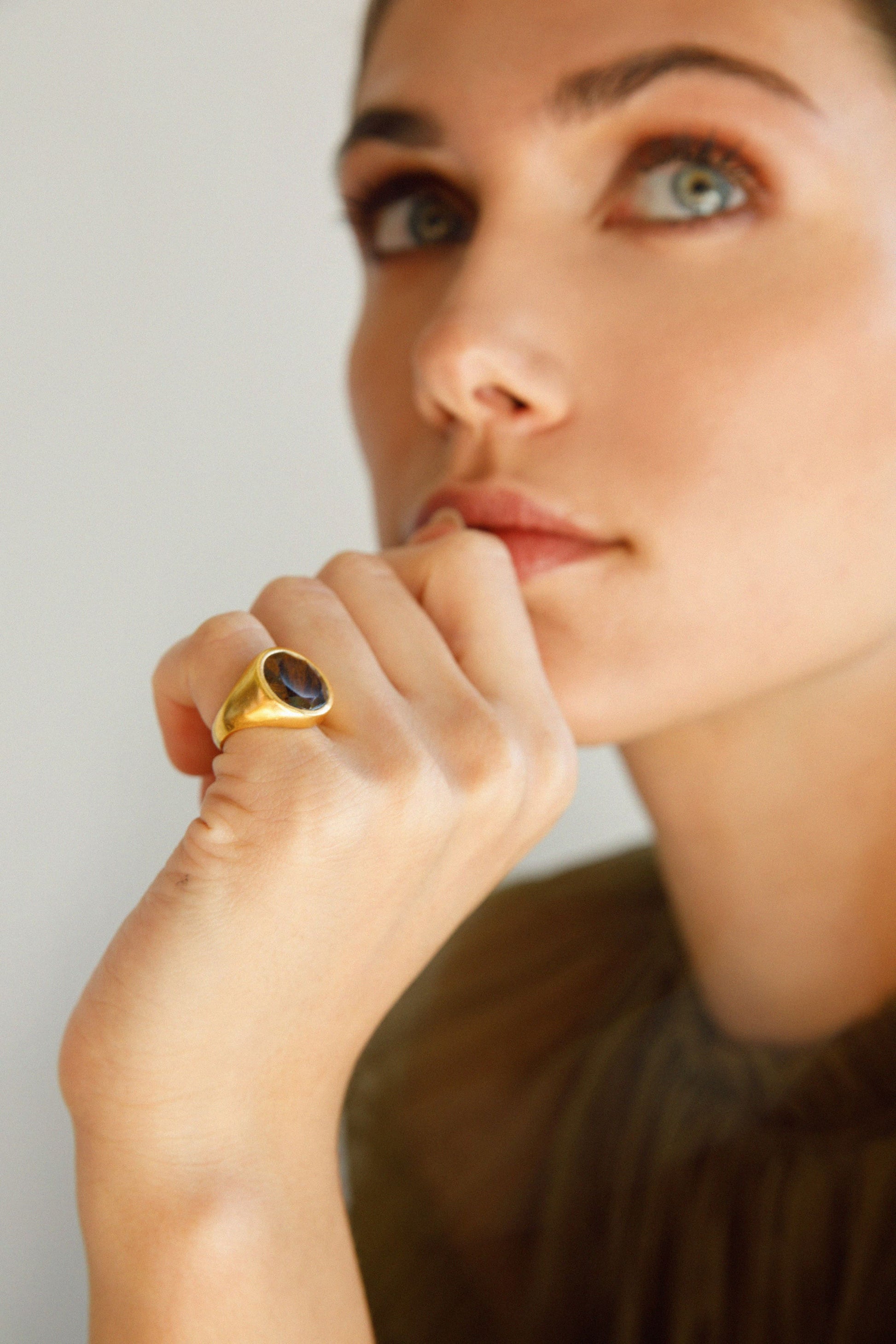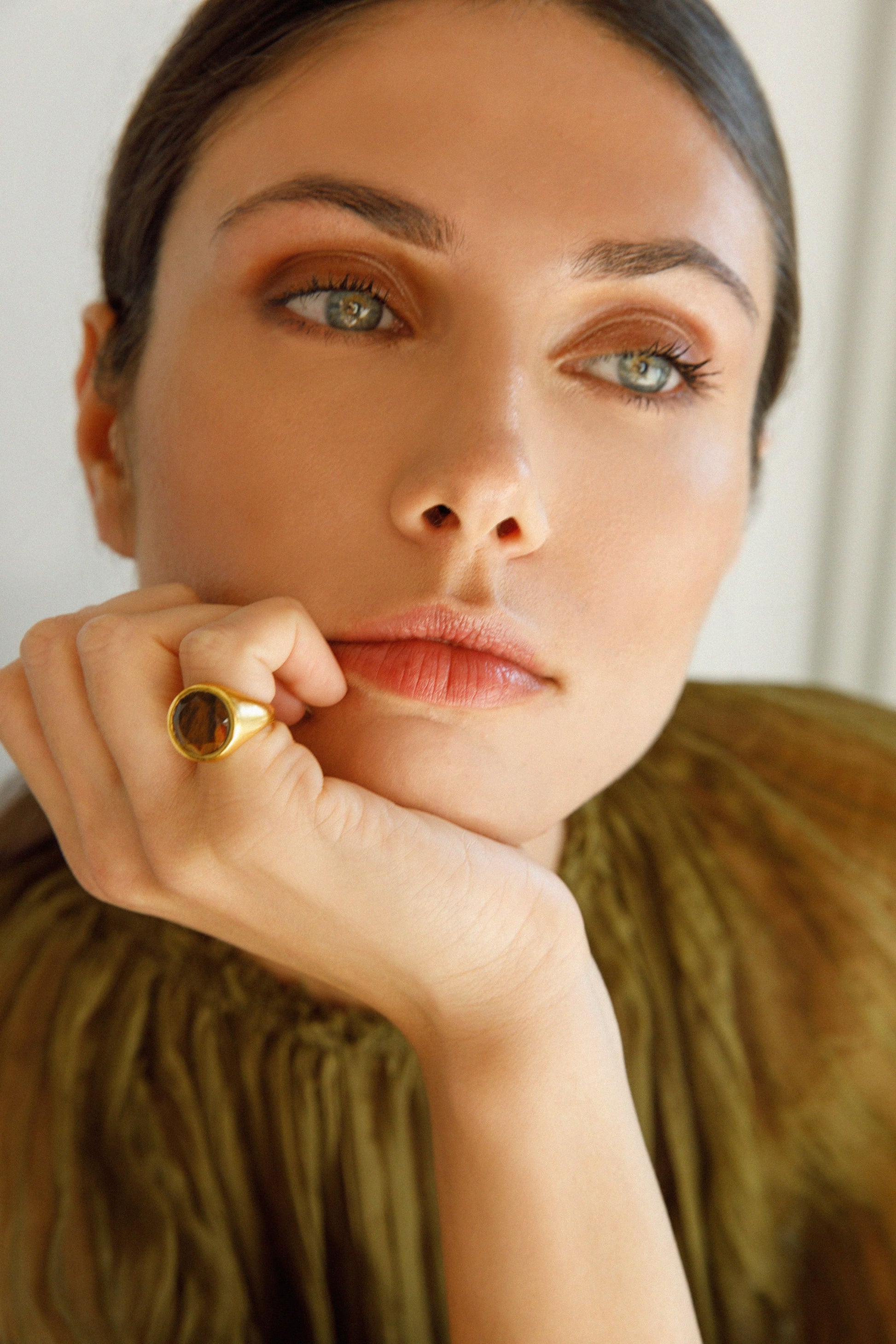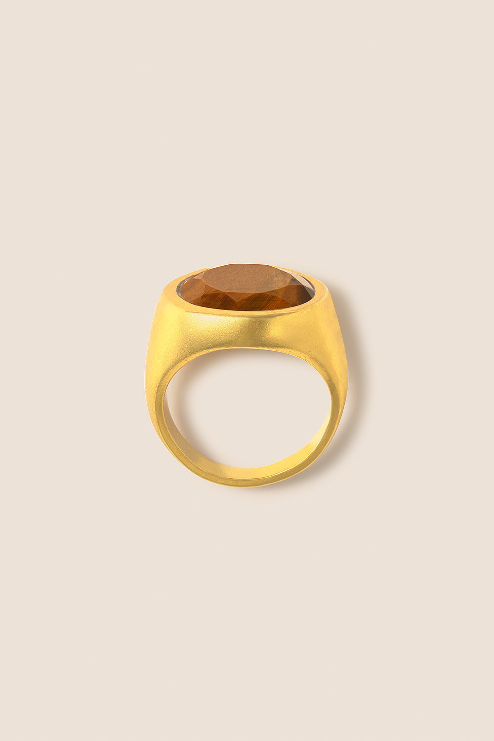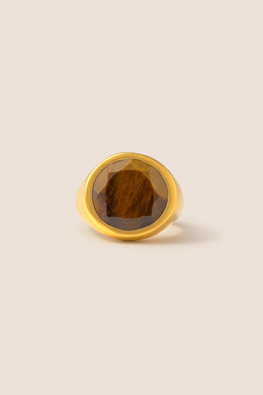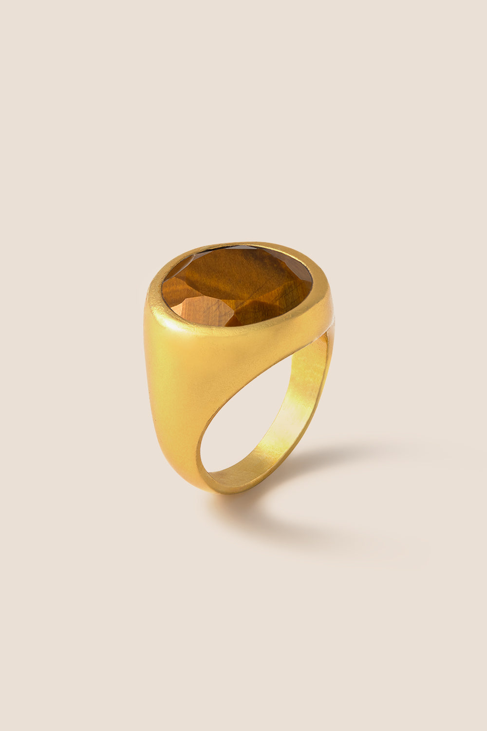 El anillo Lia tipo sello redondo con piedra natural ojo de tigre considerada la piedra que atrae energías positivas , riqueza y buena suerte . El anillo Lia es una declaración de estilo y elegancia, combina el minimalismo con la energía mística de la piedra natural de ojo de tigre. Este anillo es un reflejo del universo en tus manos. Disponible también en talla 6 para dedo meñique.