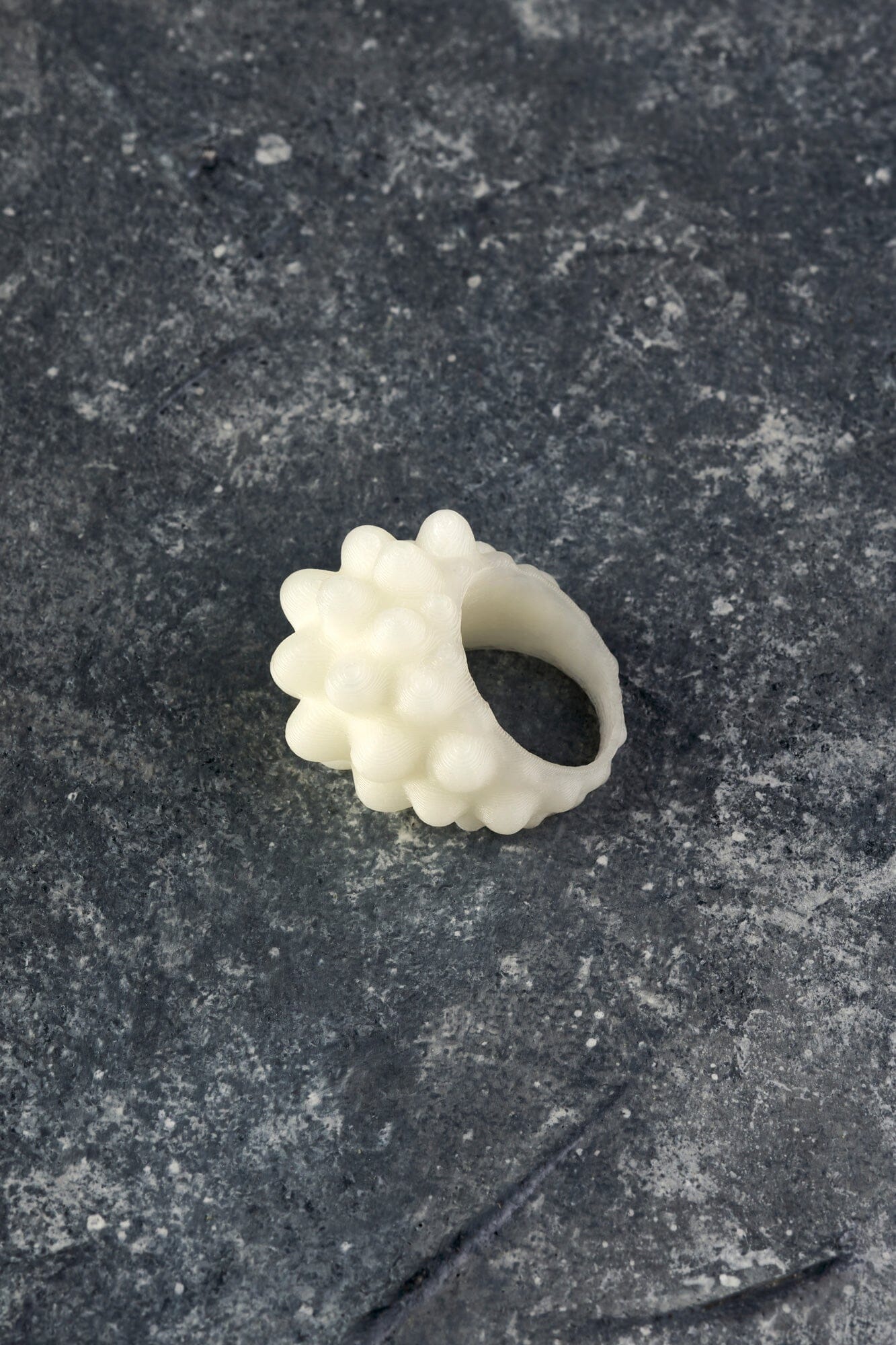 Escultor marino que a través de la adaptación al medio genera obras de arte que solo la naturaleza puede ofrecer. El anillo está modelado e impreso en 3D con material de origen vegetal y residuos de cáscara de vieira, además de llevar un postprocesado artesanal de lijado y barnizado a mano.