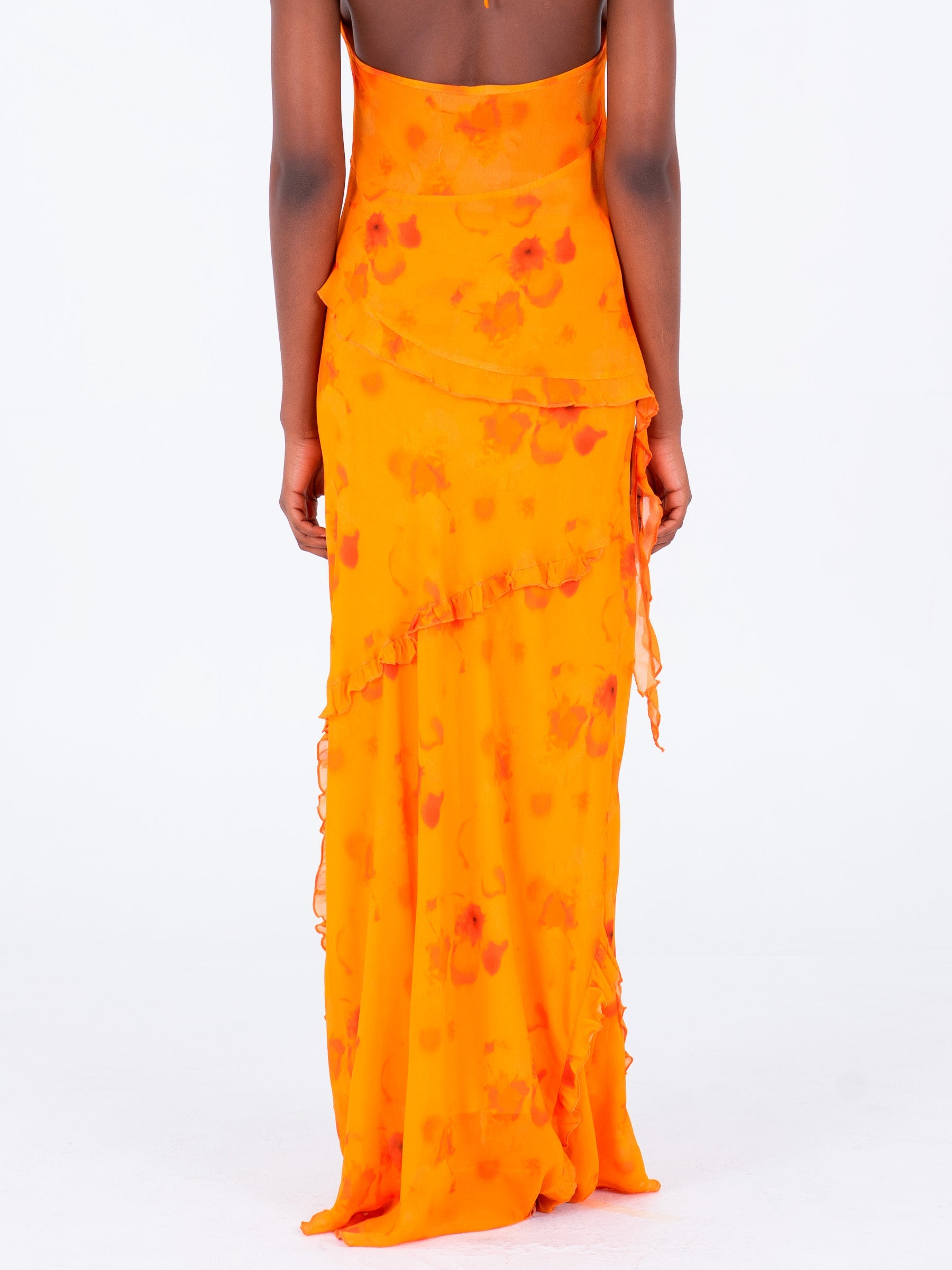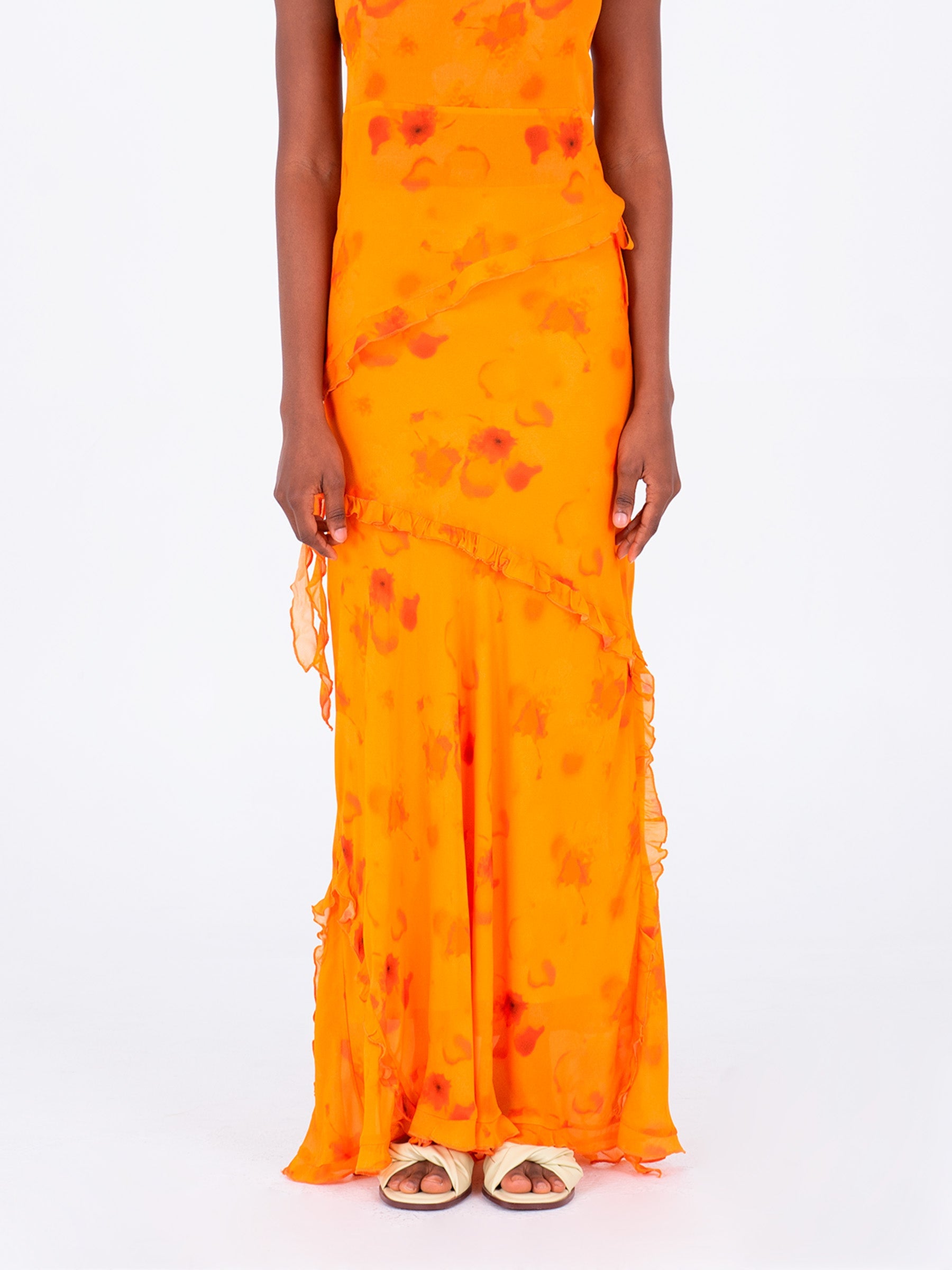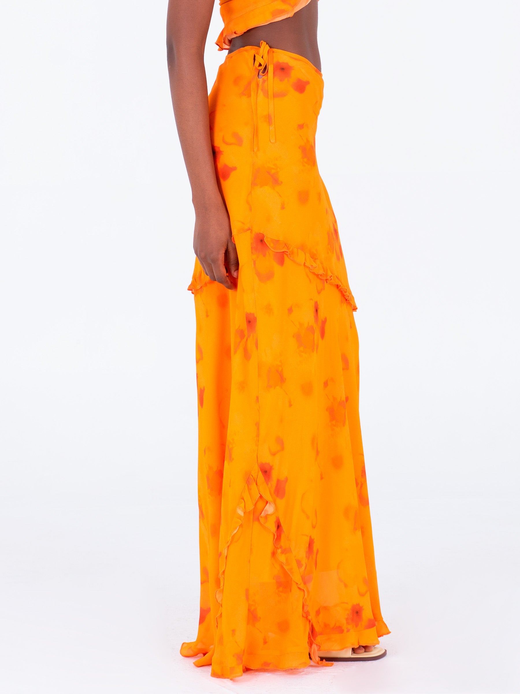 Falda larga de tiro bajo con volantes decorativos. Ajustable por las tiras laterales.