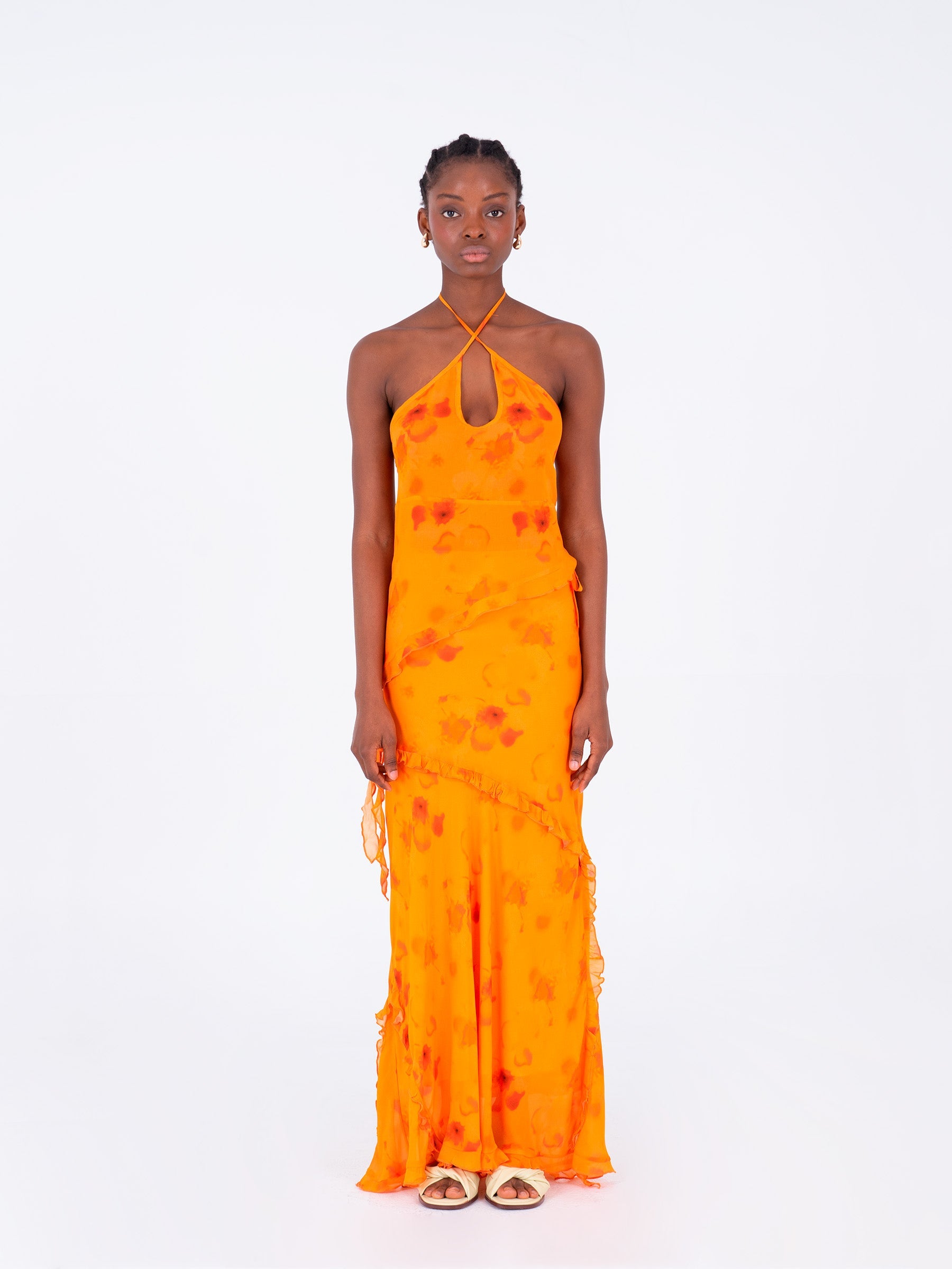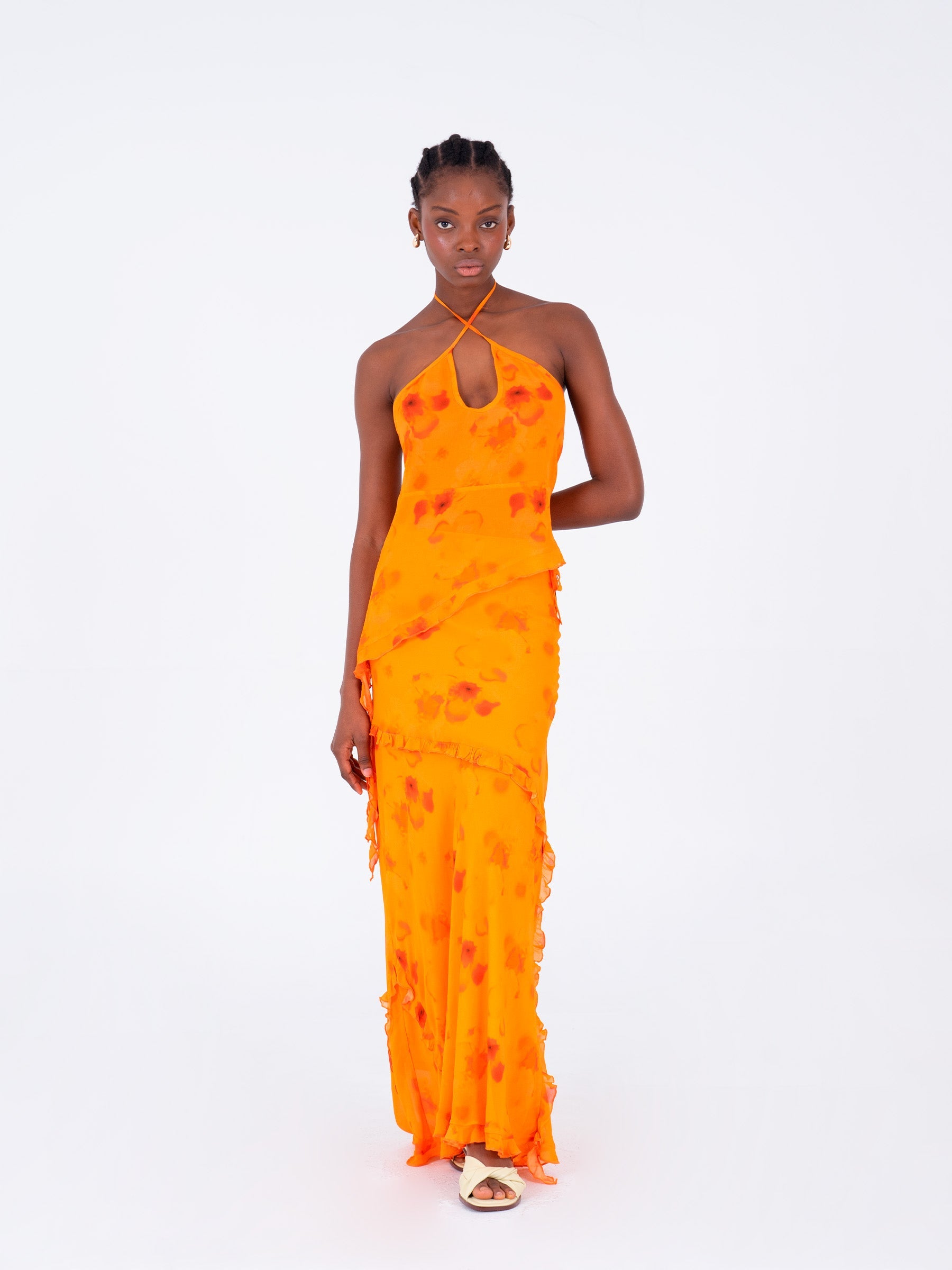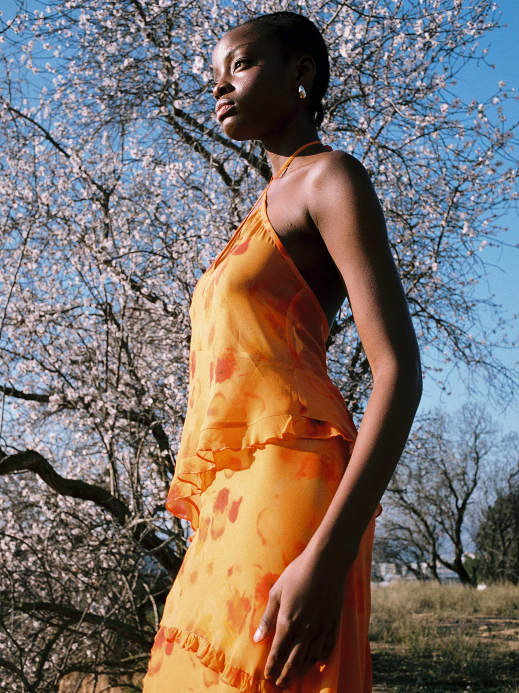 Falda larga de tiro bajo con volantes decorativos. Ajustable por las tiras laterales.