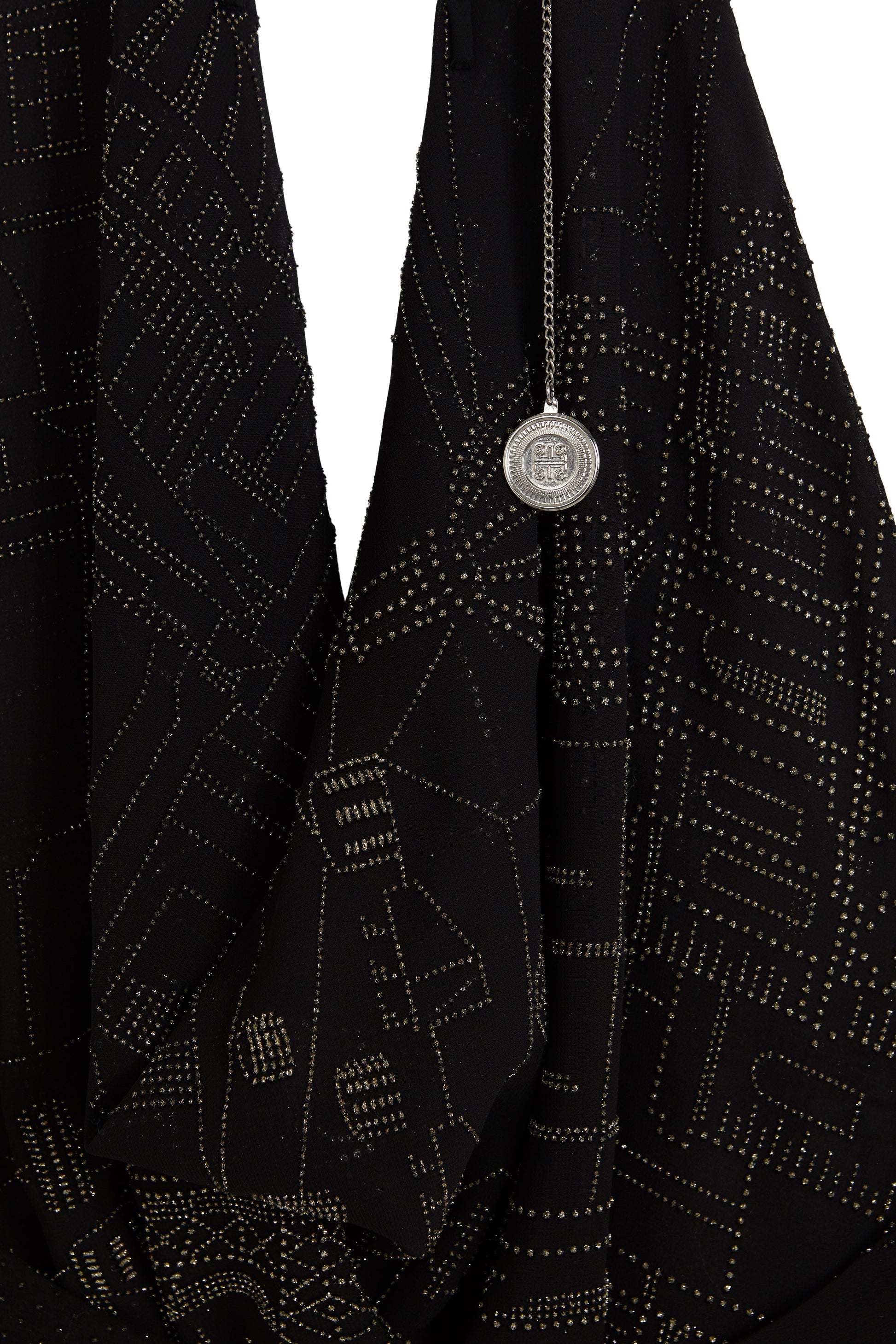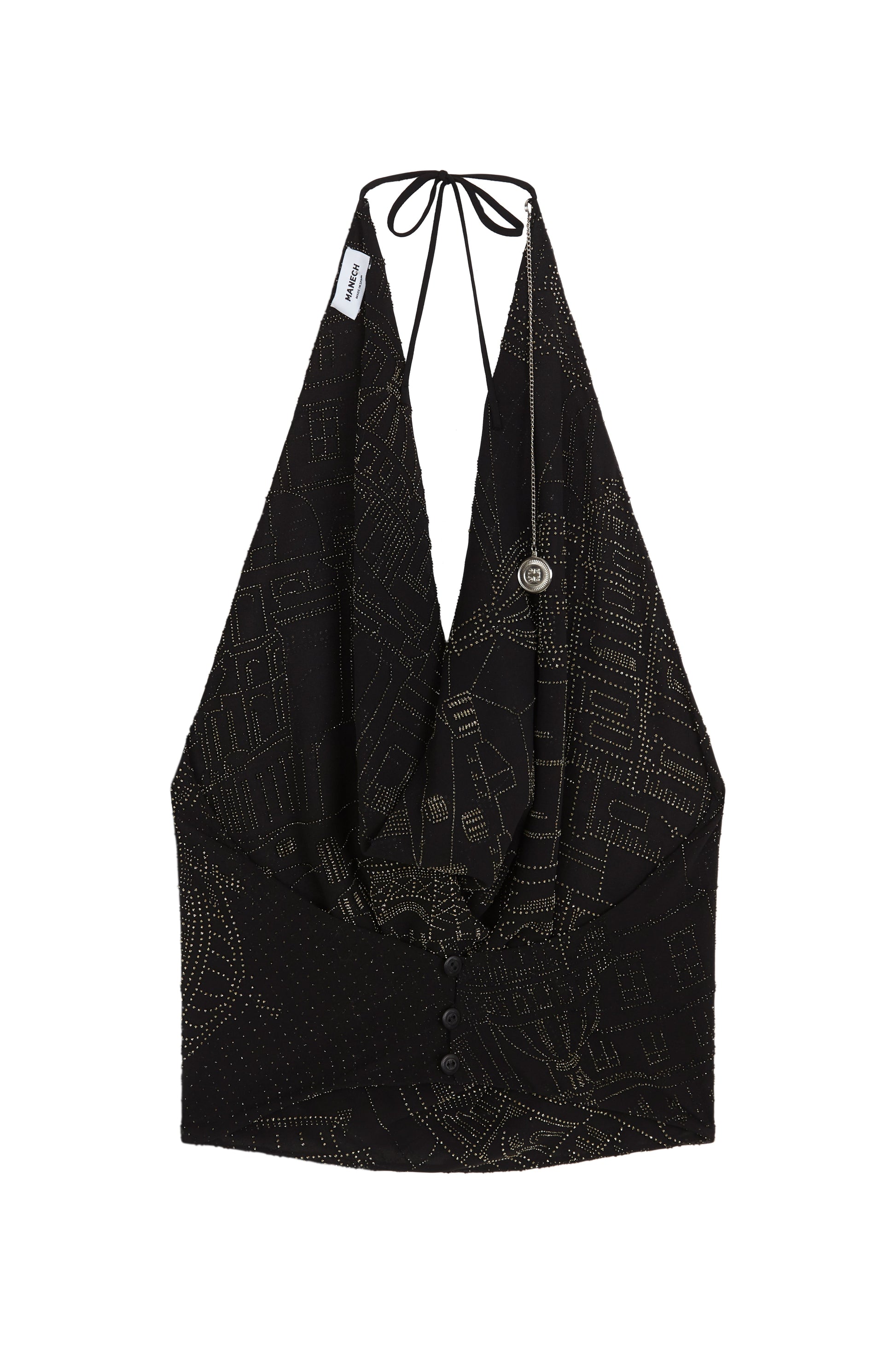 A halter top with a draped neckline, back button closure embossed with the brand's logo, and an open back. Made of black chiffon with a black flocked print sealed in silver glitter. The back features our hanging chain embossed with the brand's iconic logo.