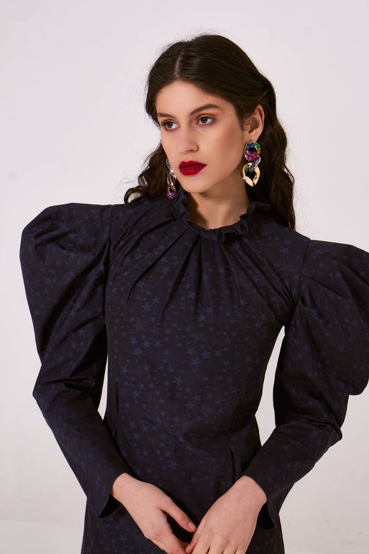 Jacquard midi dress with puff-shoulder sleeves