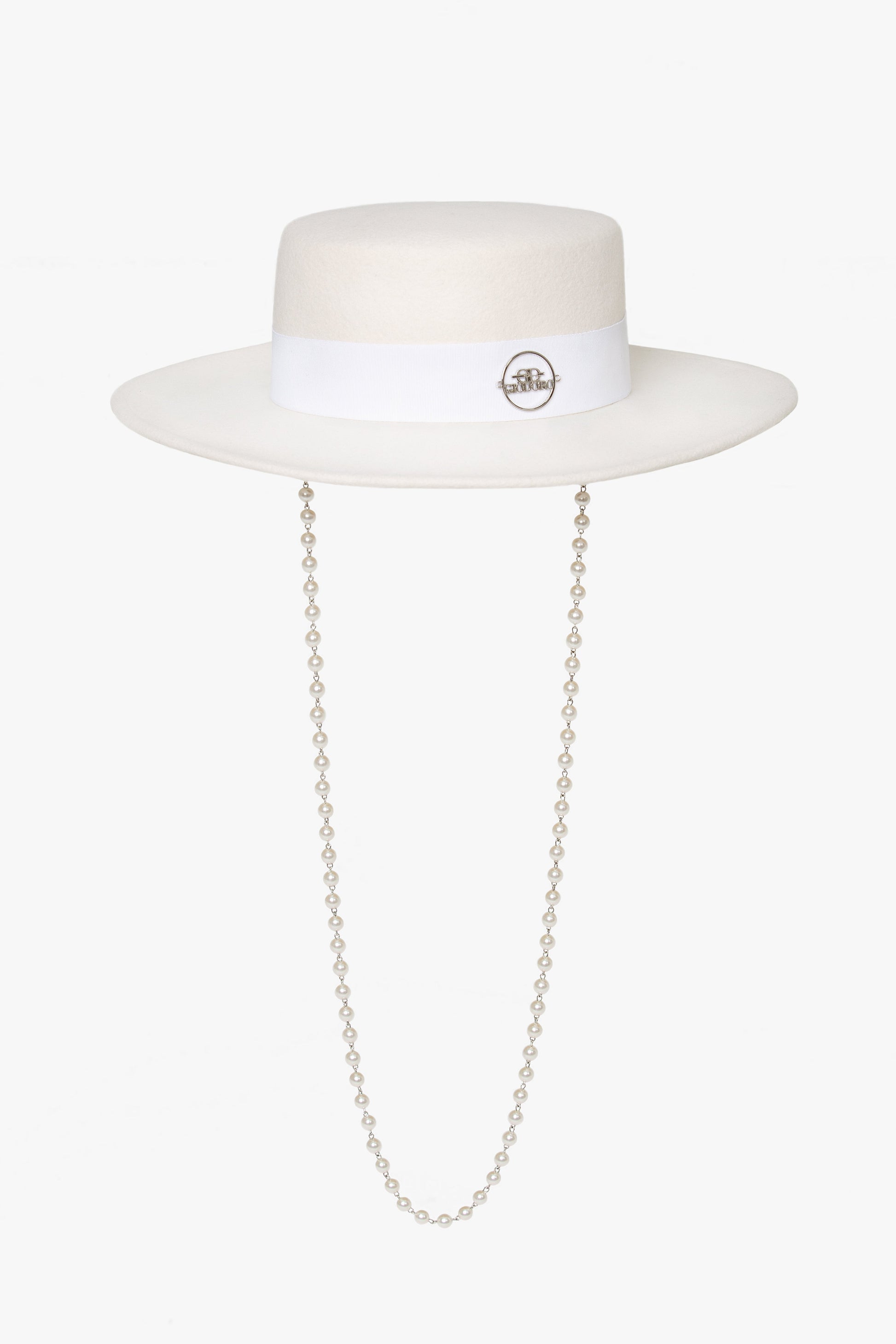 Elevate your sense of elegance with Giodoro canotier hat in luxurious white felt, adorned with a chic grosgrain ribbon—a seamless blend of sophistication and style.
