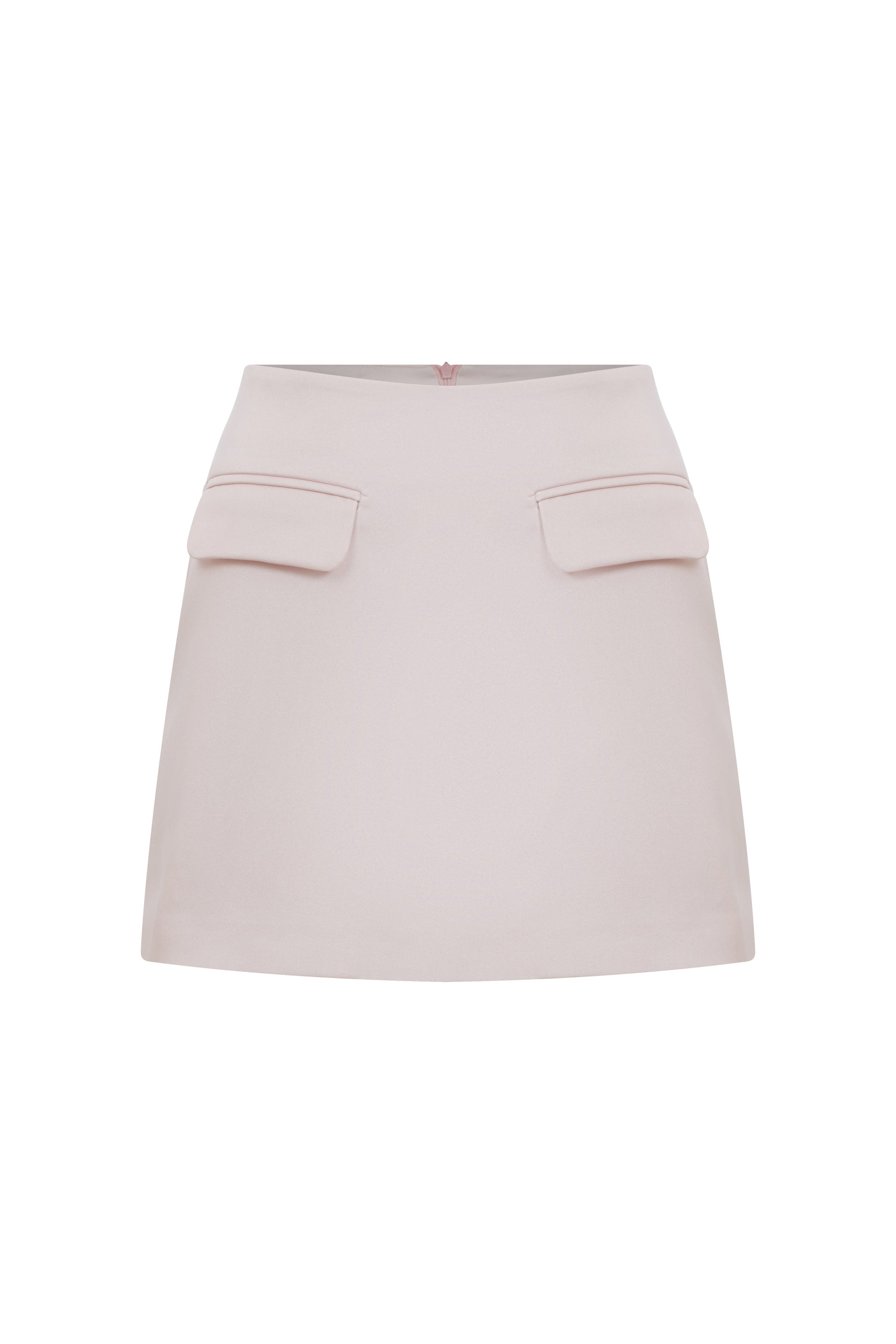 The Marde A-Line Skirt features stylish patch pockets and is crafted from soft matte satin, lined with silky satin for a luxurious finish. With a mid-waisted cut, this skirt offers a flattering silhouette and pairs perfectly with the Elodie Blazer in cloud pink for a coordinated and elegant look, suitable for any occasion.