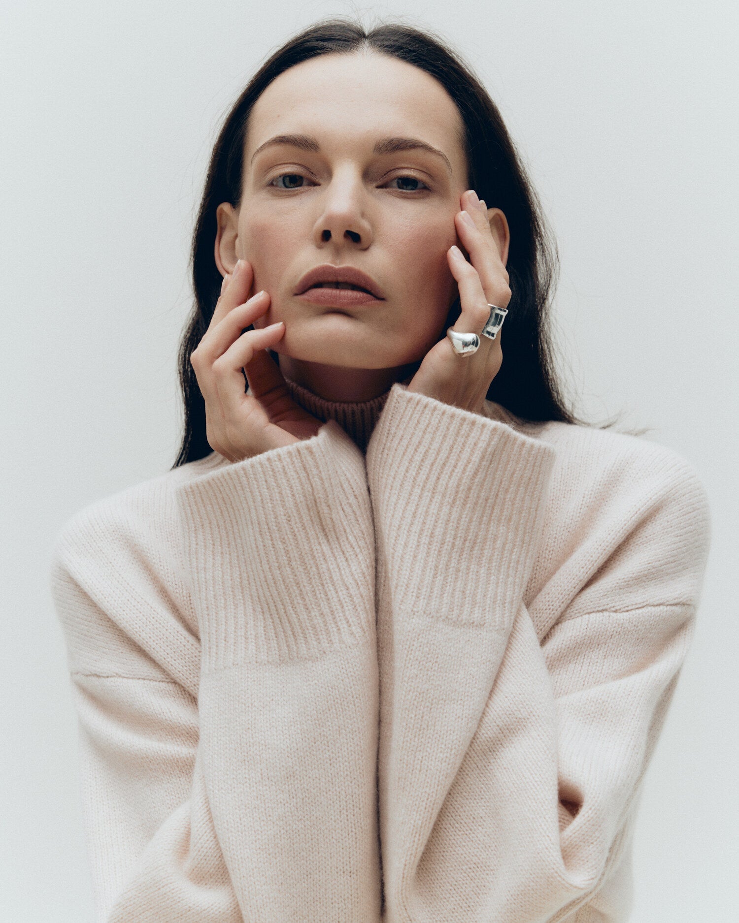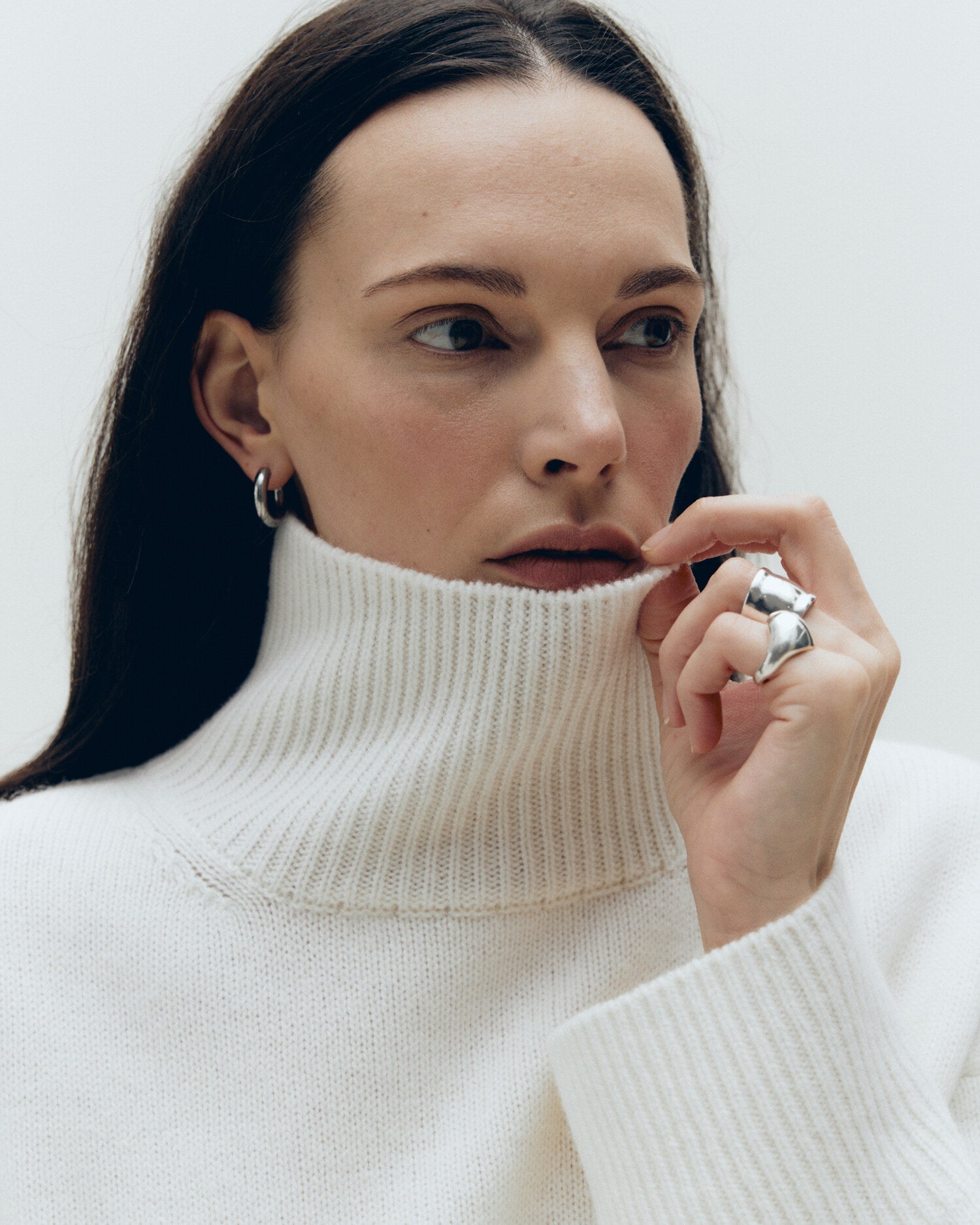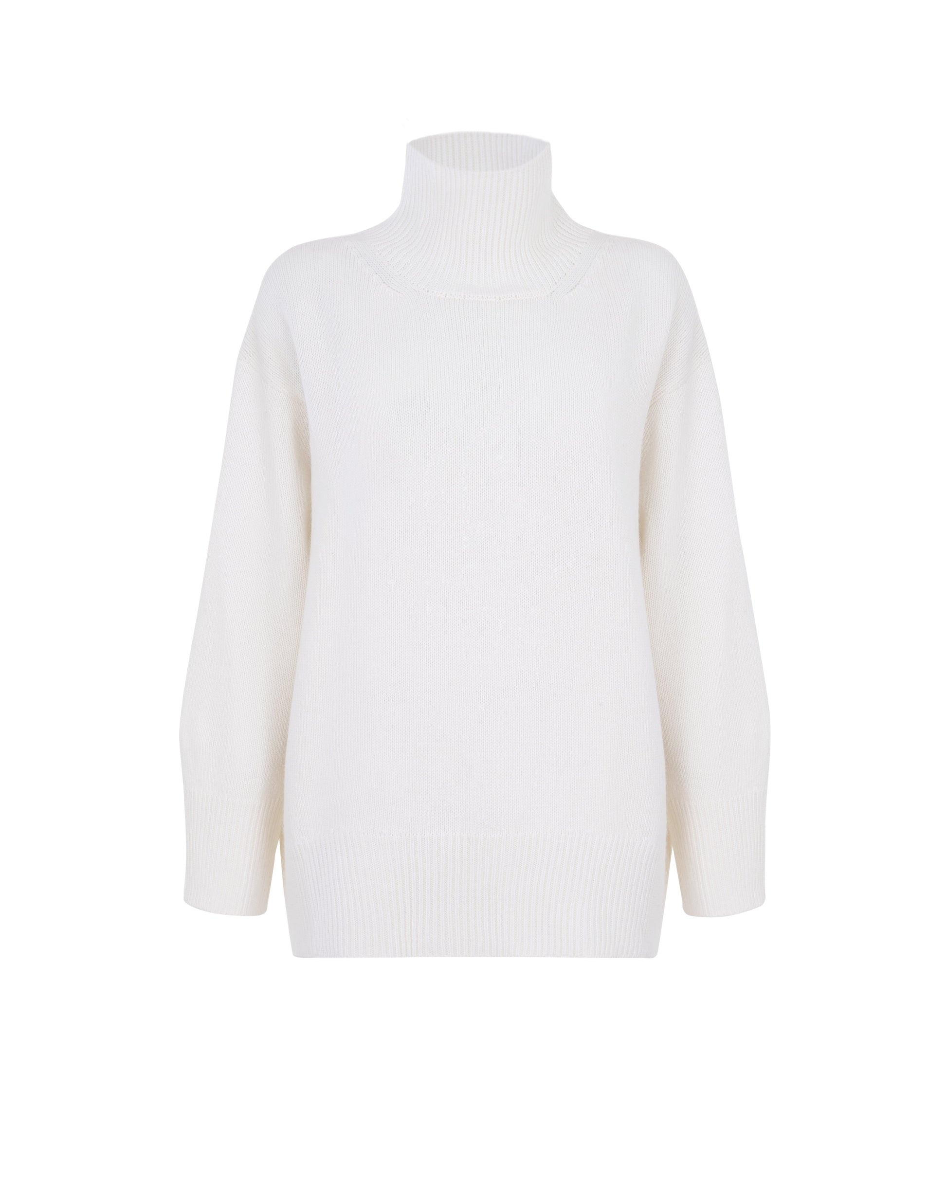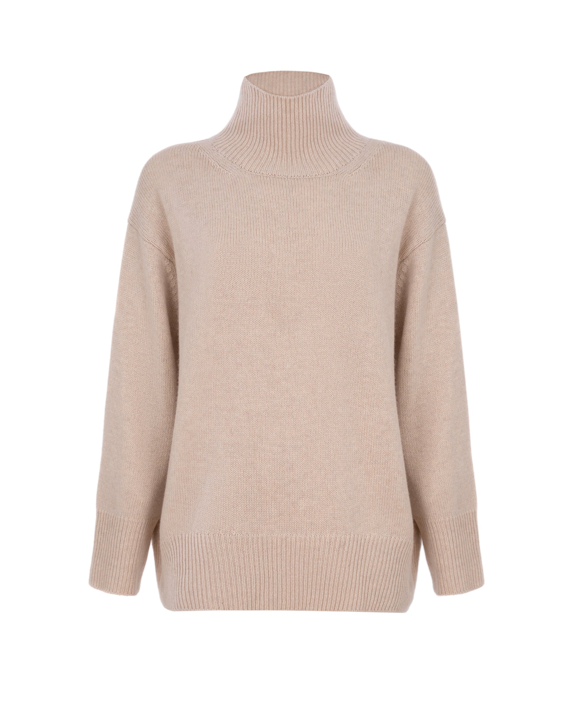 Loose fit sweater with high neck. Not to give in to 100% cashmere, just pills less and more easy to care.