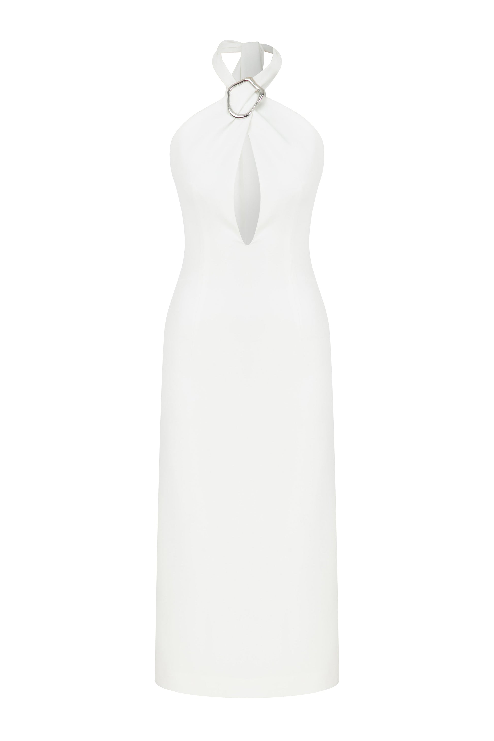 The Viana Midi Dress in Vanilla Ice is sure to turn heads. It is expertly crafted from crepe fabric and is designed with a midi length and straight skirt. Features include a halter neckline and eye-catching neck accessory for a sophisticated look.